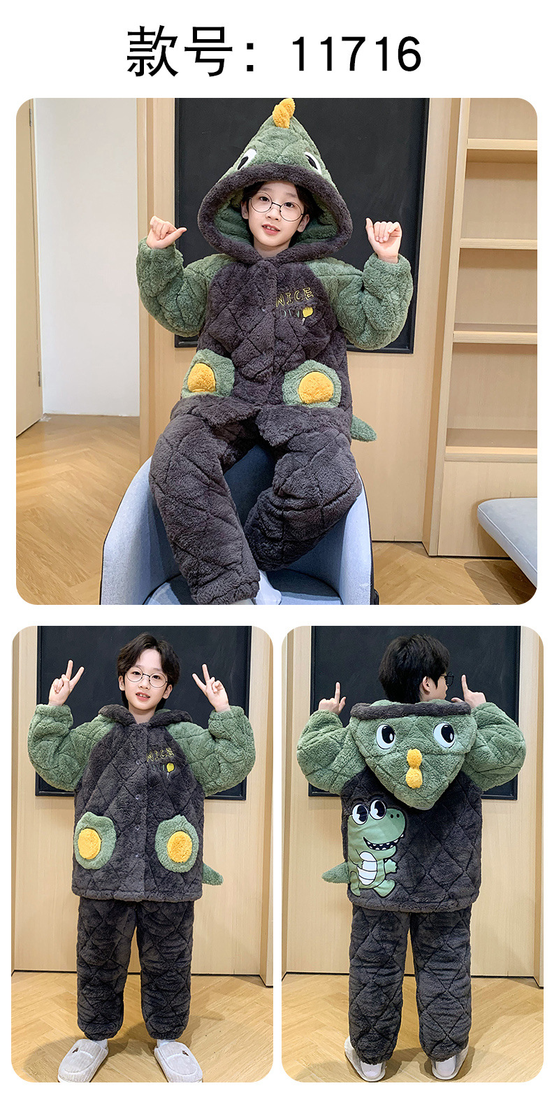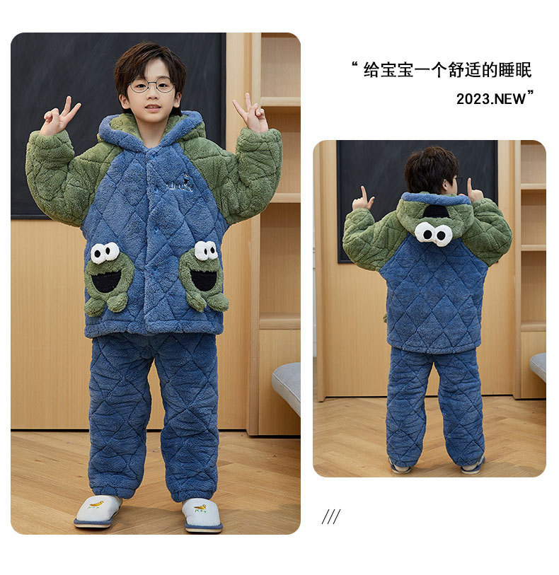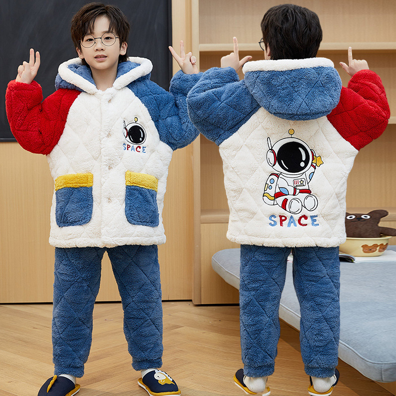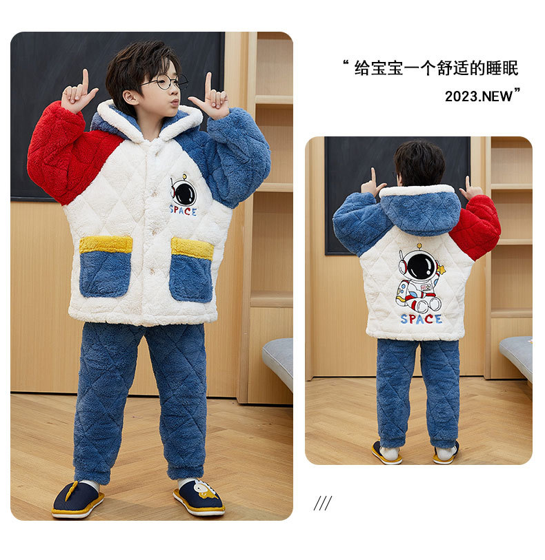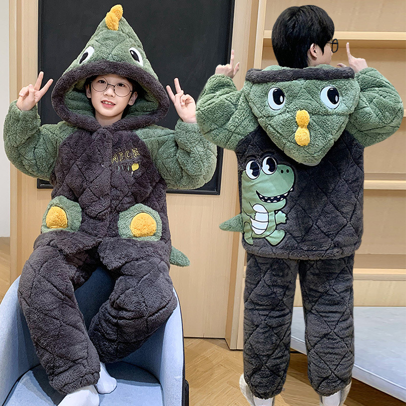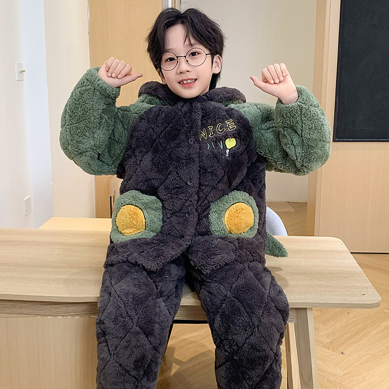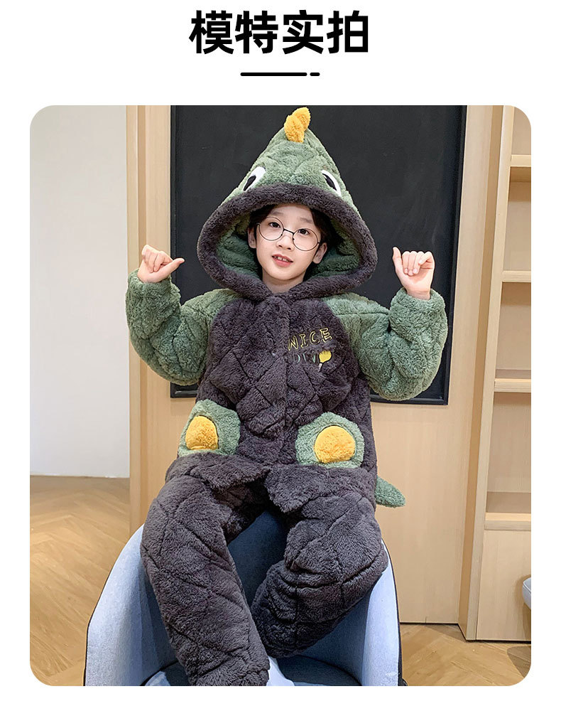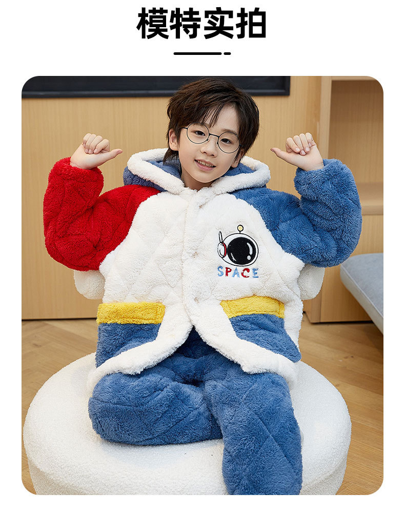 儿童珊瑚绒睡衣男孩冬季三层夹棉加厚款宝宝男童卡通法兰绒家居服