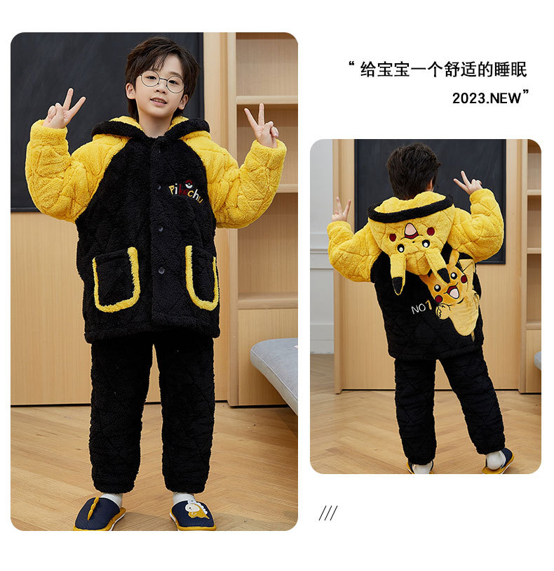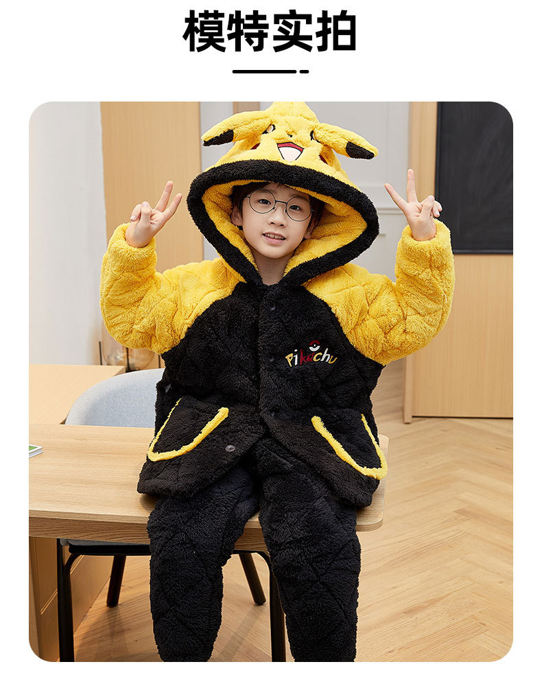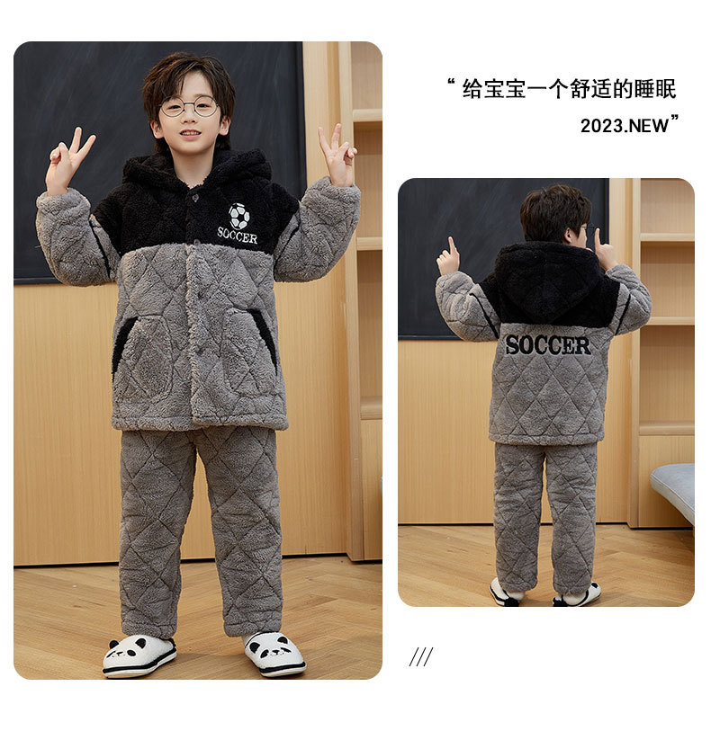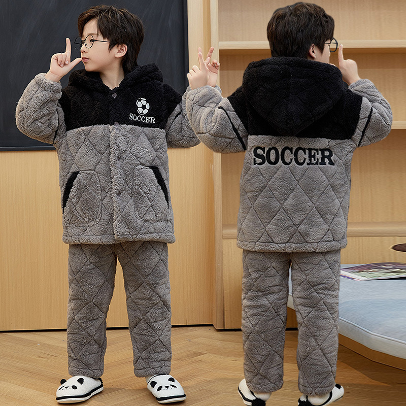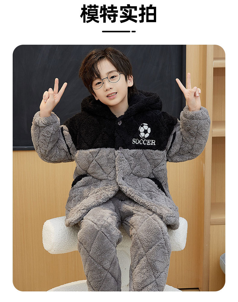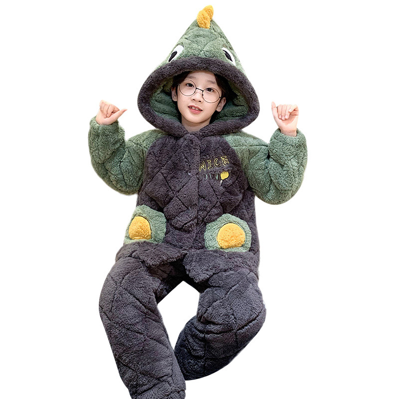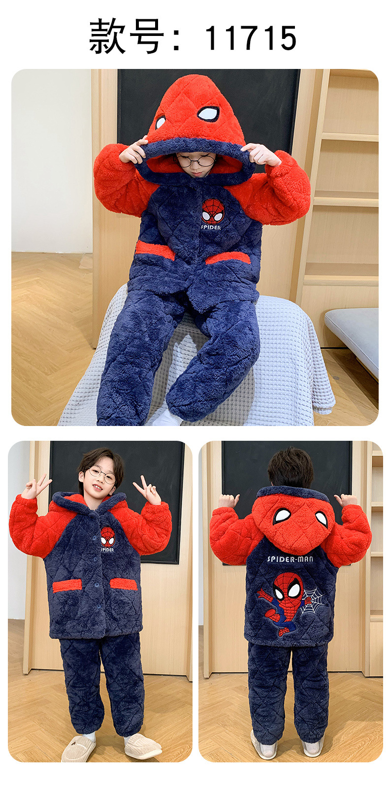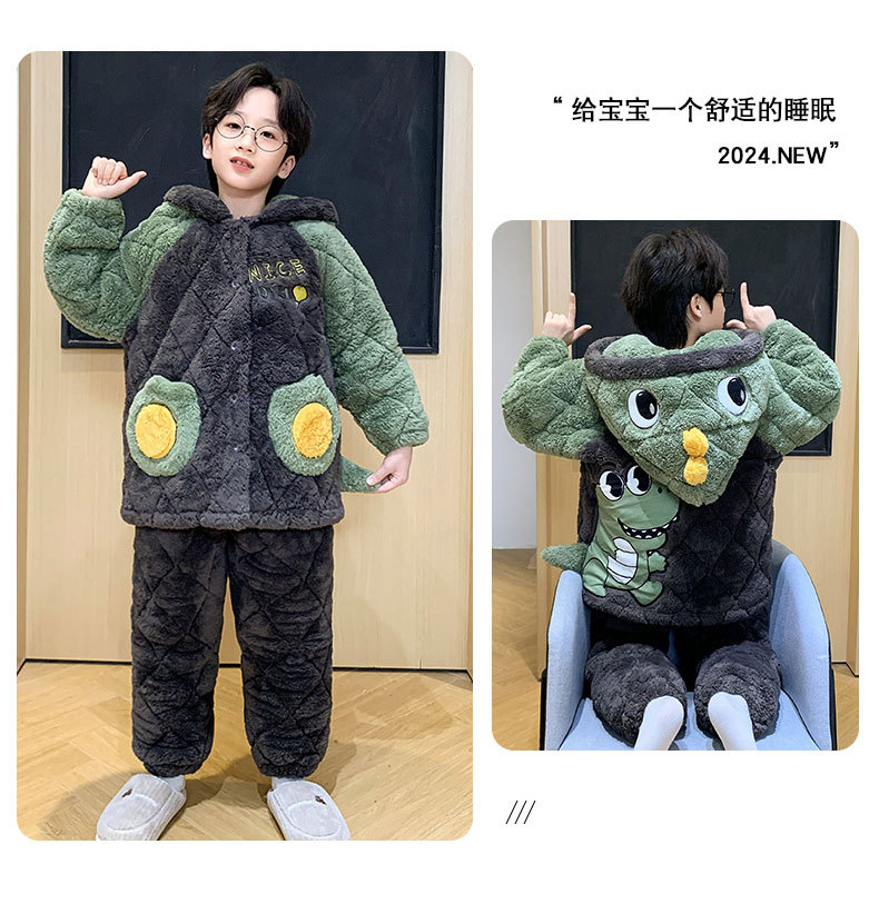 儿童珊瑚绒睡衣男孩冬季三层夹棉加厚款宝宝男童卡通法兰绒家居服