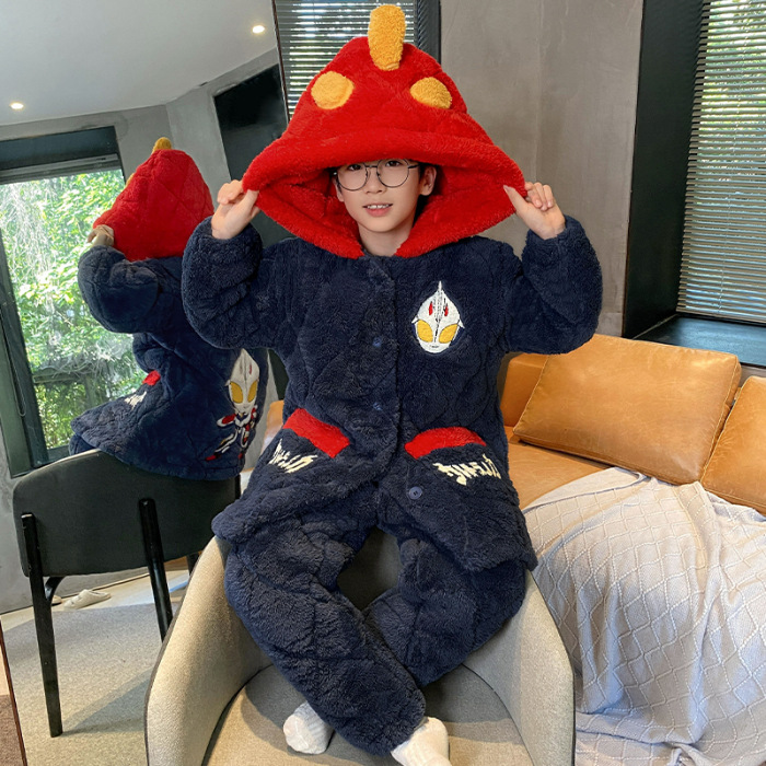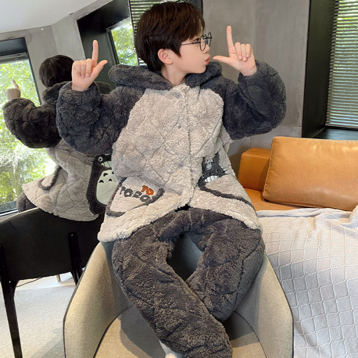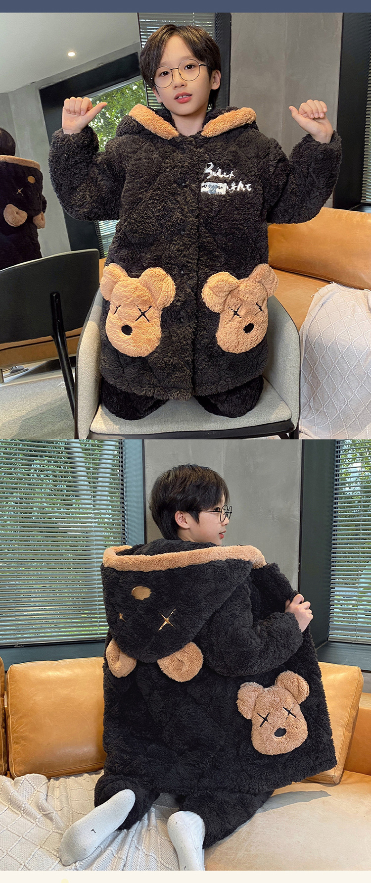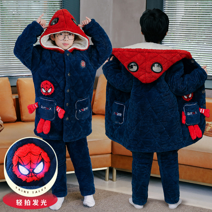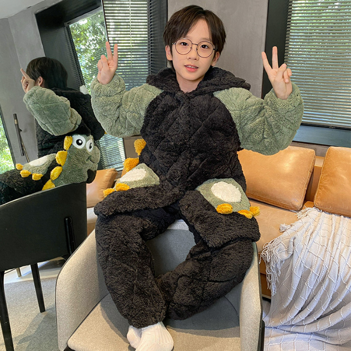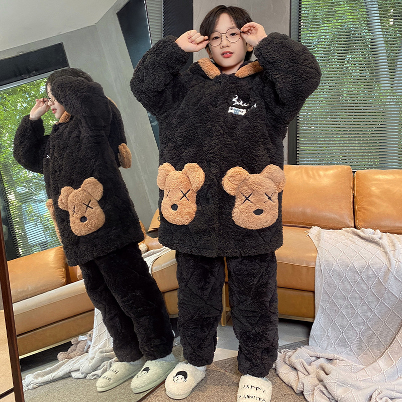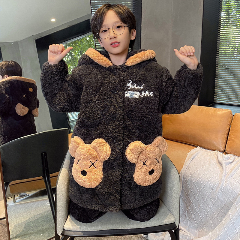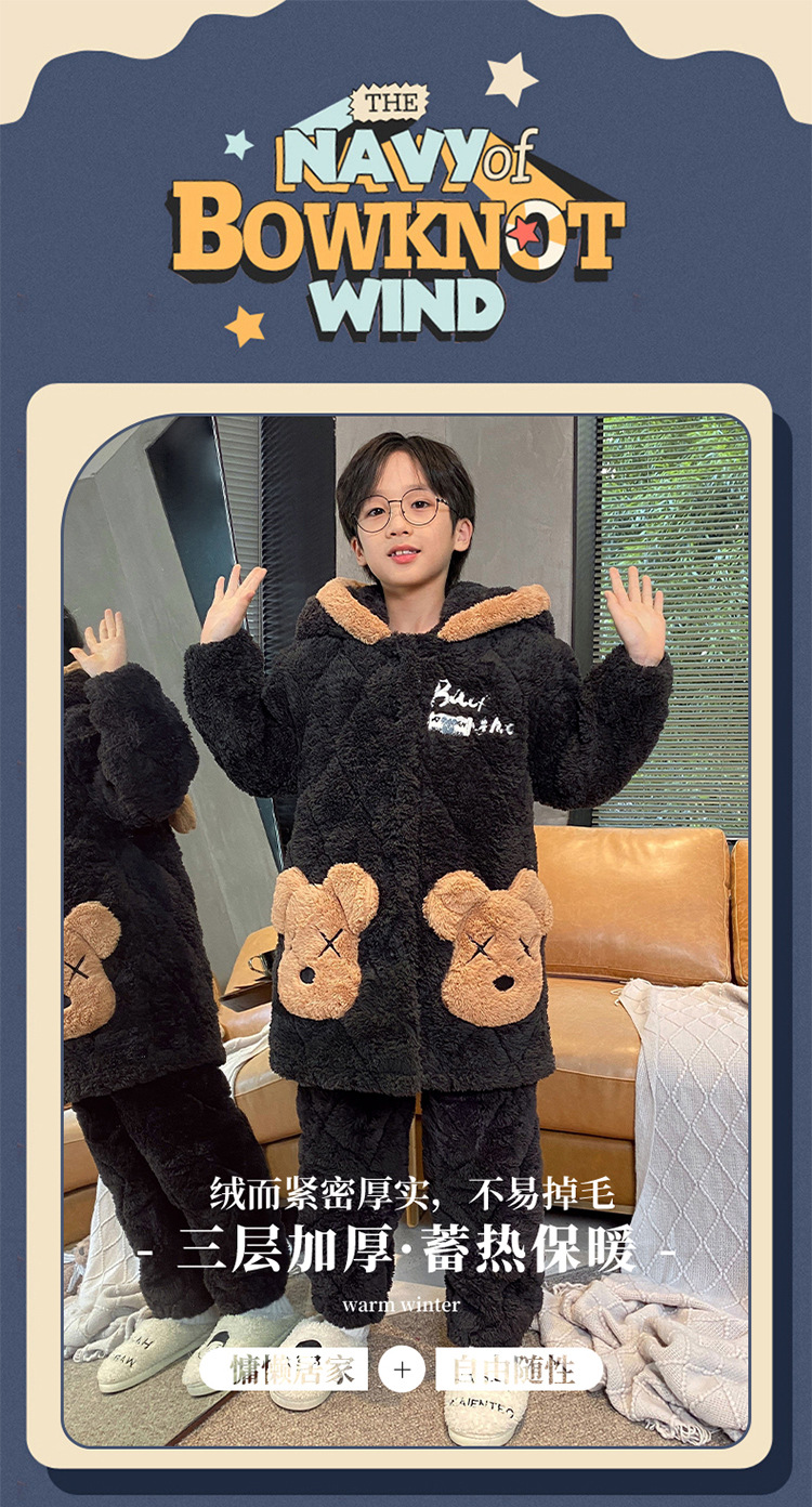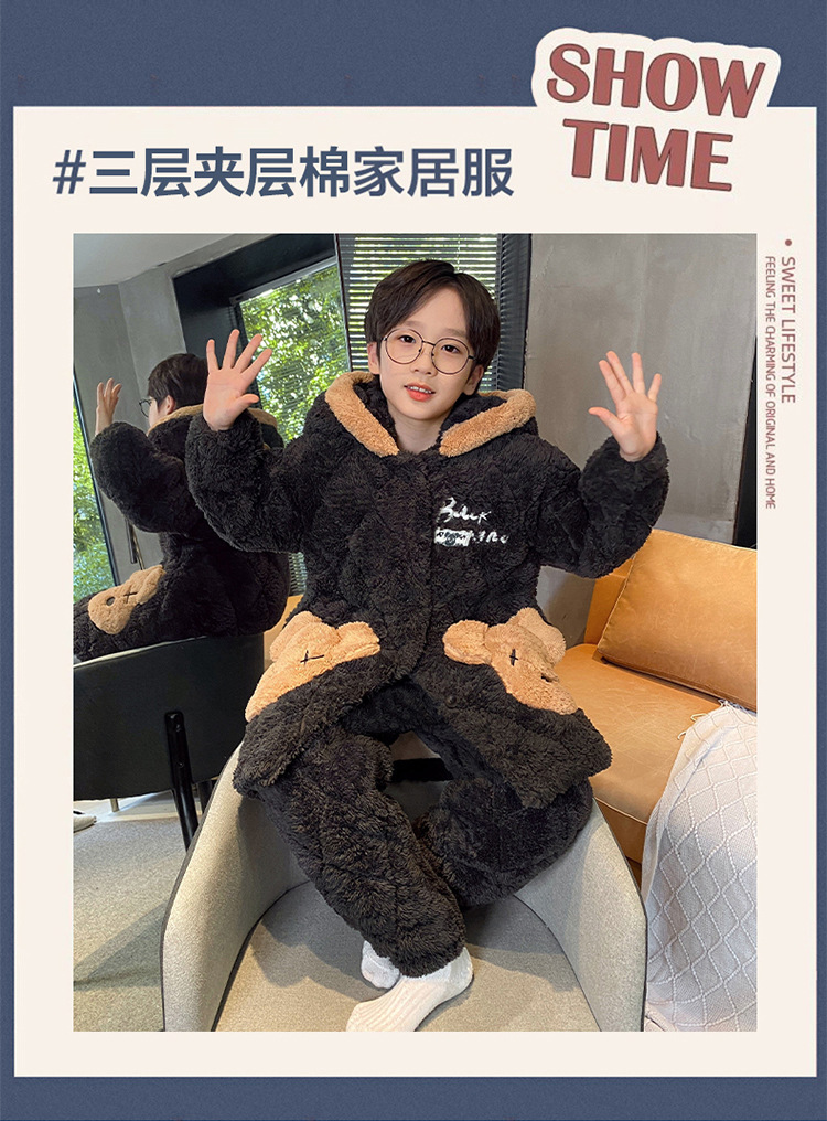 男童睡衣三层夹棉珊瑚绒冬季加厚款儿童男孩法兰绒2024新款家居服
