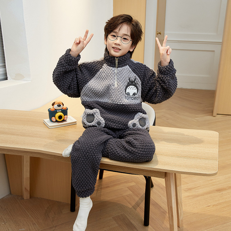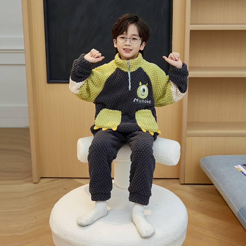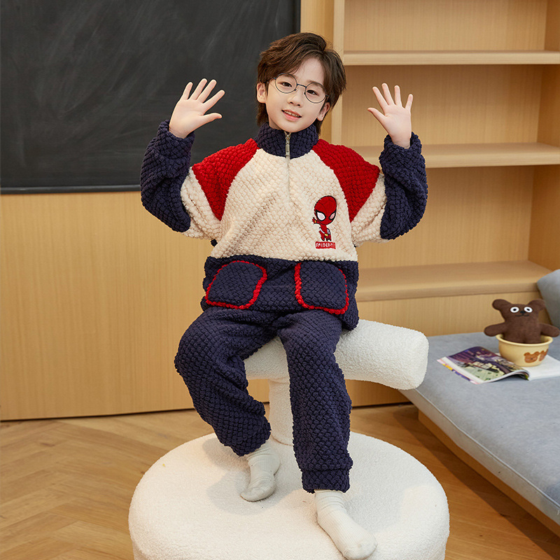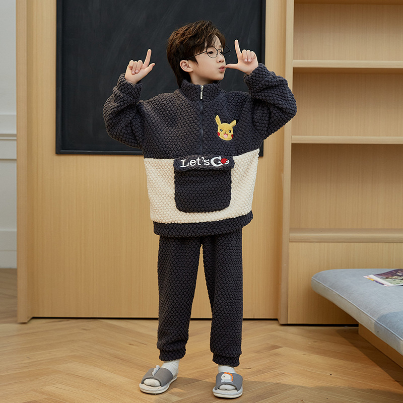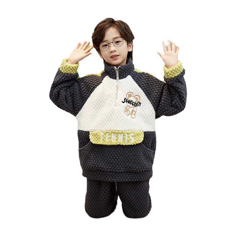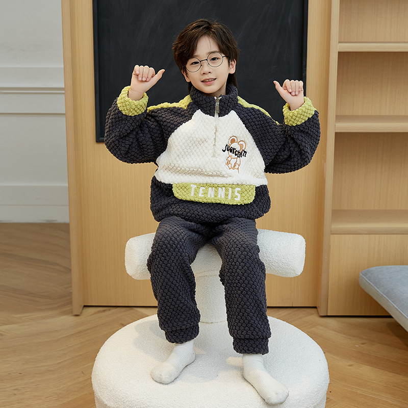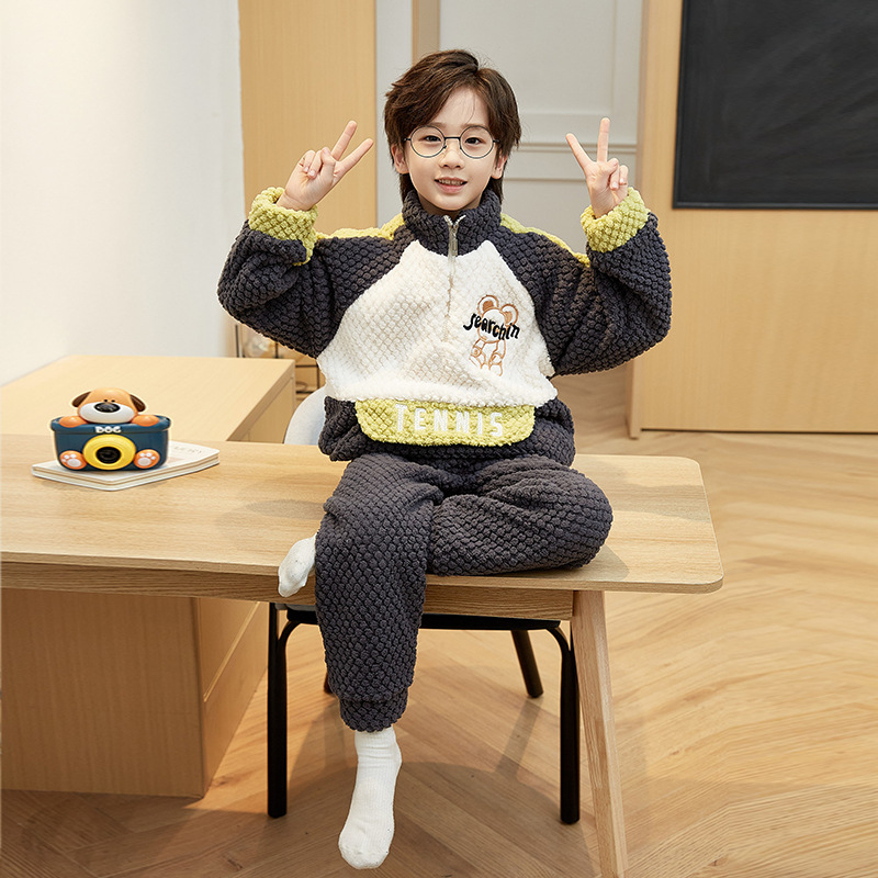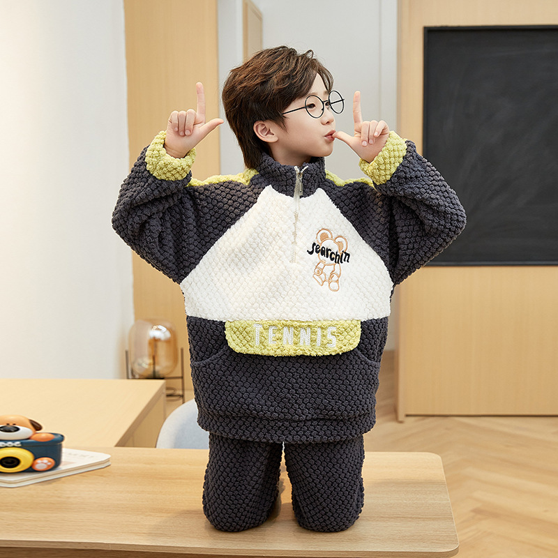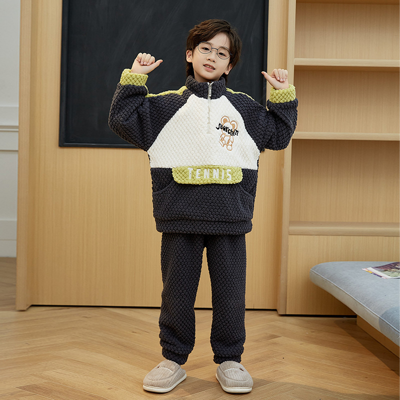 儿童睡衣冬季珊瑚绒加绒加厚中大童男孩高领男童法兰绒家居服套装