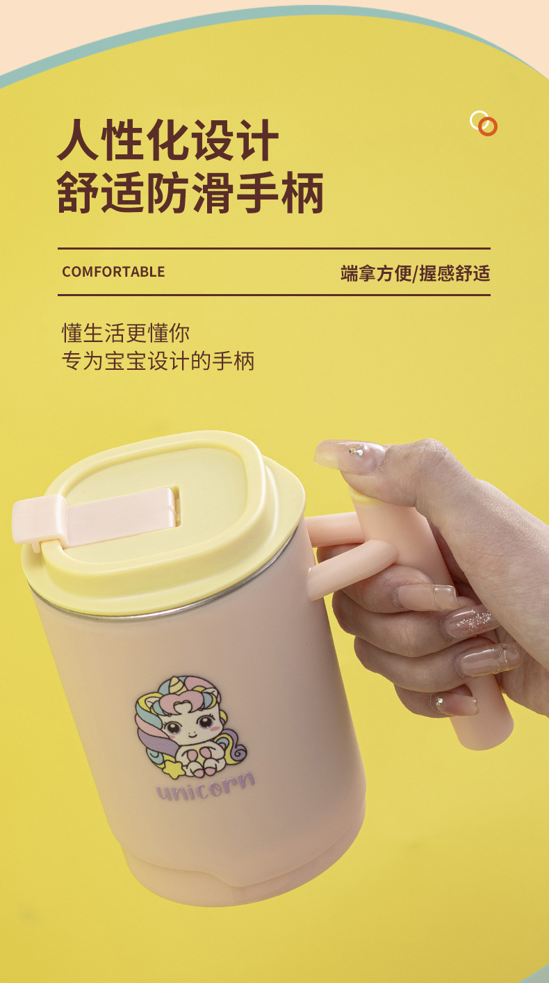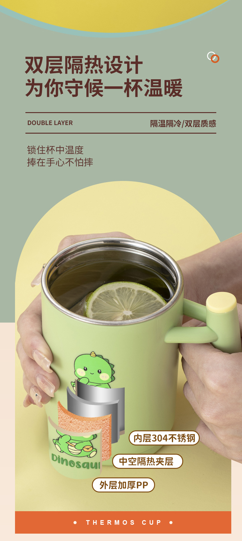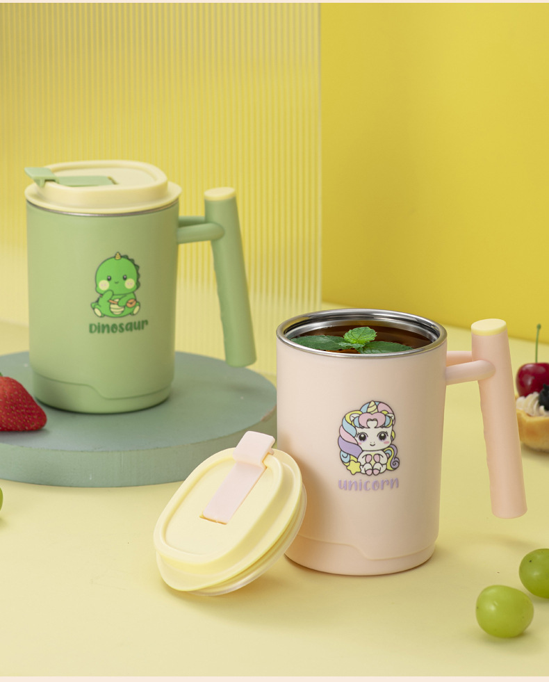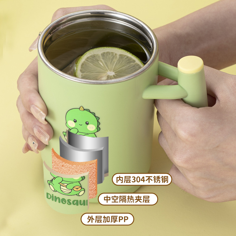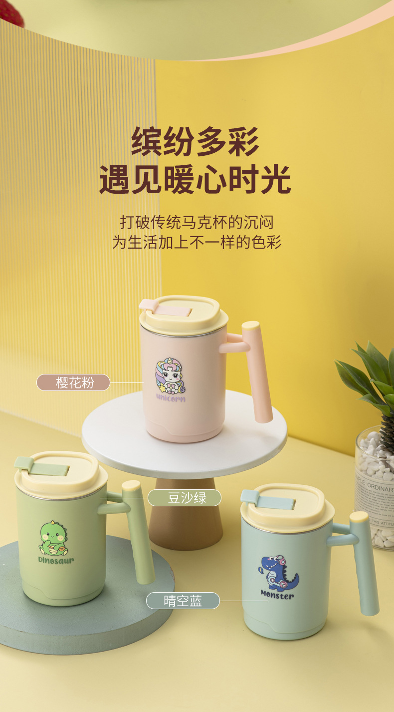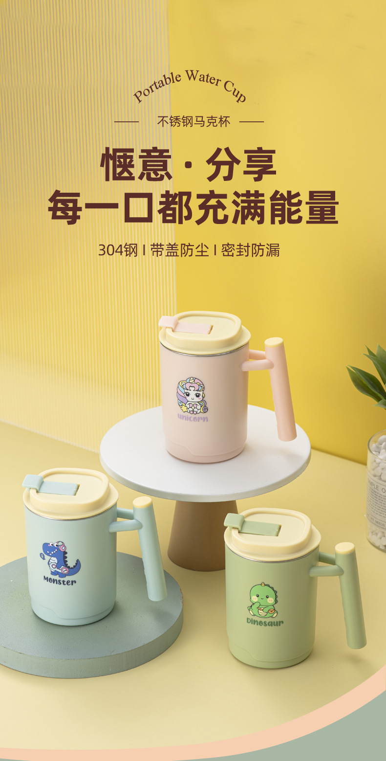 304不锈钢水杯带手柄卡通图案马克杯高颜值水杯办公杯带盖咖啡杯