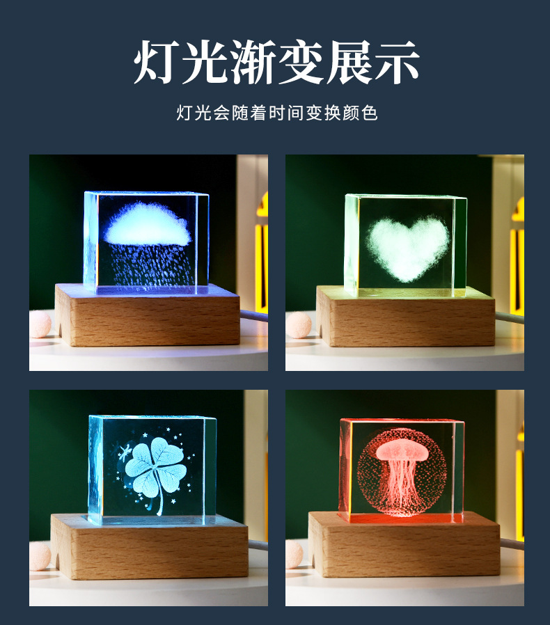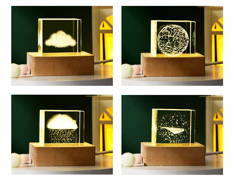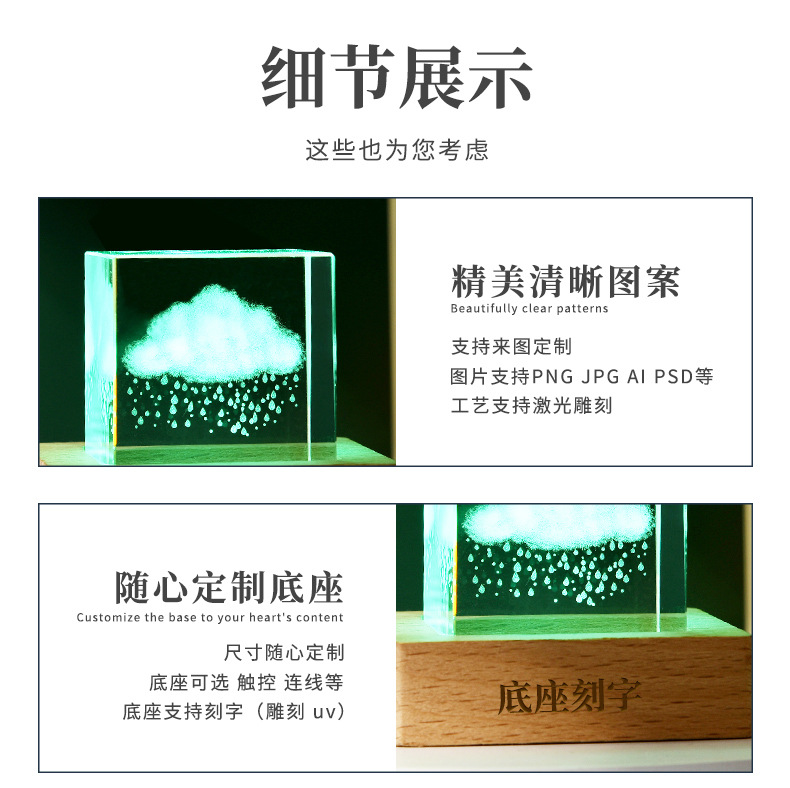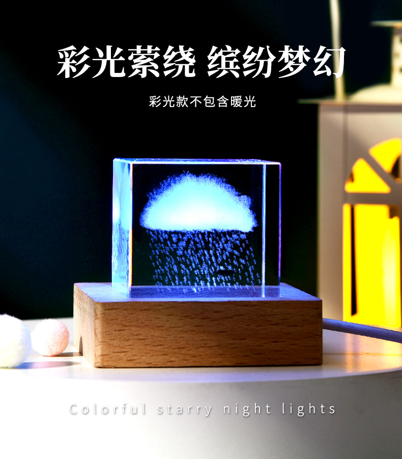 云朵雨3D内雕立方形水晶球发光小夜灯创意装饰木底座桌面摆件跨境
