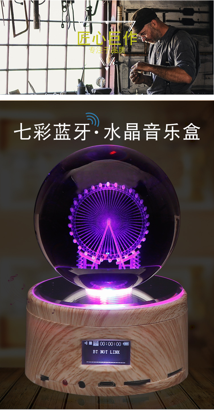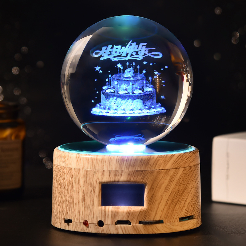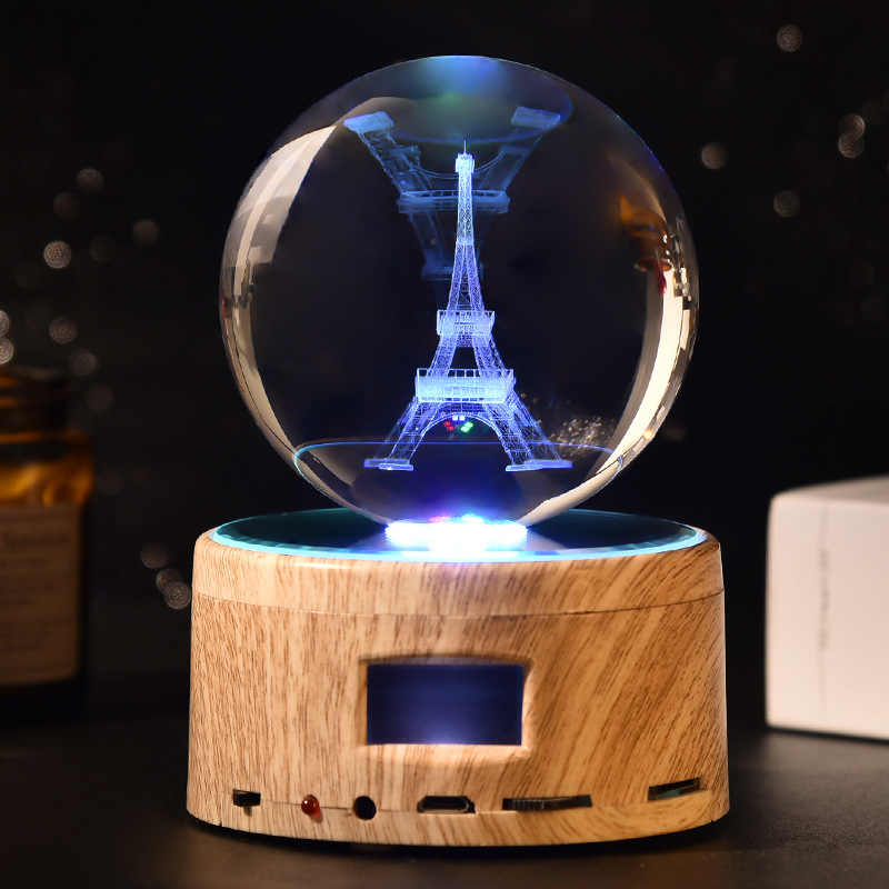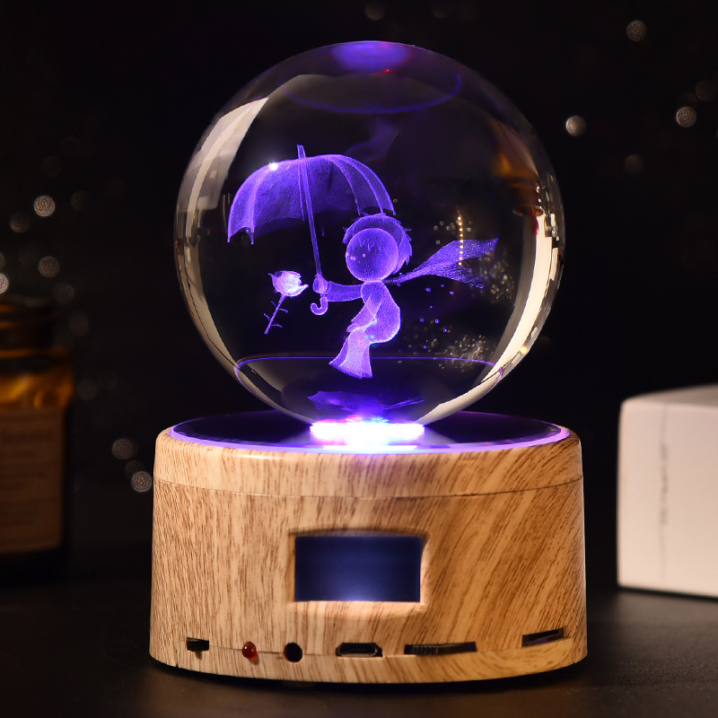 3D内雕图案水晶摆件遥控蓝牙八音盒七彩发光水晶球桌面摆件工艺品