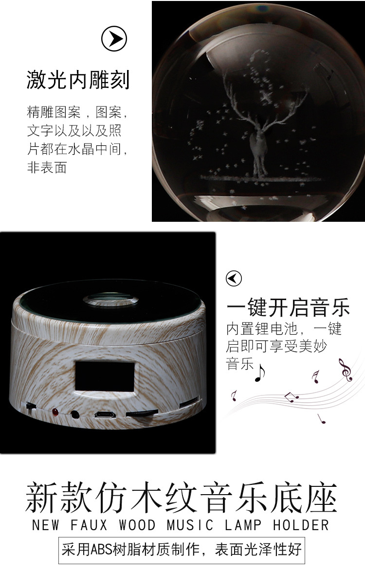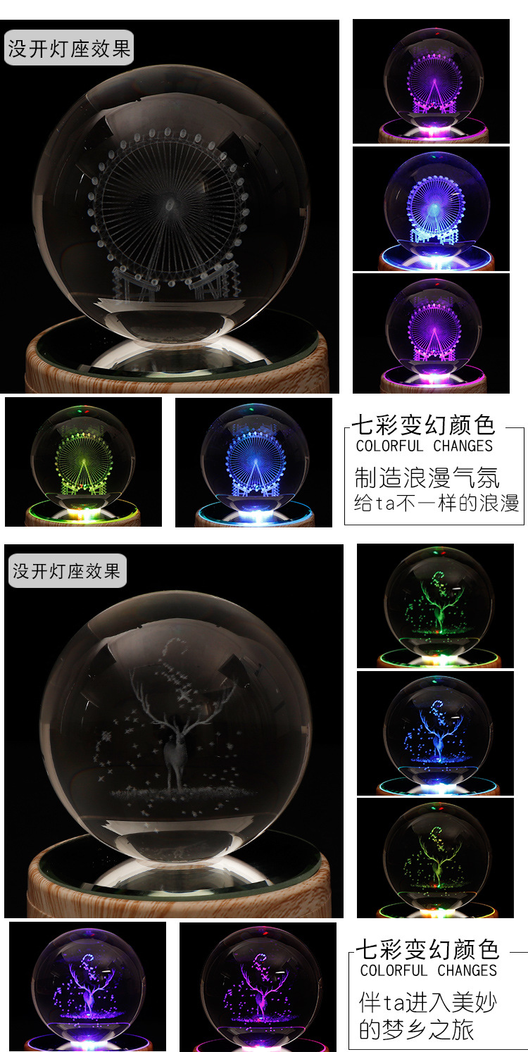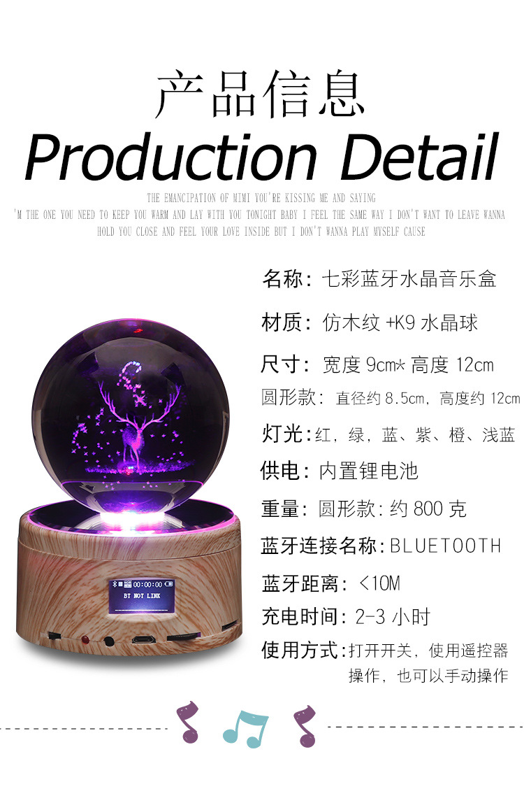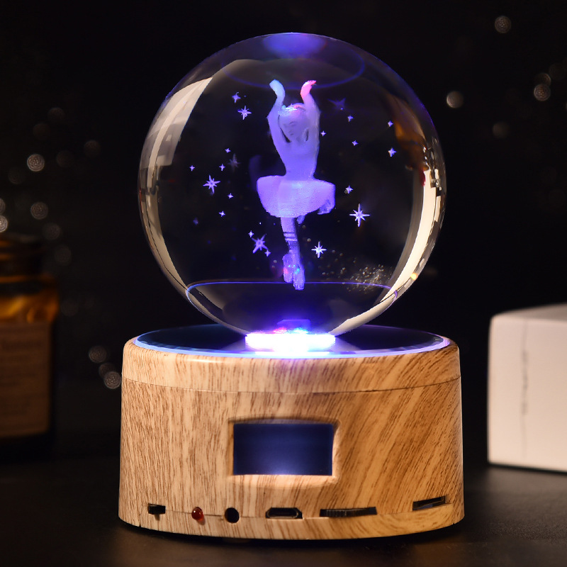 3D内雕图案水晶摆件遥控蓝牙八音盒七彩发光水晶球桌面摆件工艺品