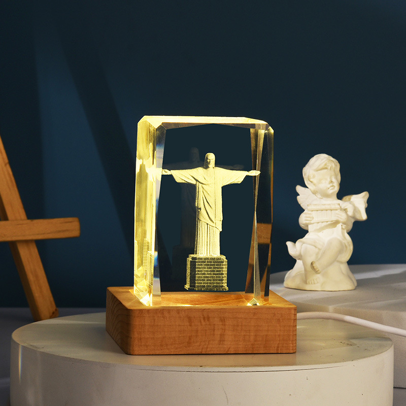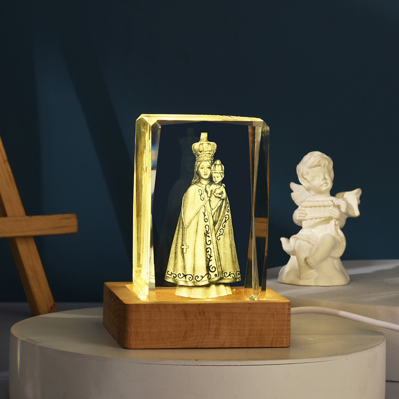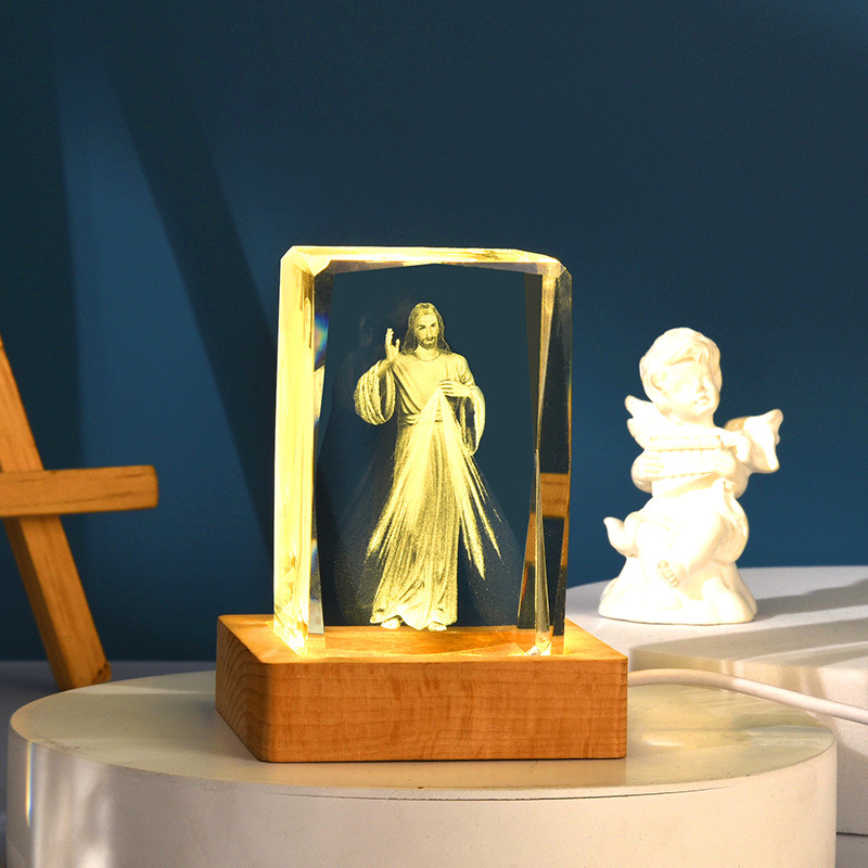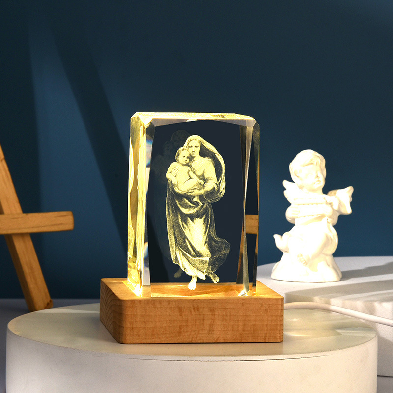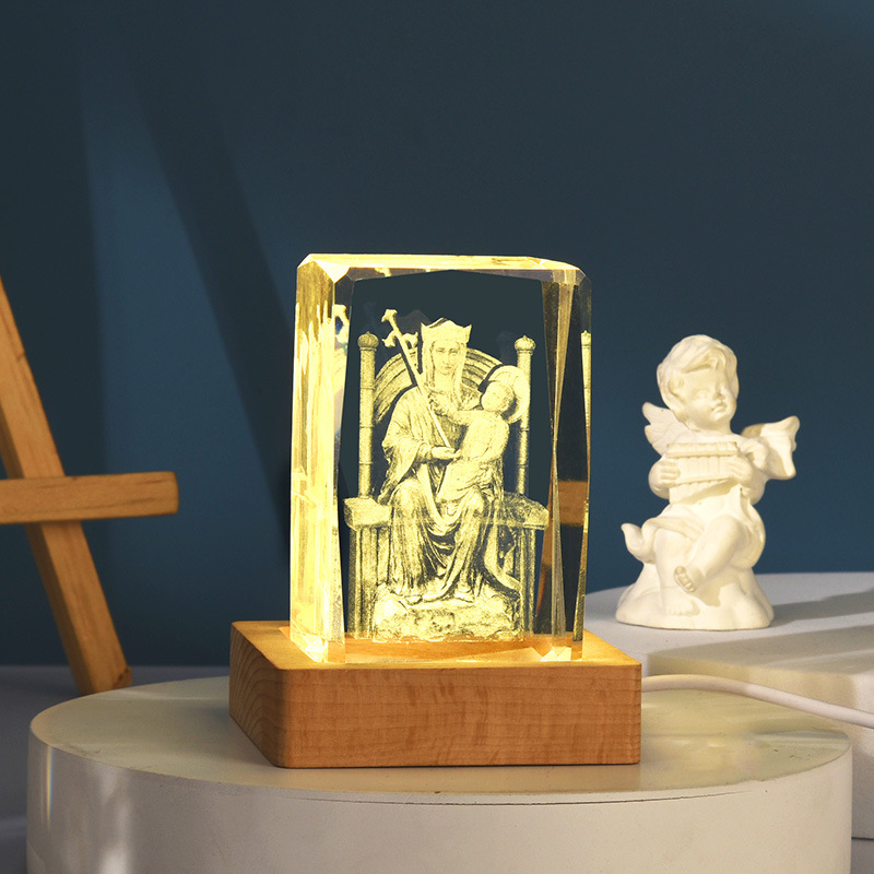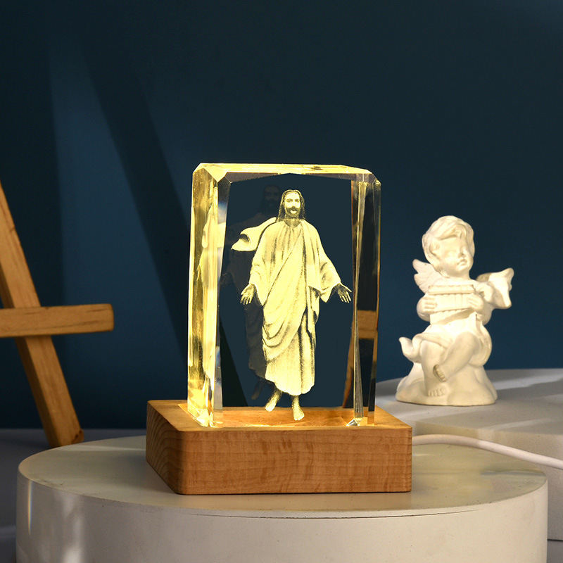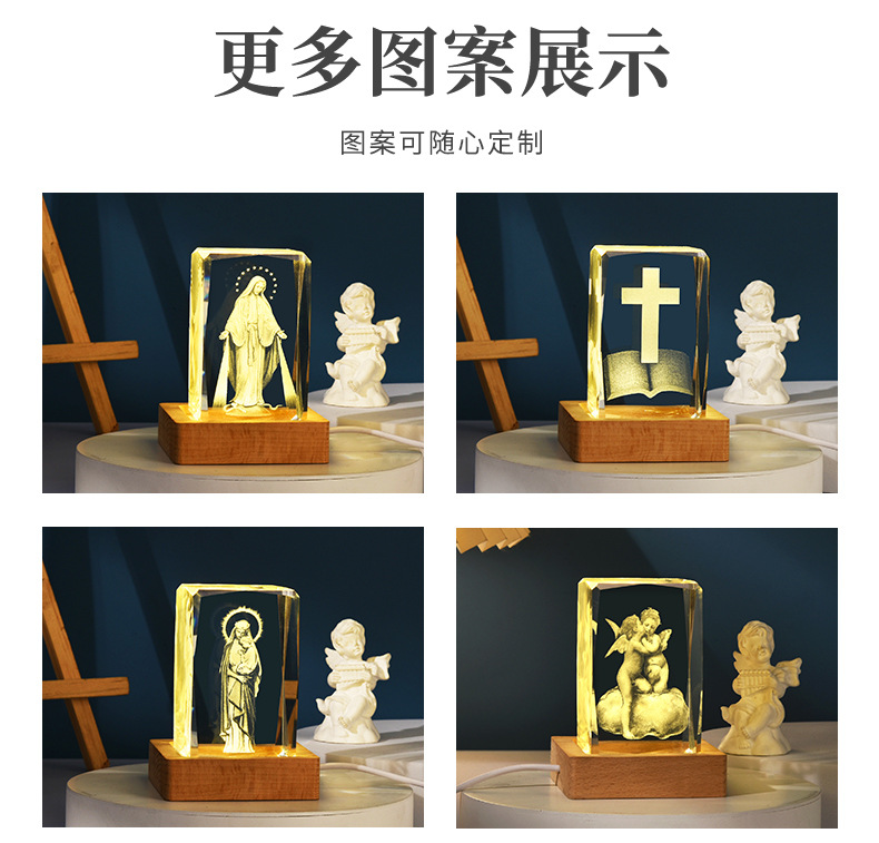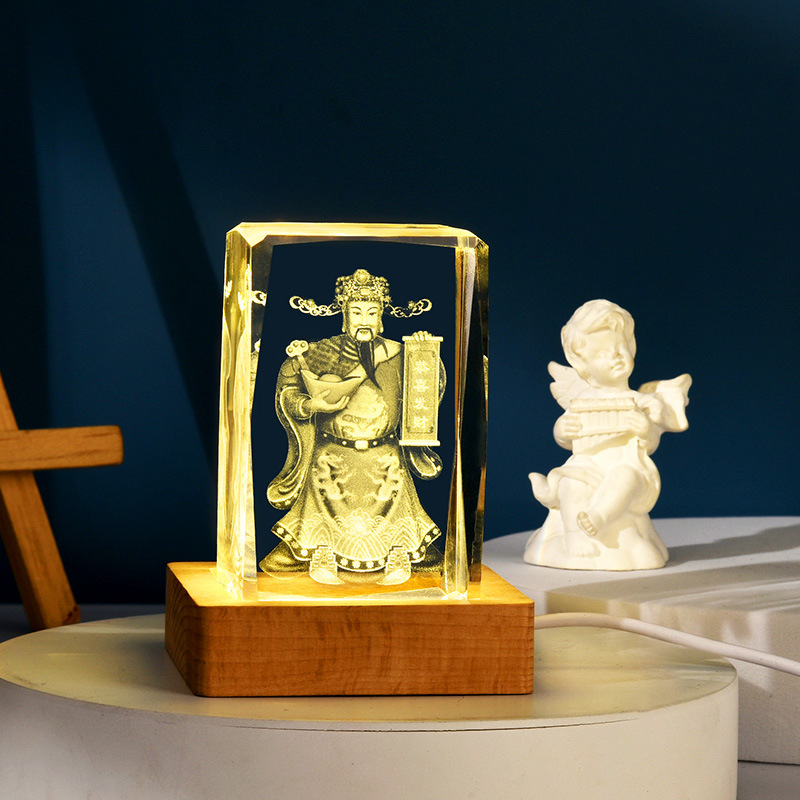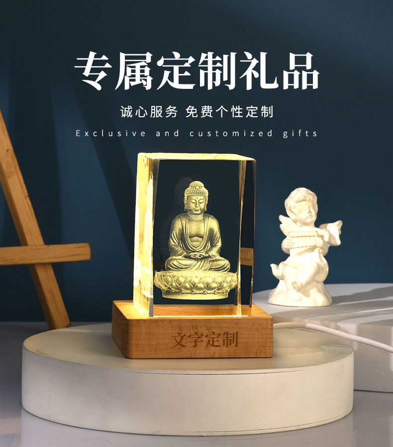 佛像雕像方体水晶摆件木制底座带LED灯充电款USB连线款发光摆件