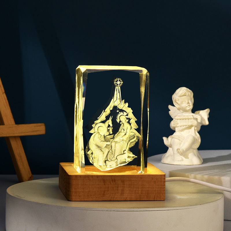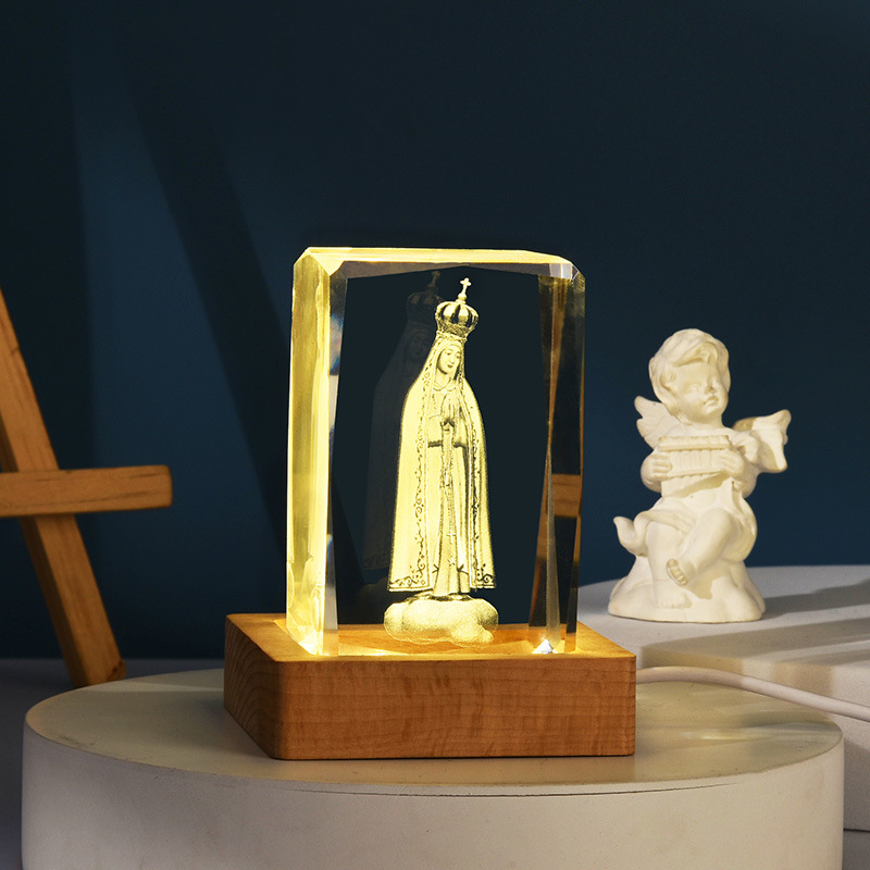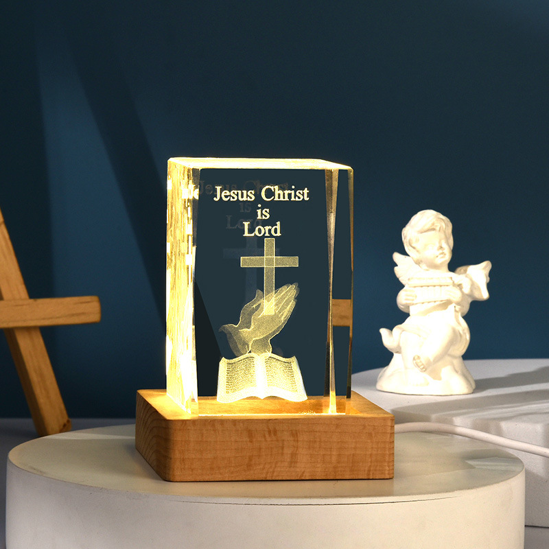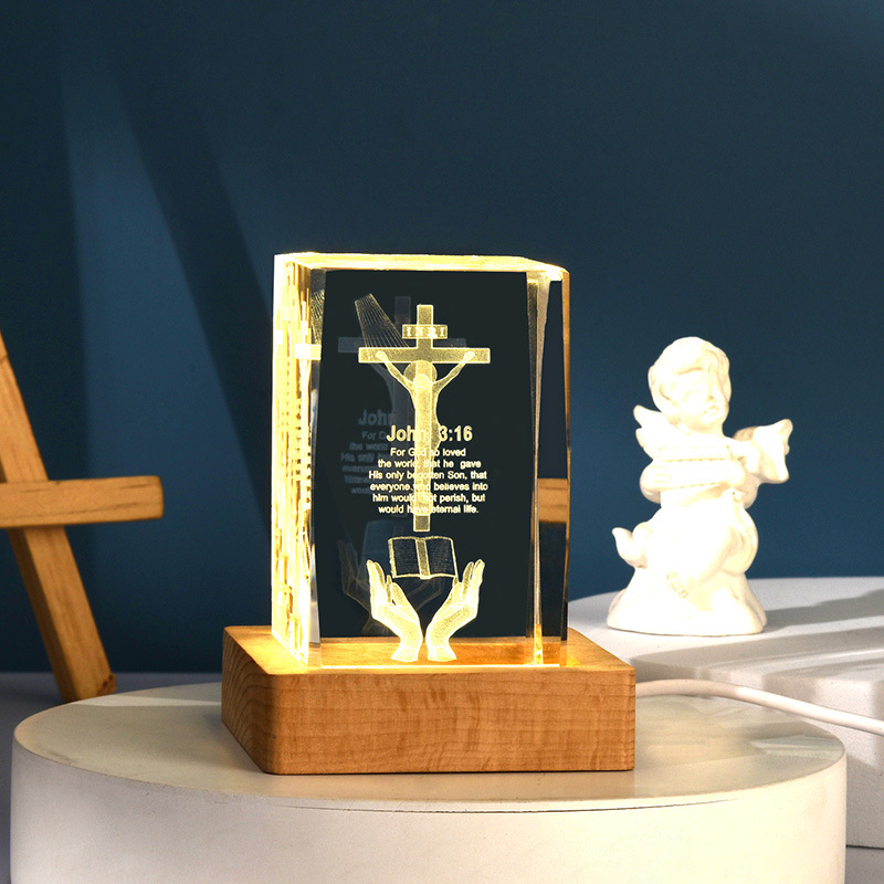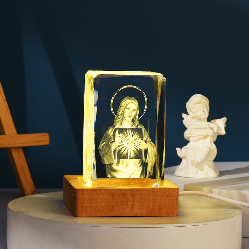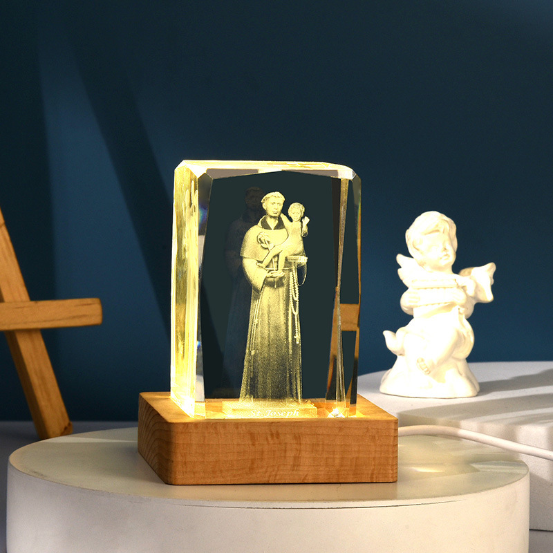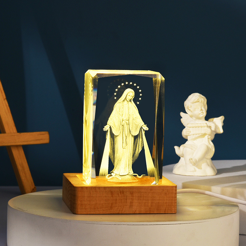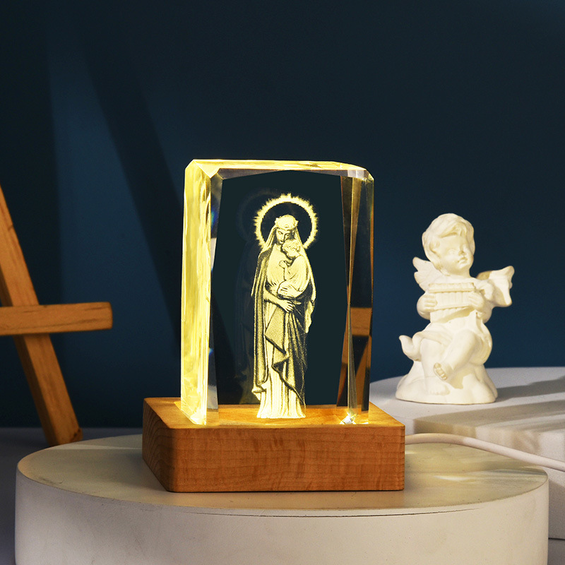 佛像雕像方体水晶摆件木制底座带LED灯充电款USB连线款发光摆件