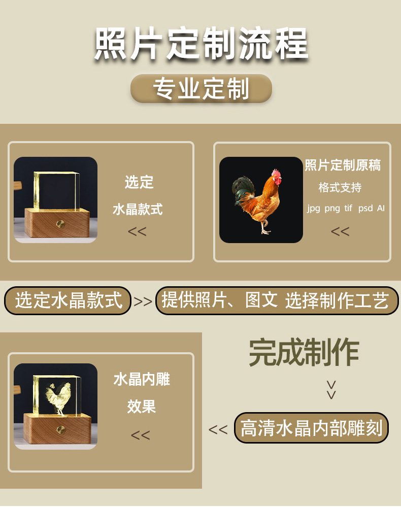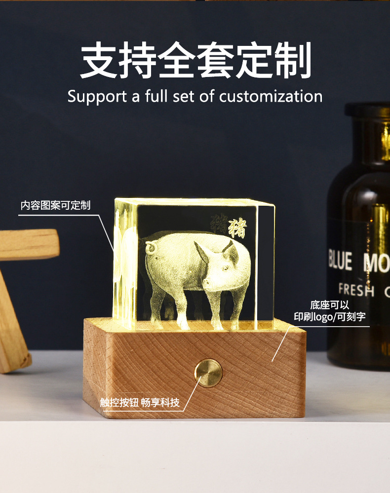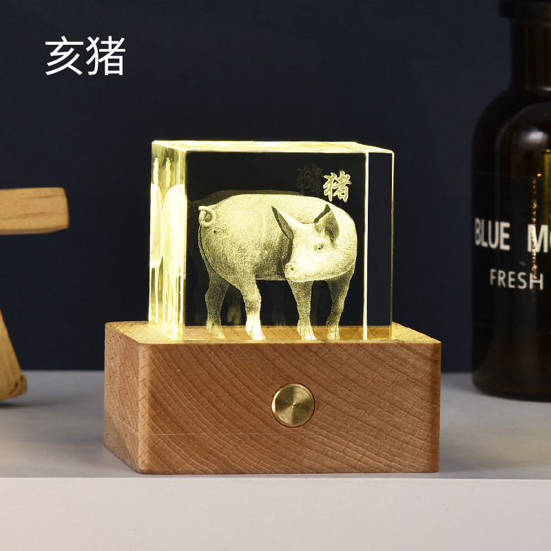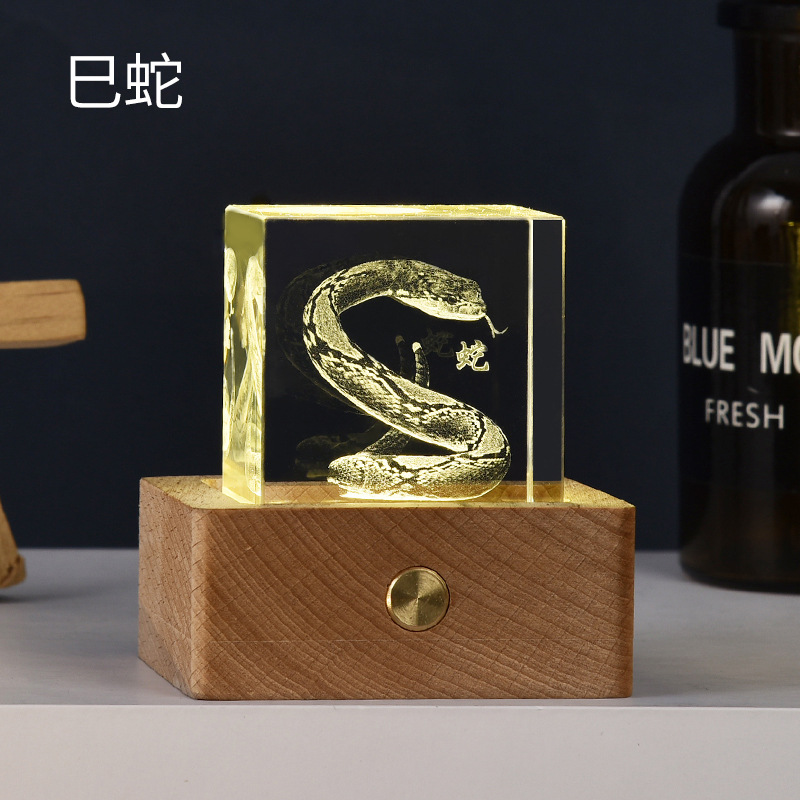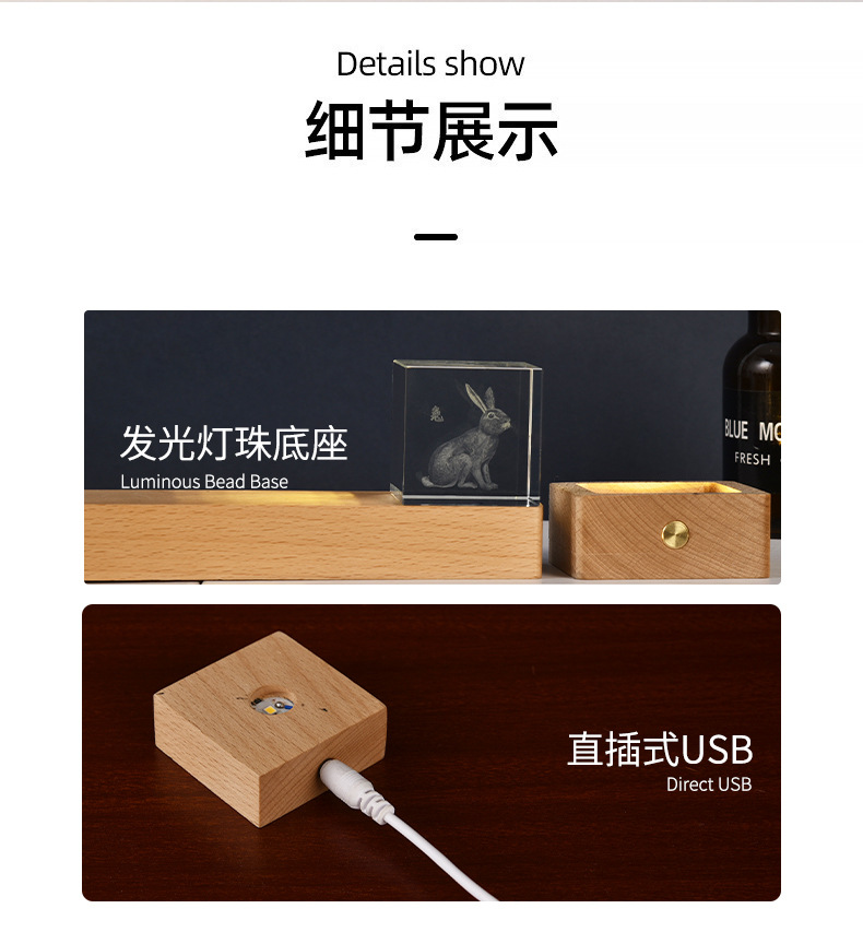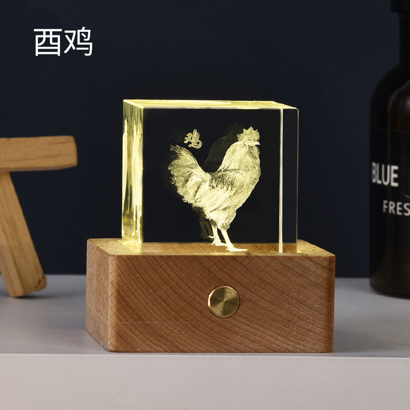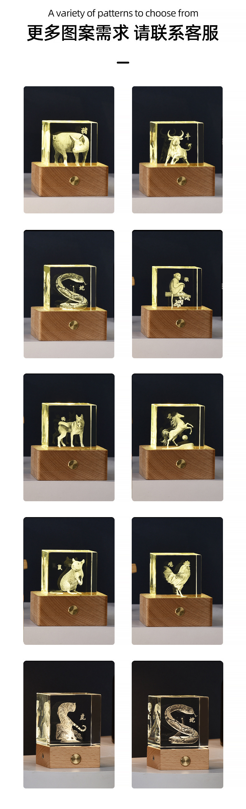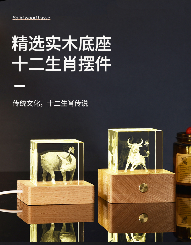十二生肖发光水晶摆件木制底座带LED灯充电款USB连线款底座刻字