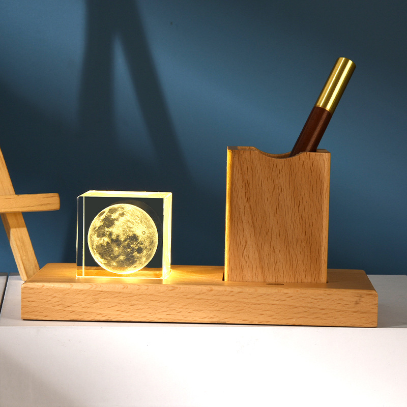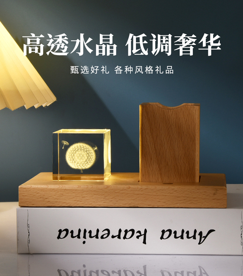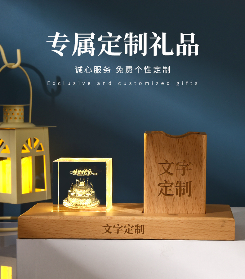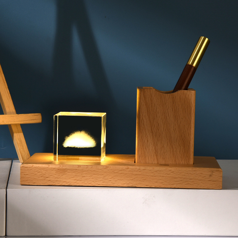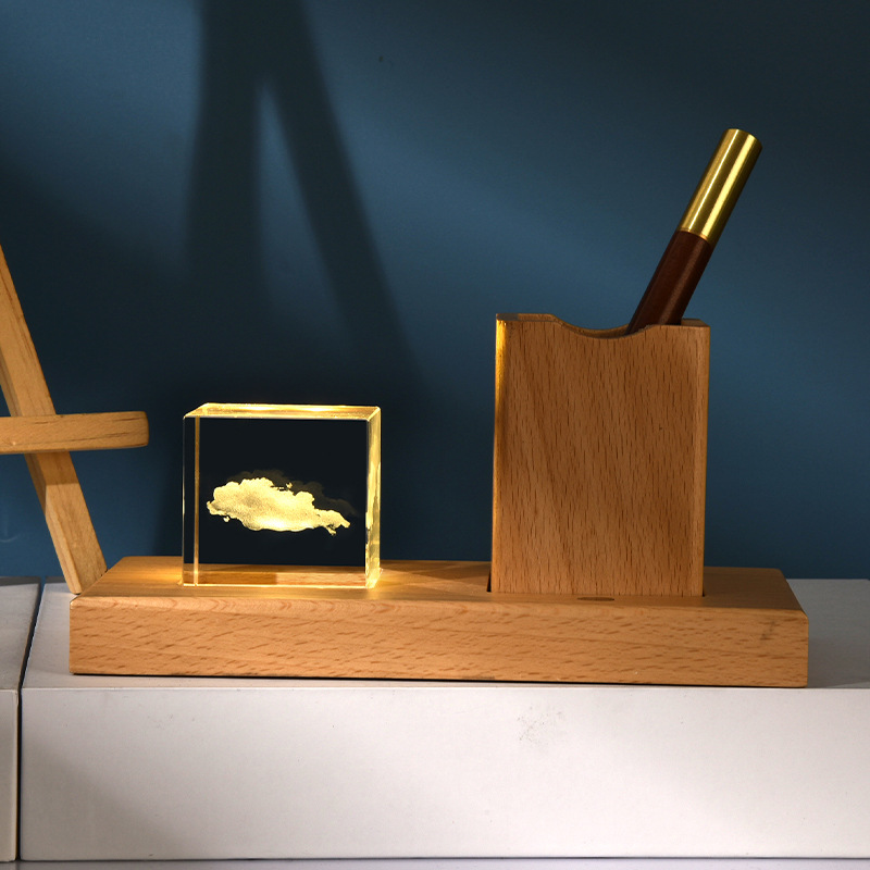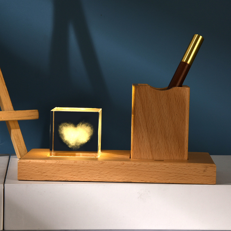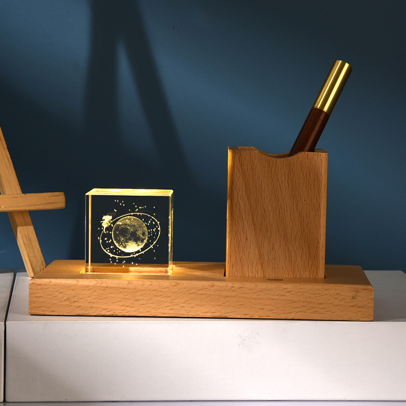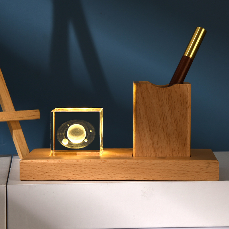 木质底座水晶3d内雕发光笔筒办公书桌摆件商务礼品可跨境工厂批发