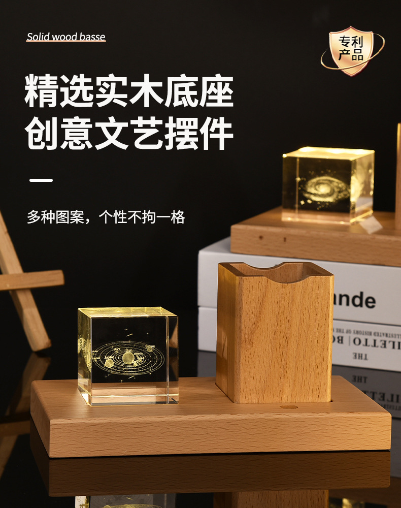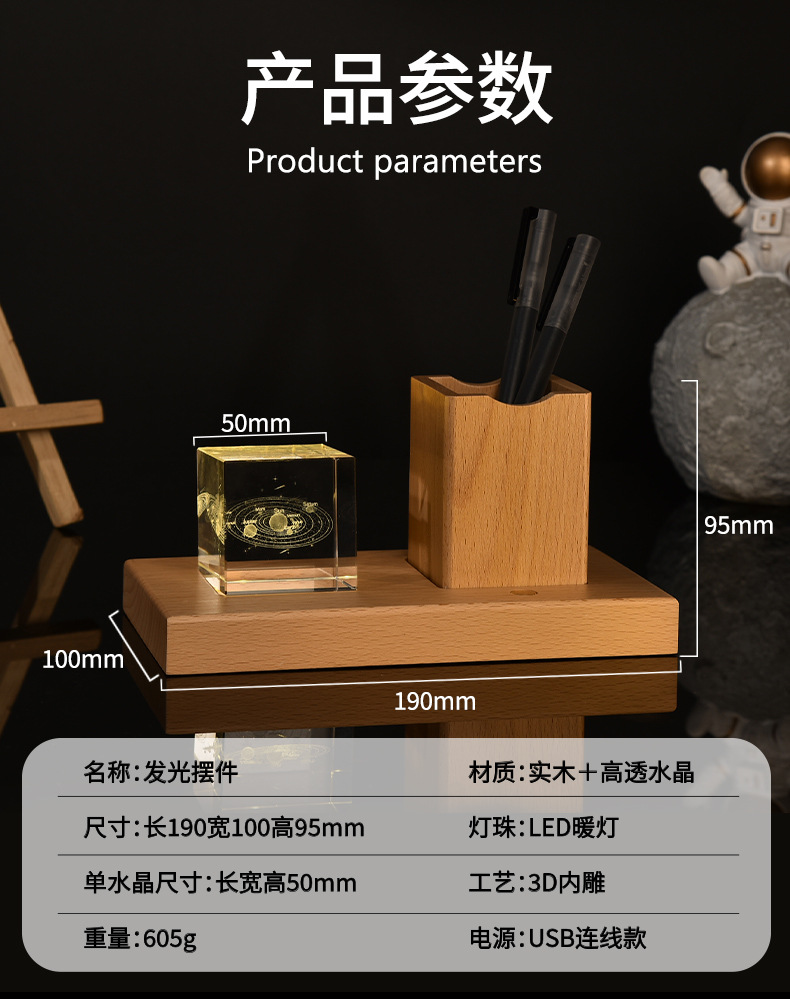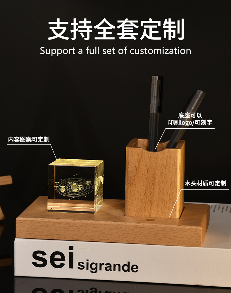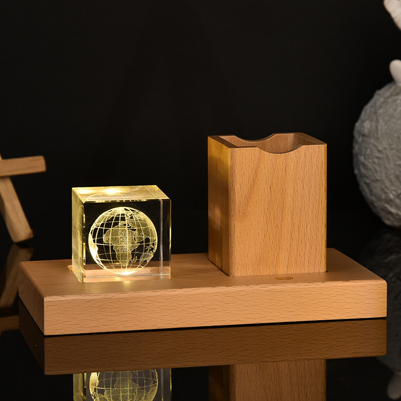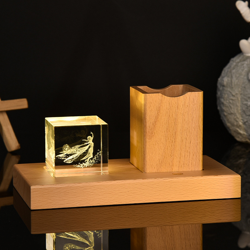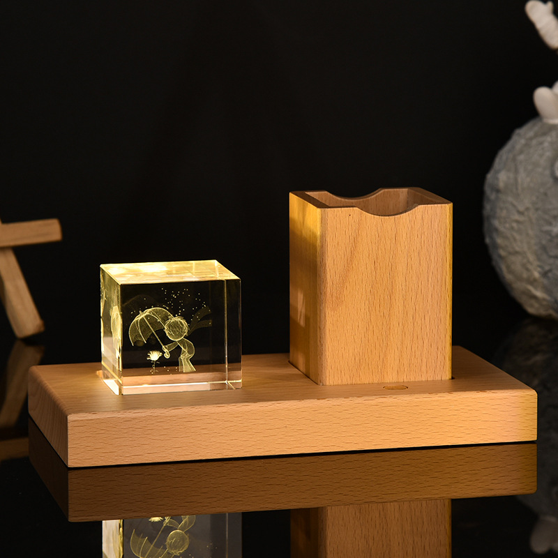 跨境批发水晶内雕发光摆件工艺品笔筒款带灯带木质底座创意礼品