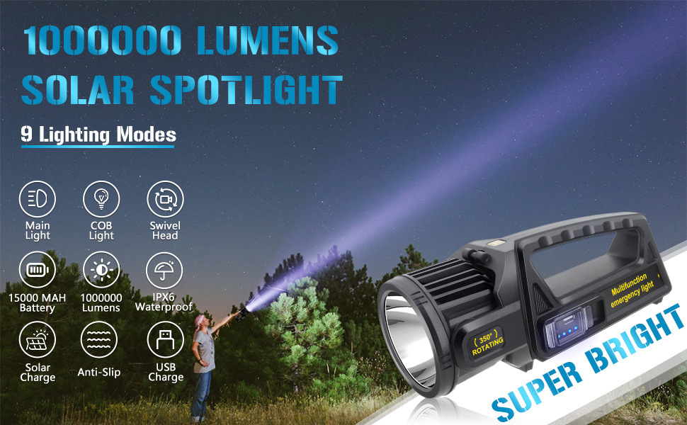 多功能强光手电筒充电LED太阳能探照灯 户外大功率照明强光手提灯