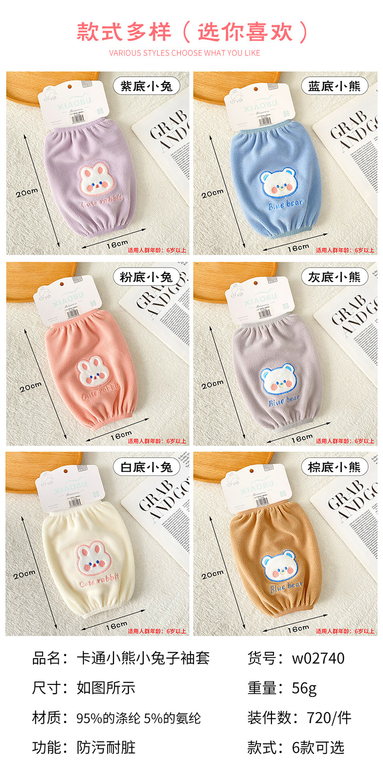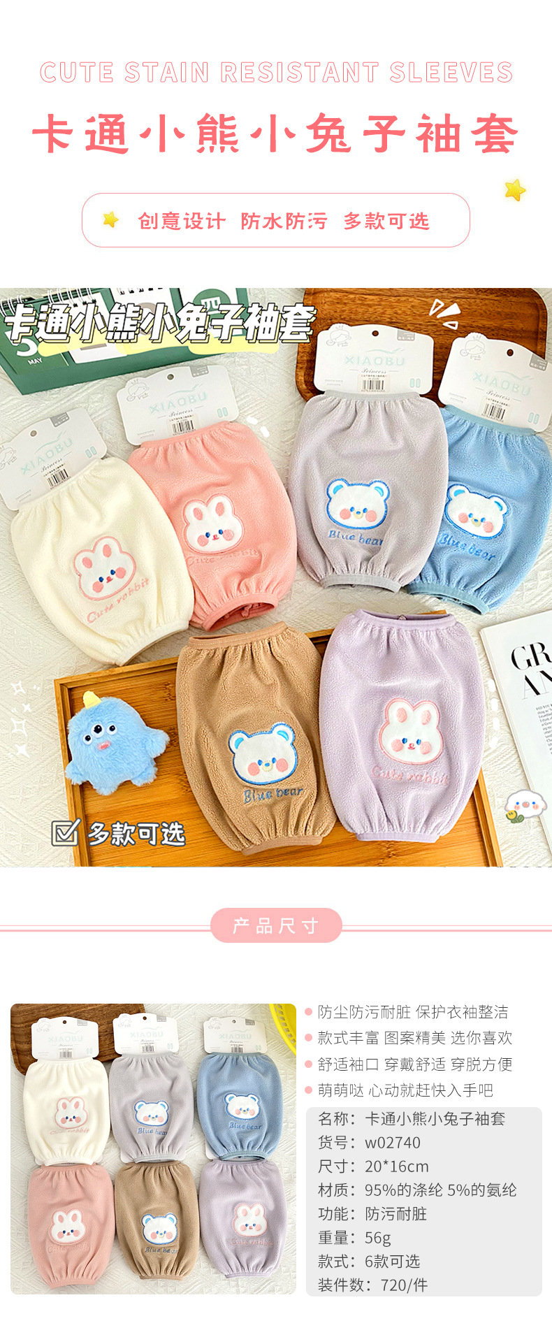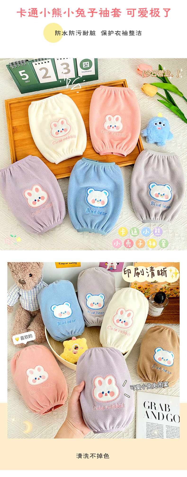 新款卡通可爱熊兔袖套毛绒刺绣图案防污耐脏袖套秋冬防脏防护套袖