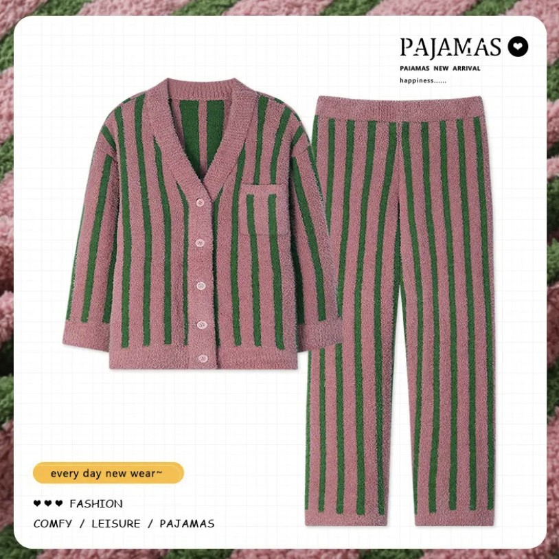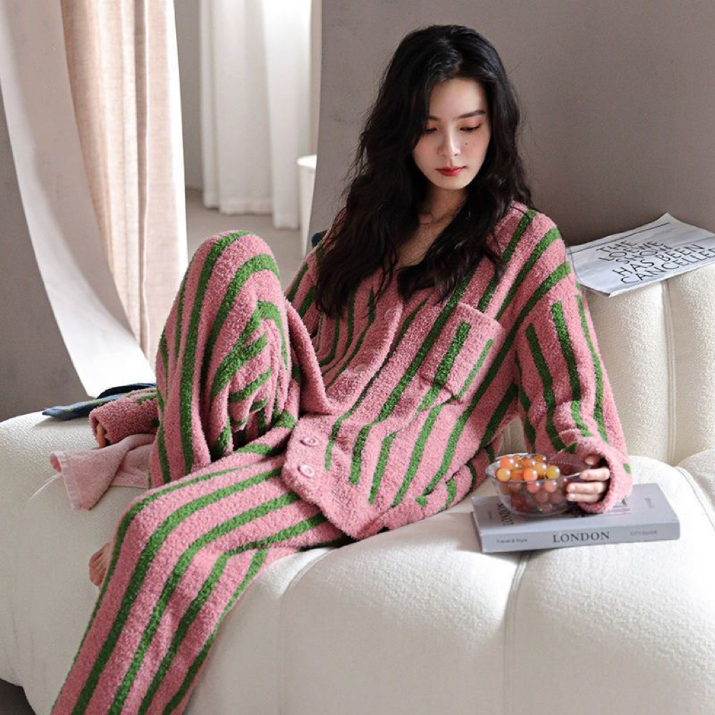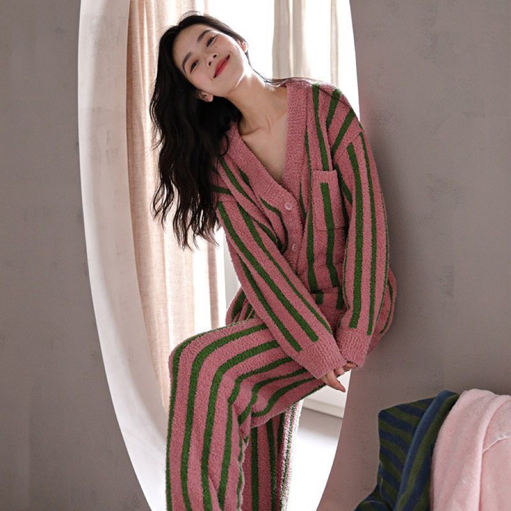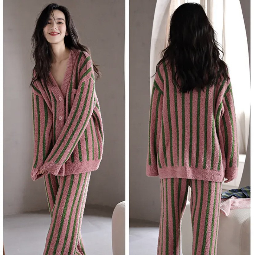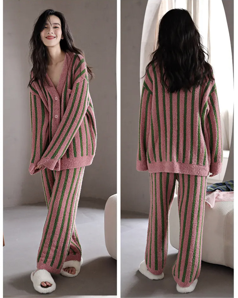 秋冬季新款女士开衫柔软羊绒保暖加厚撞色条纹家居服珊瑚绒两件套