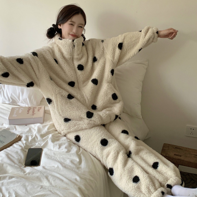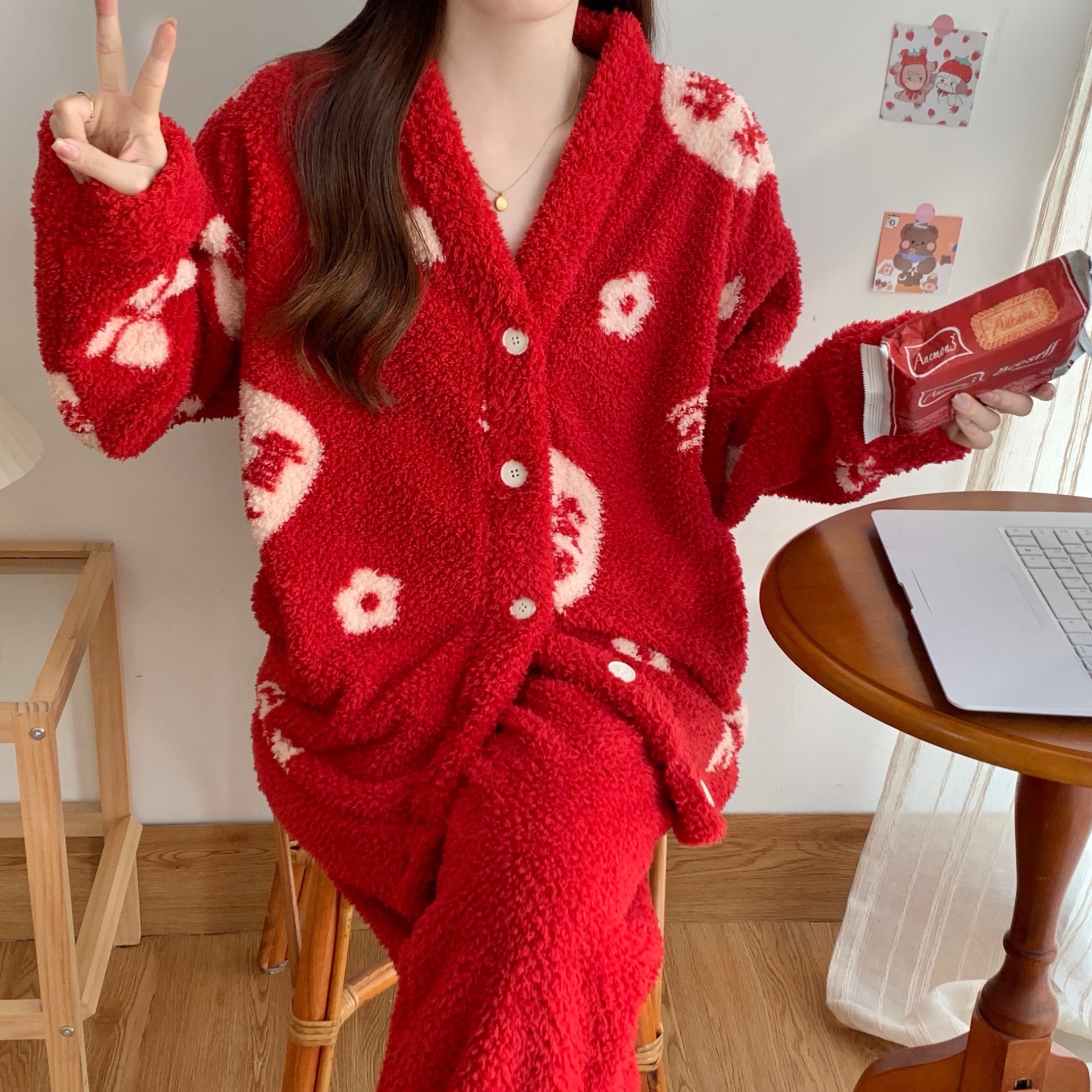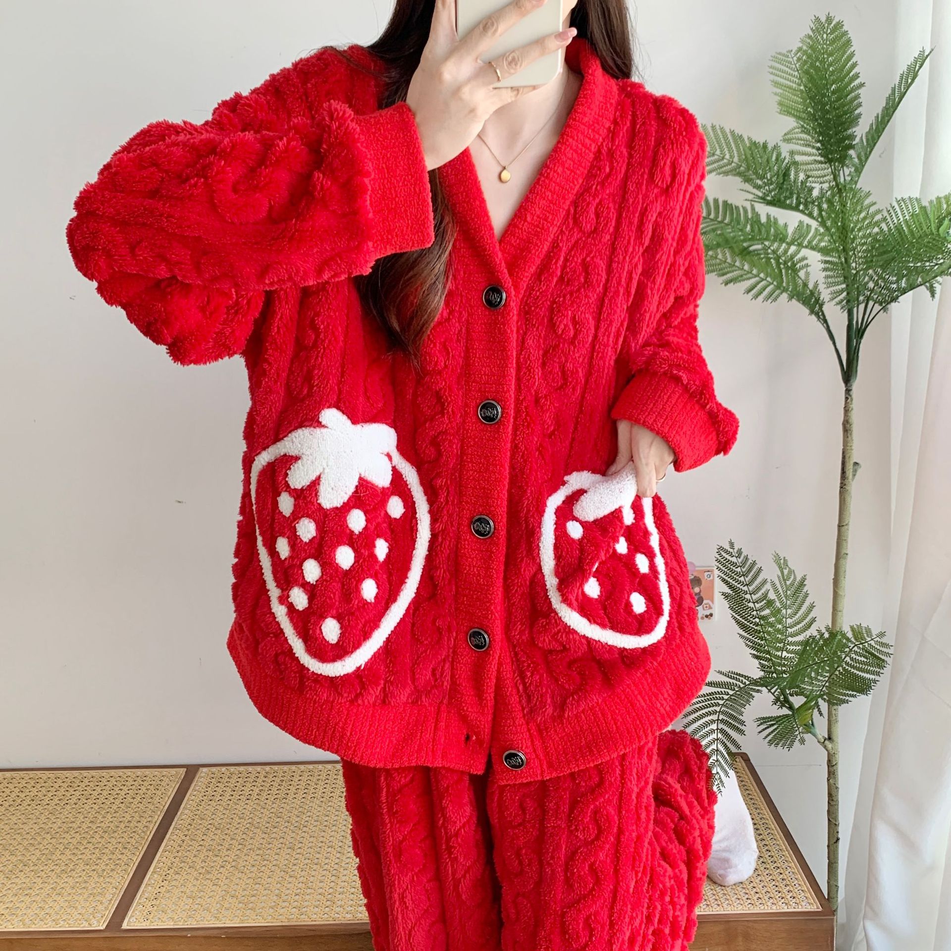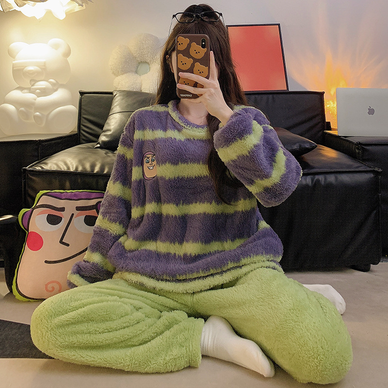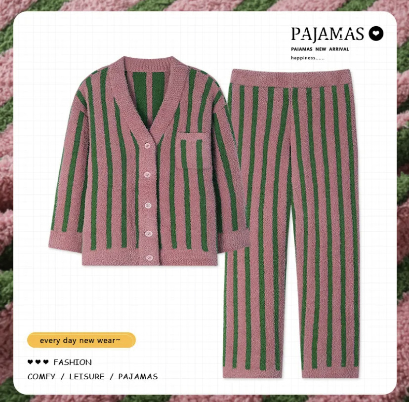秋冬季新款女士开衫柔软羊绒保暖加厚撞色条纹家居服珊瑚绒两件套