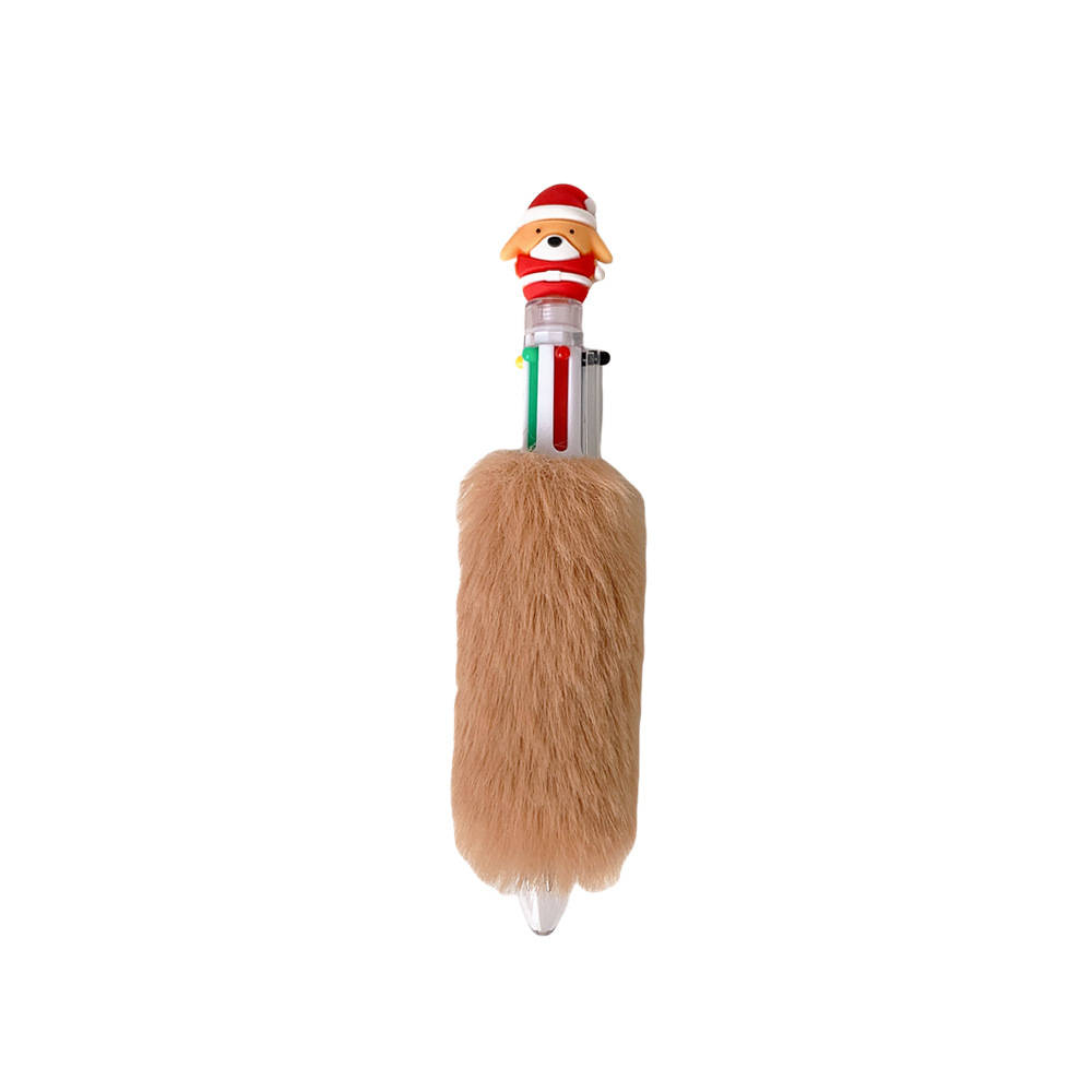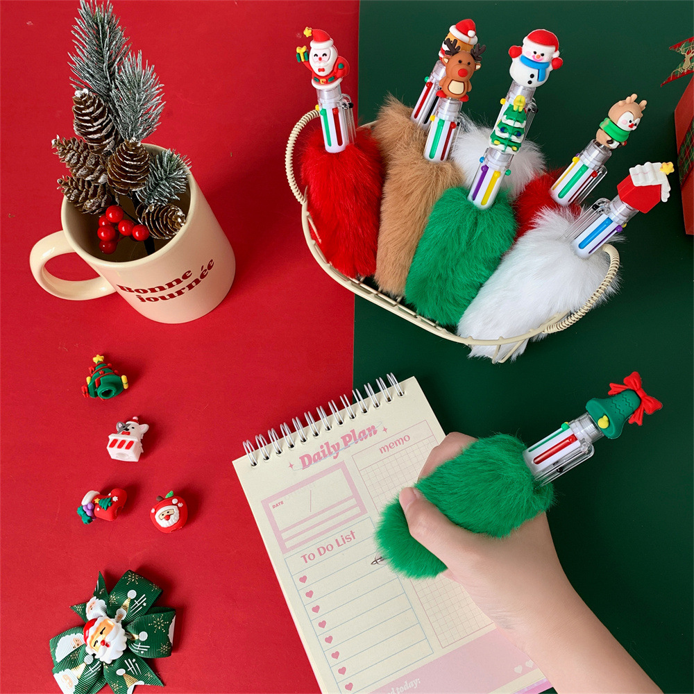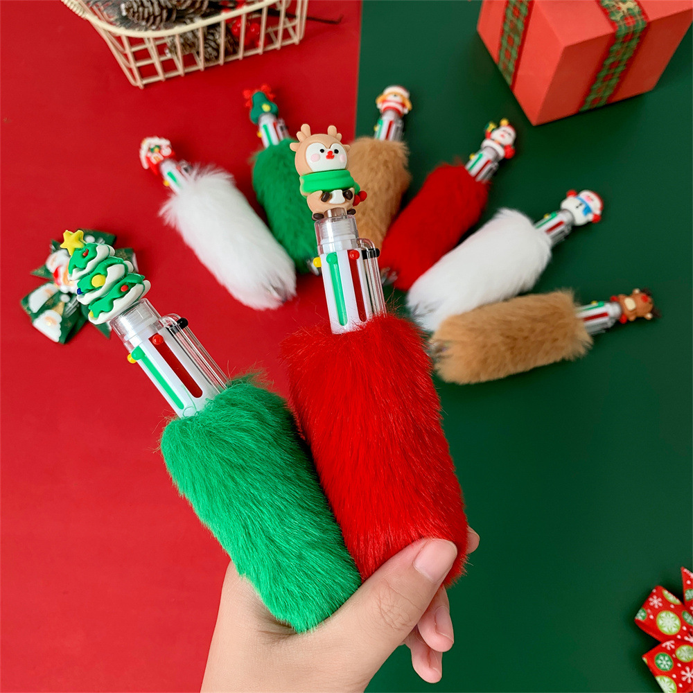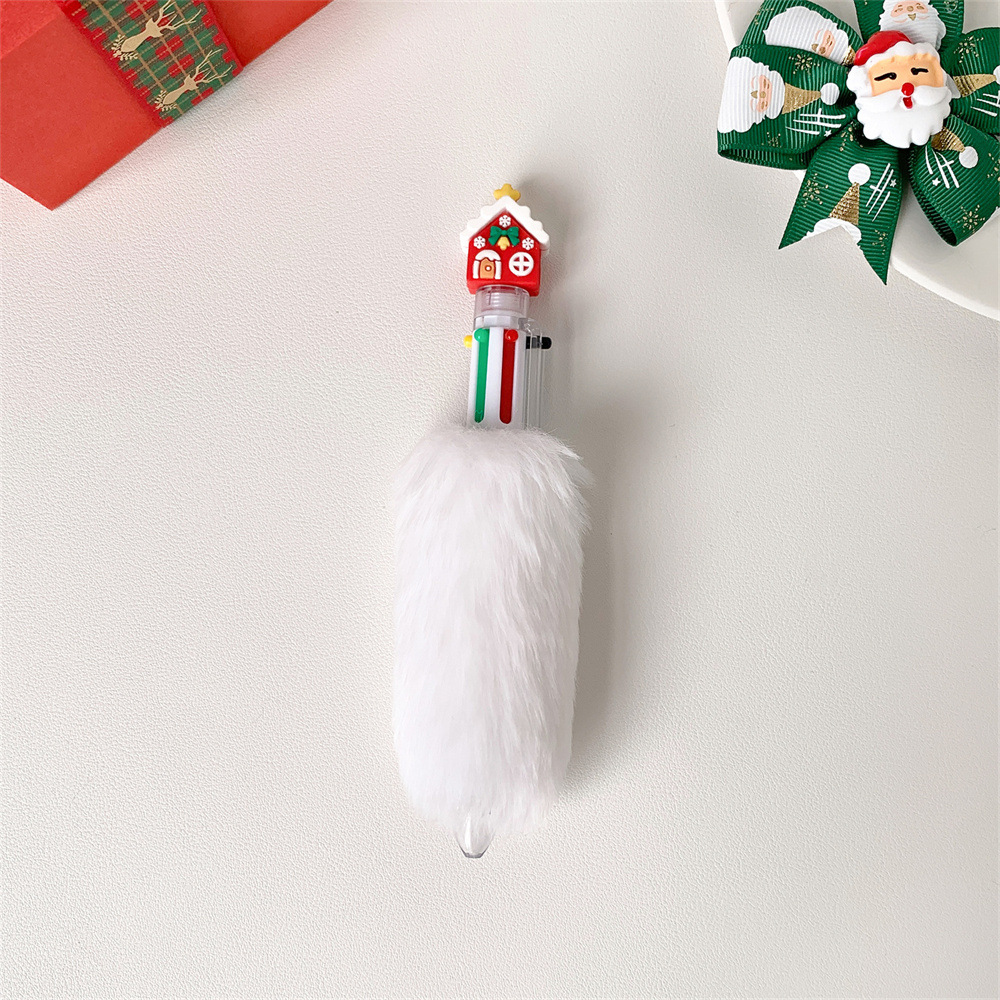 圣诞节卡通六色毛绒笔儿童按动圆珠笔圣诞纪念礼品笔学生节日礼物