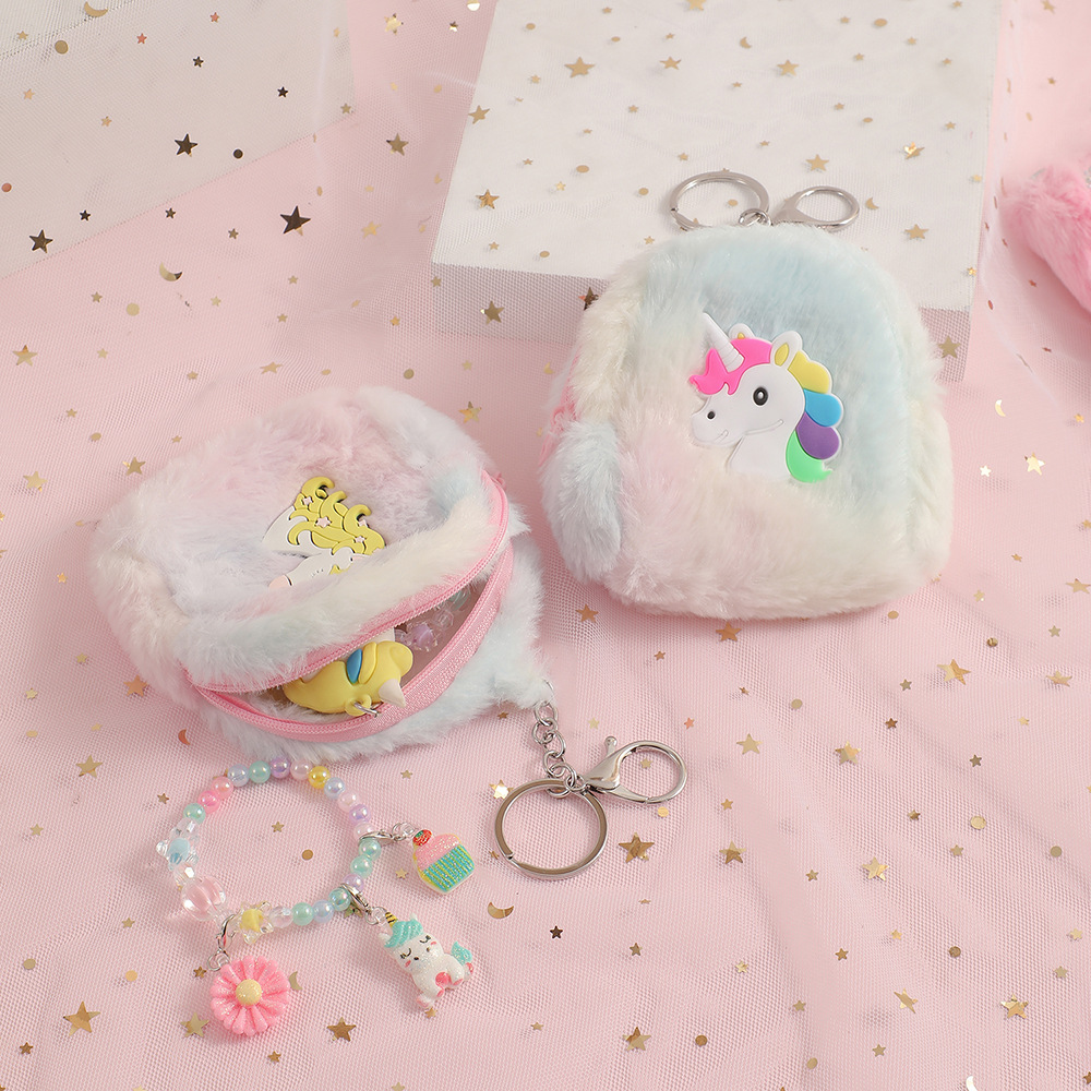 儿童卡通独角兽毛绒零钱包小书包式耳机收纳包钥匙扣挂件硬币包包