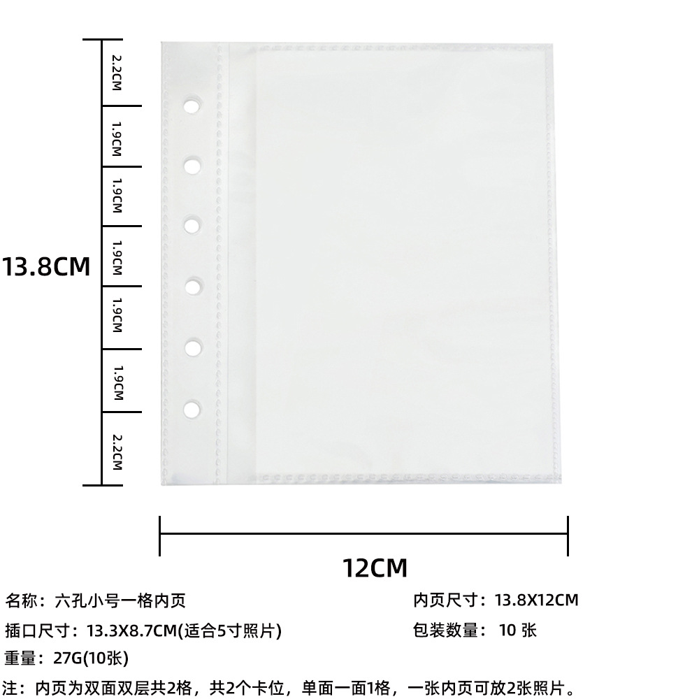 六孔内页大小: 13.8*12cm, 一格内页插口尺寸:13.3*8.7cm