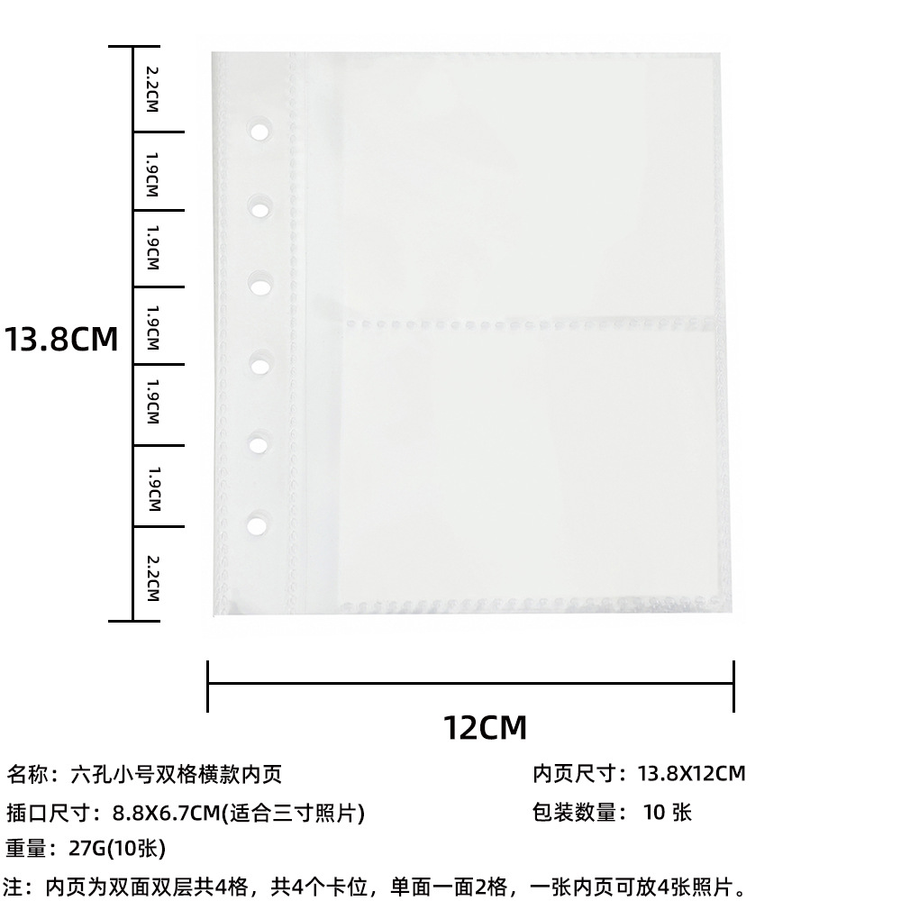 横款双格内页插口尺寸:8.8*6.7cm 六孔纸内芯大小: 12*12cm