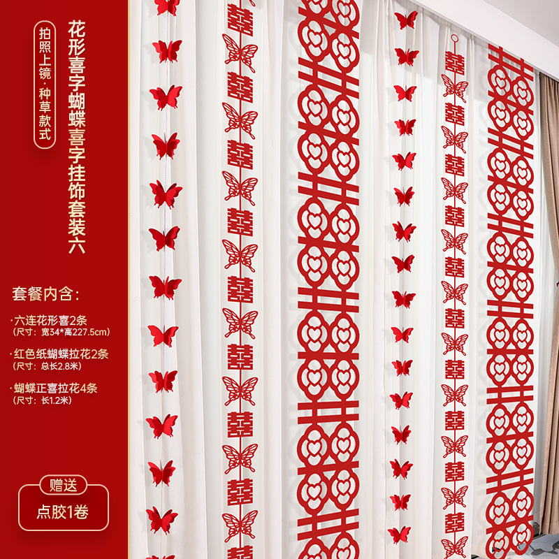 结婚立体蝴蝶拉花挂饰新房卧室长条喜字挂件窗帘装饰婚房布置套装