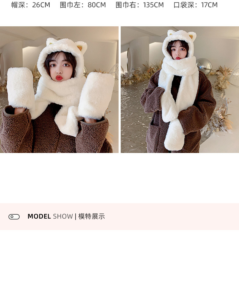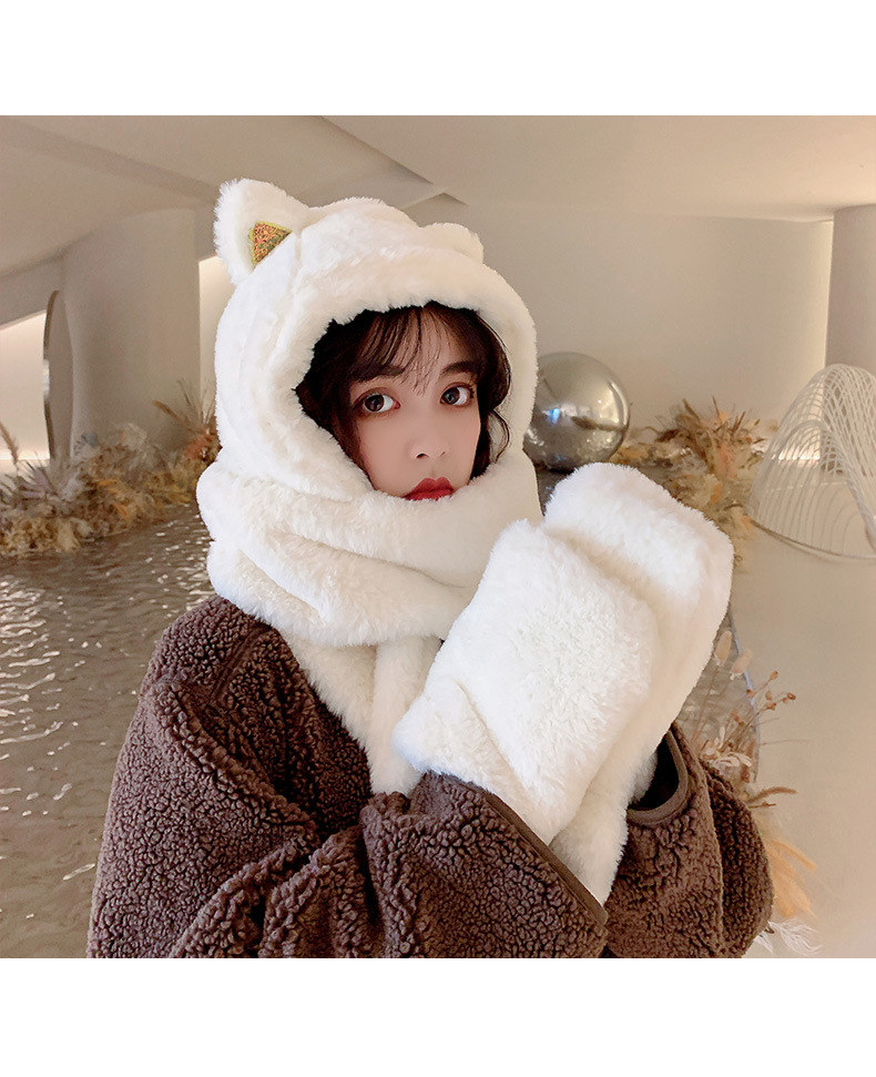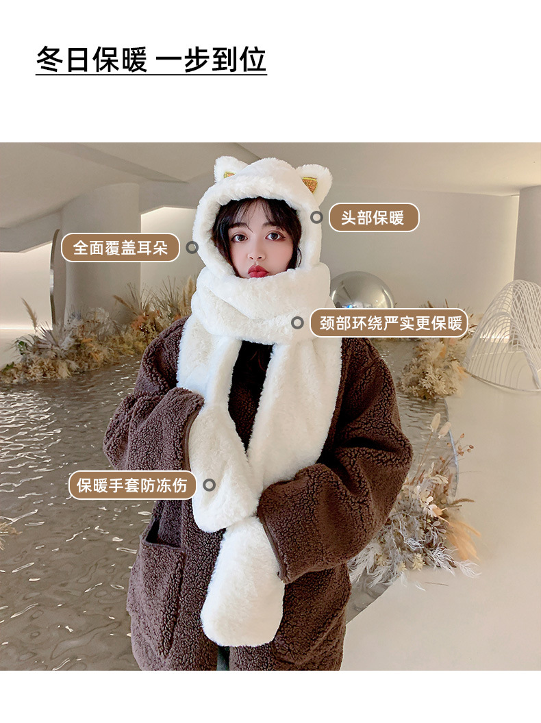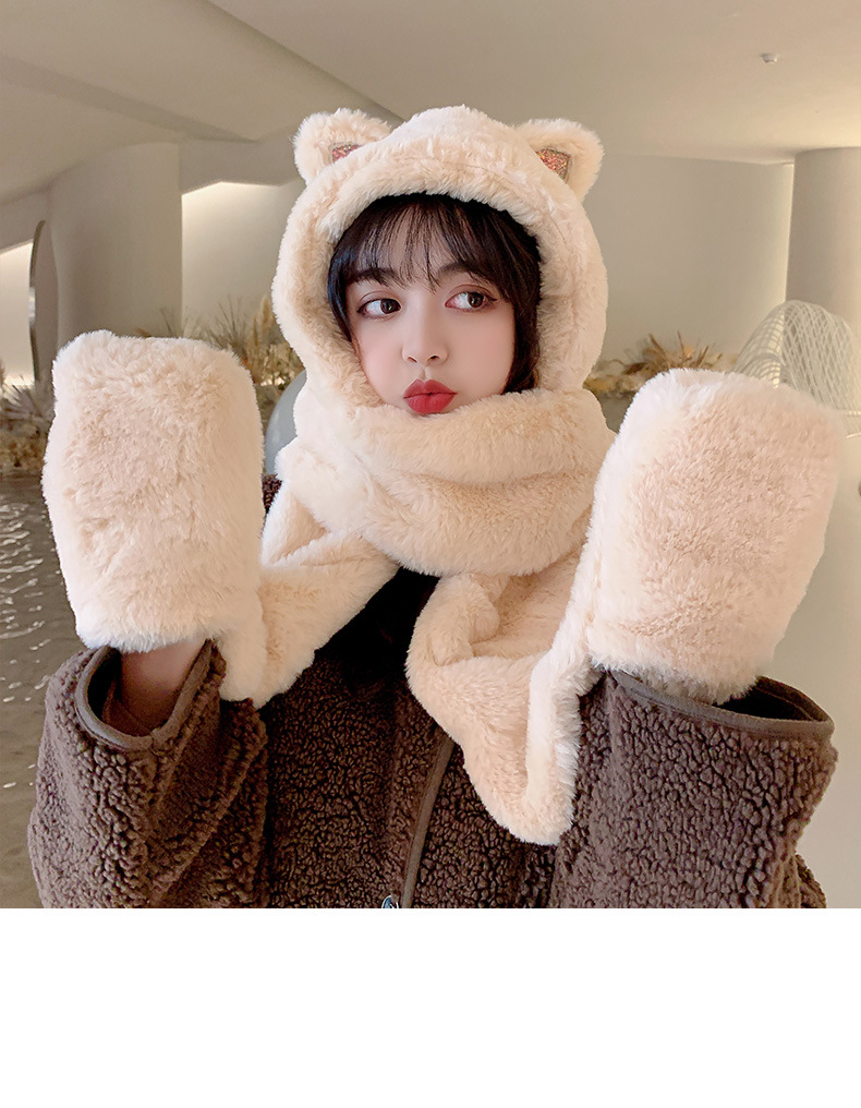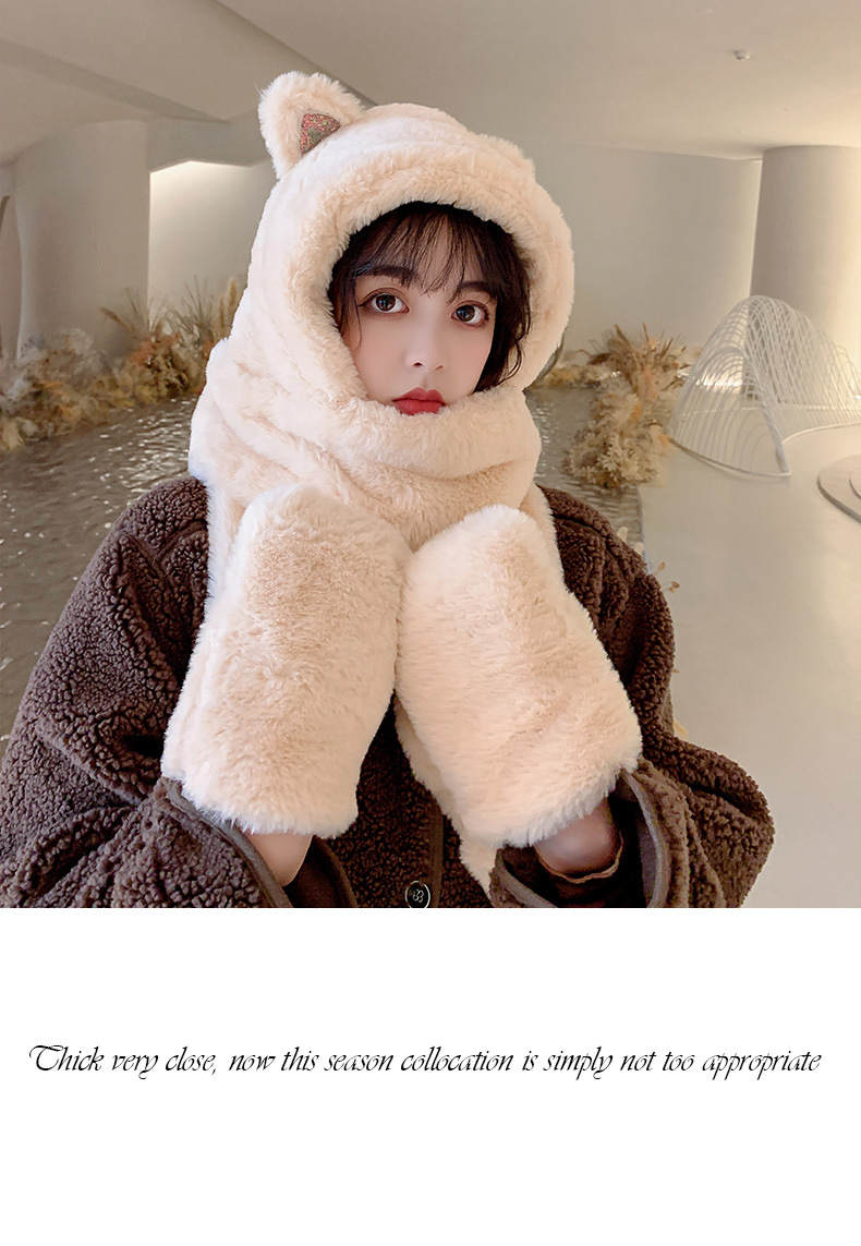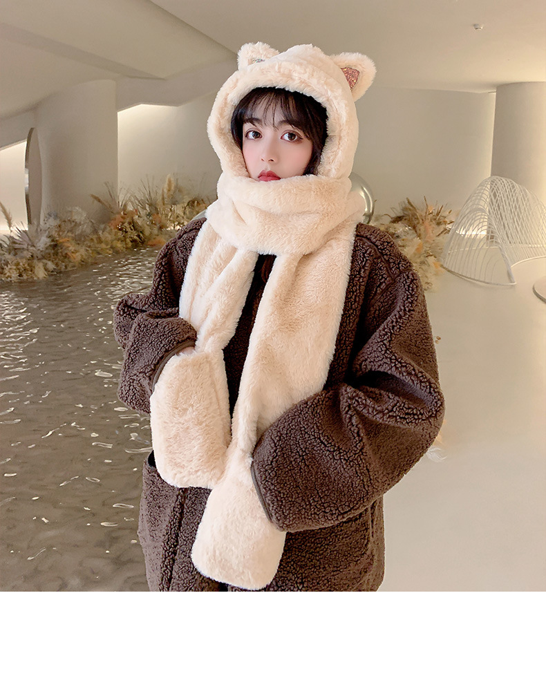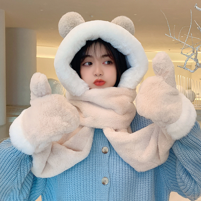 秋冬女保暖围巾帽子一体连帽可爱围脖韩版小熊毛绒护耳帽百搭冬季