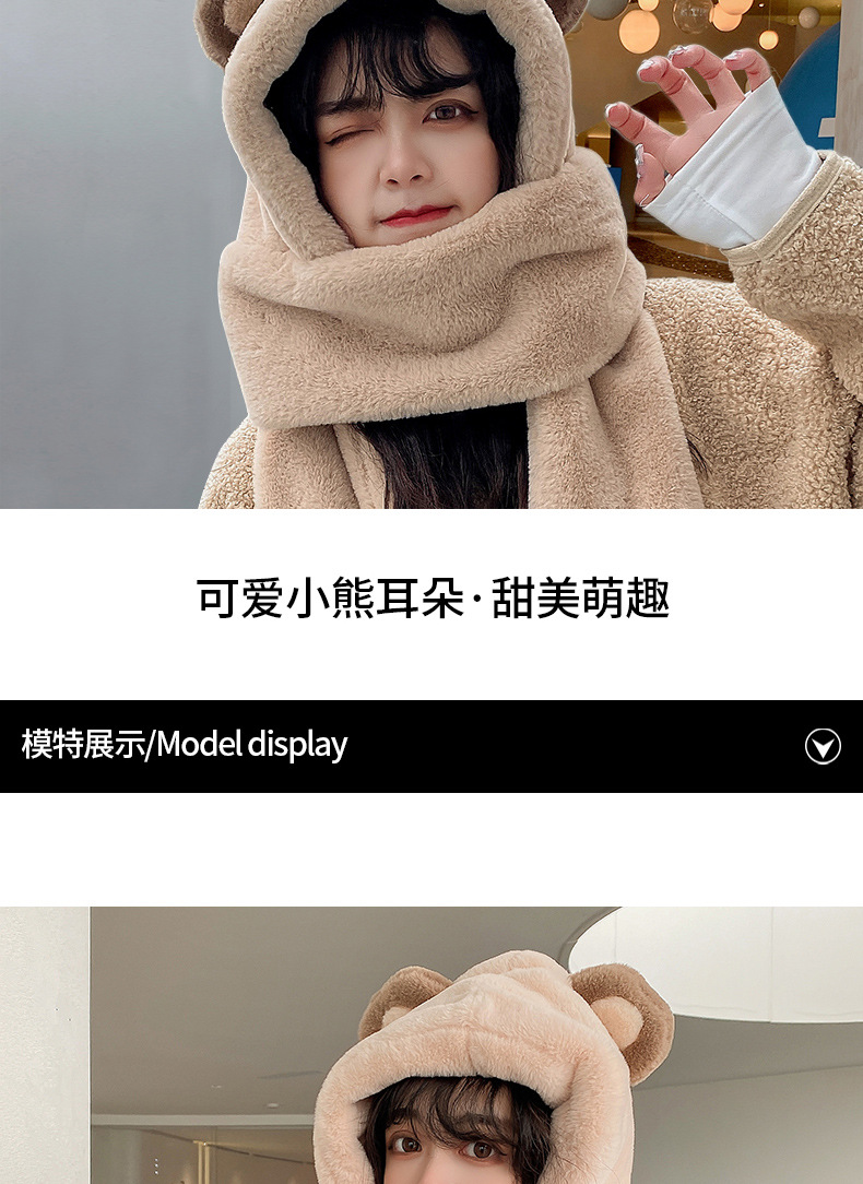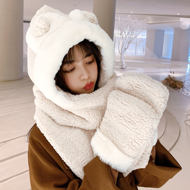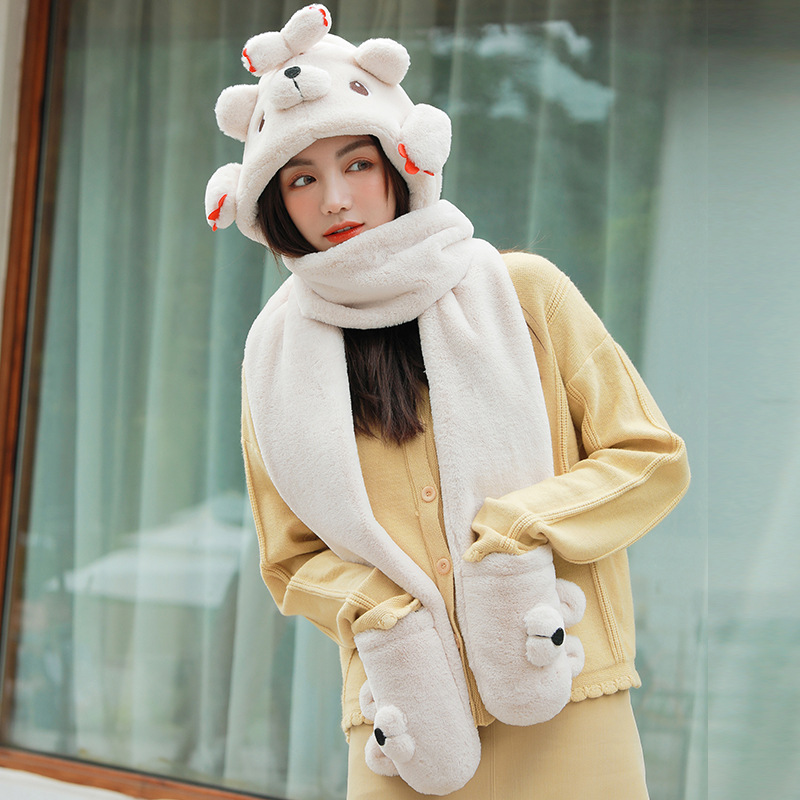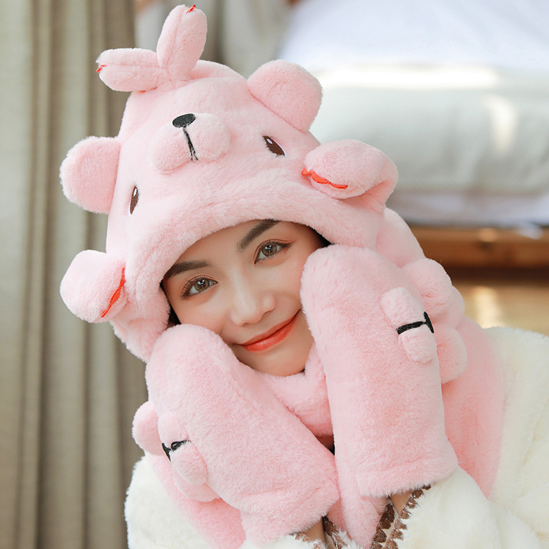 帽子三件套新款冬天韩版小熊帽子女围脖连帽秋冬季围巾手套一体帽