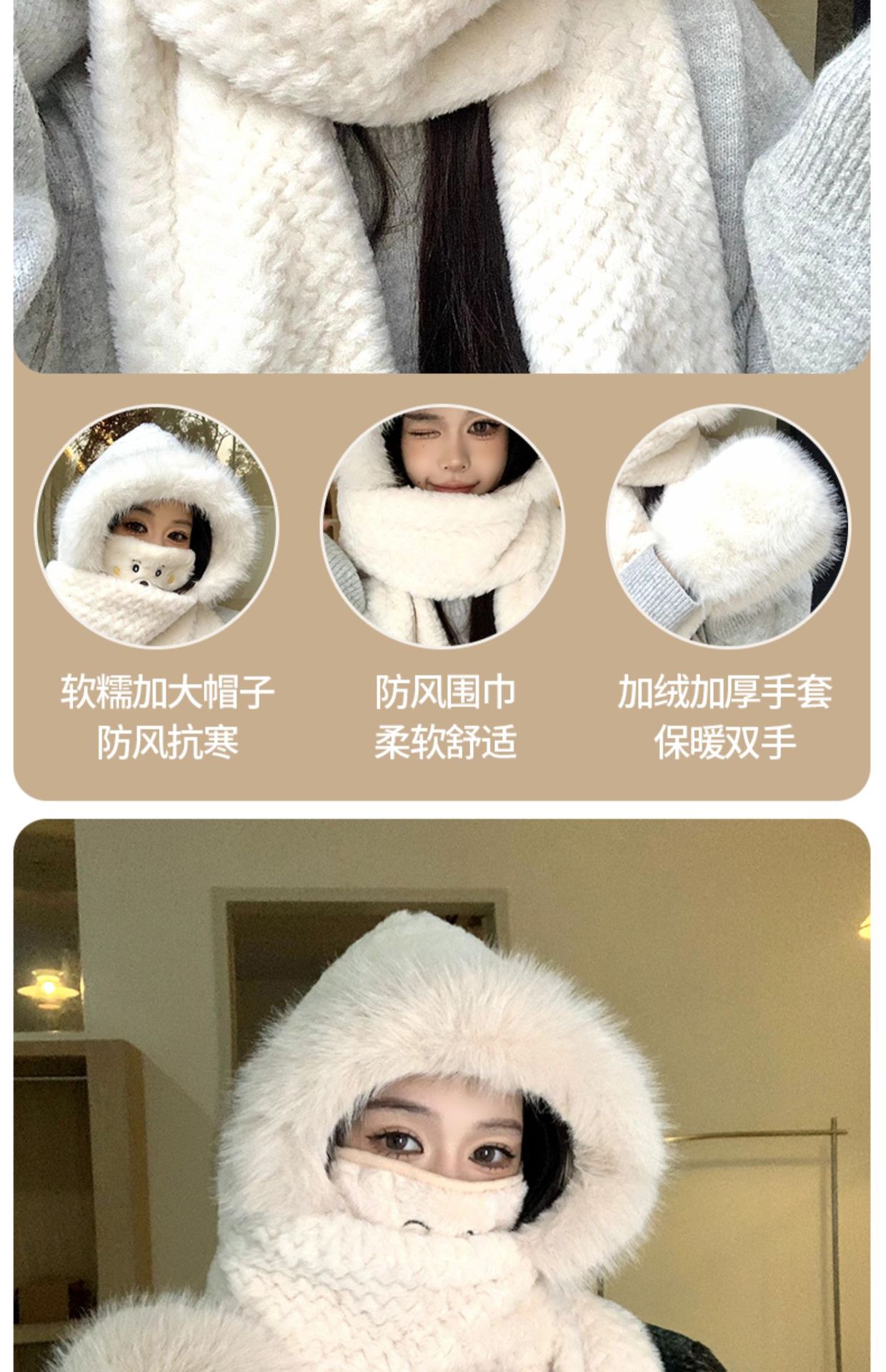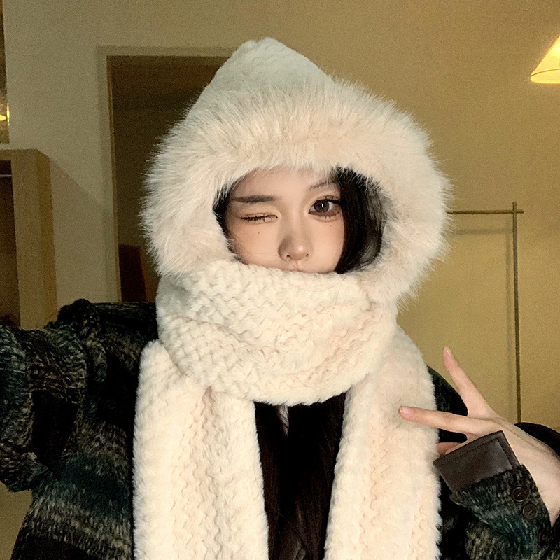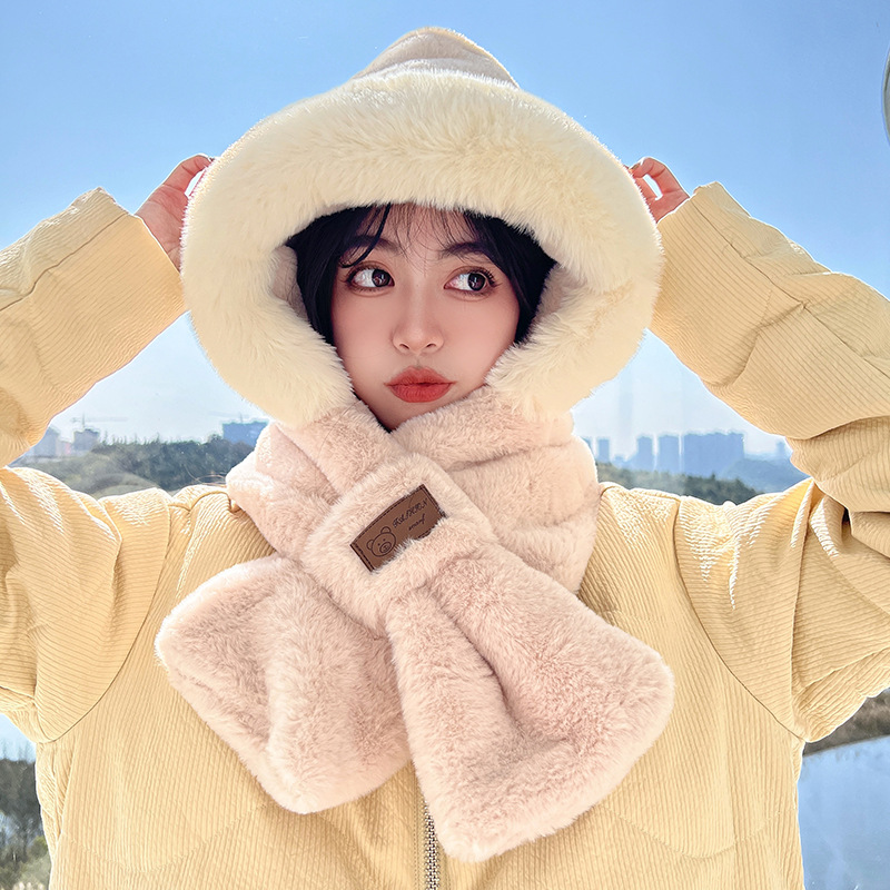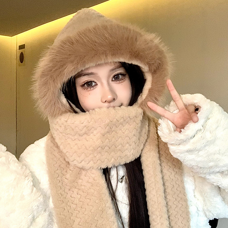 可爱毛绒帽子围巾一体三件套女秋冬2023新款骑行防风保暖加厚围脖