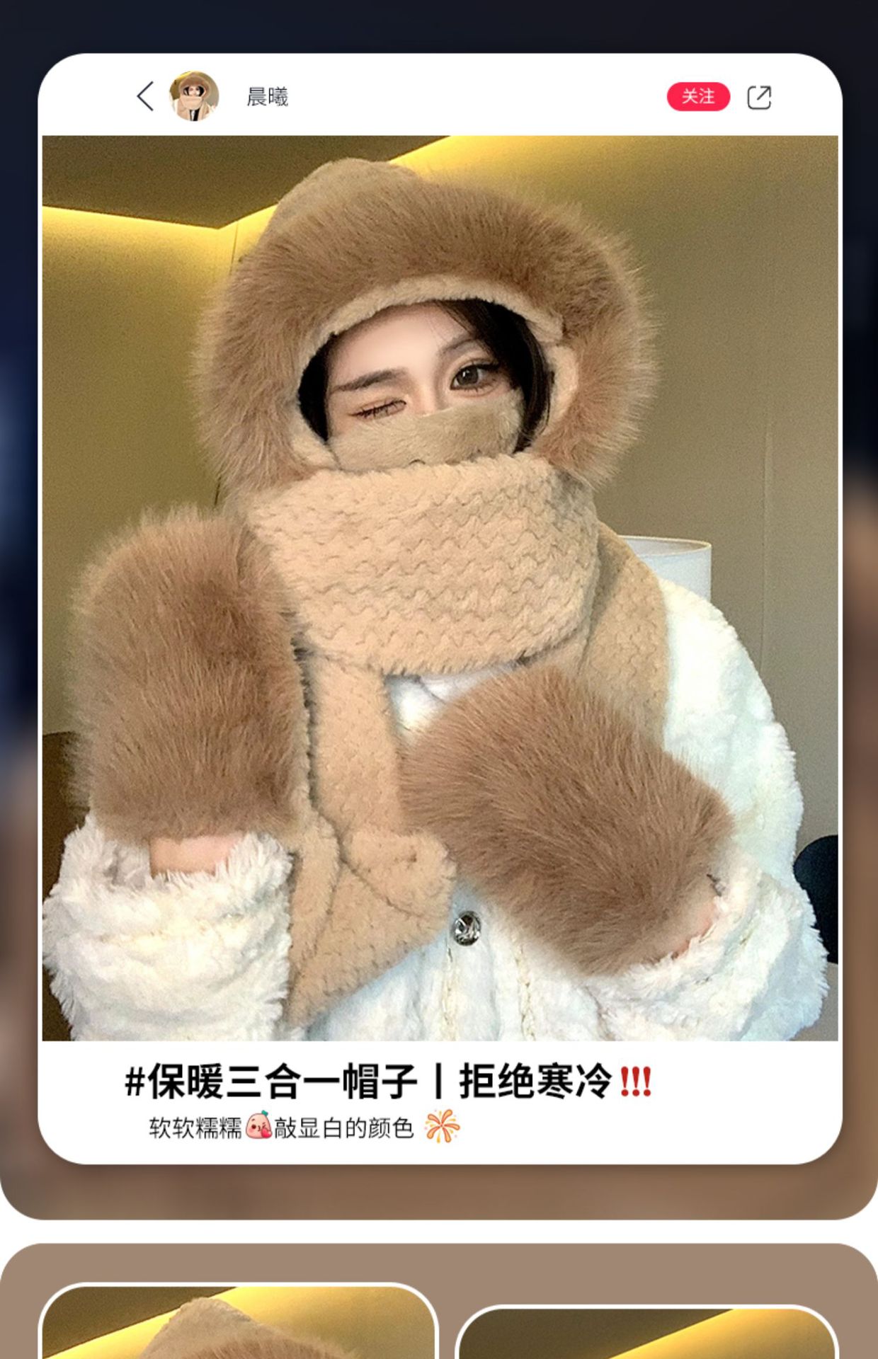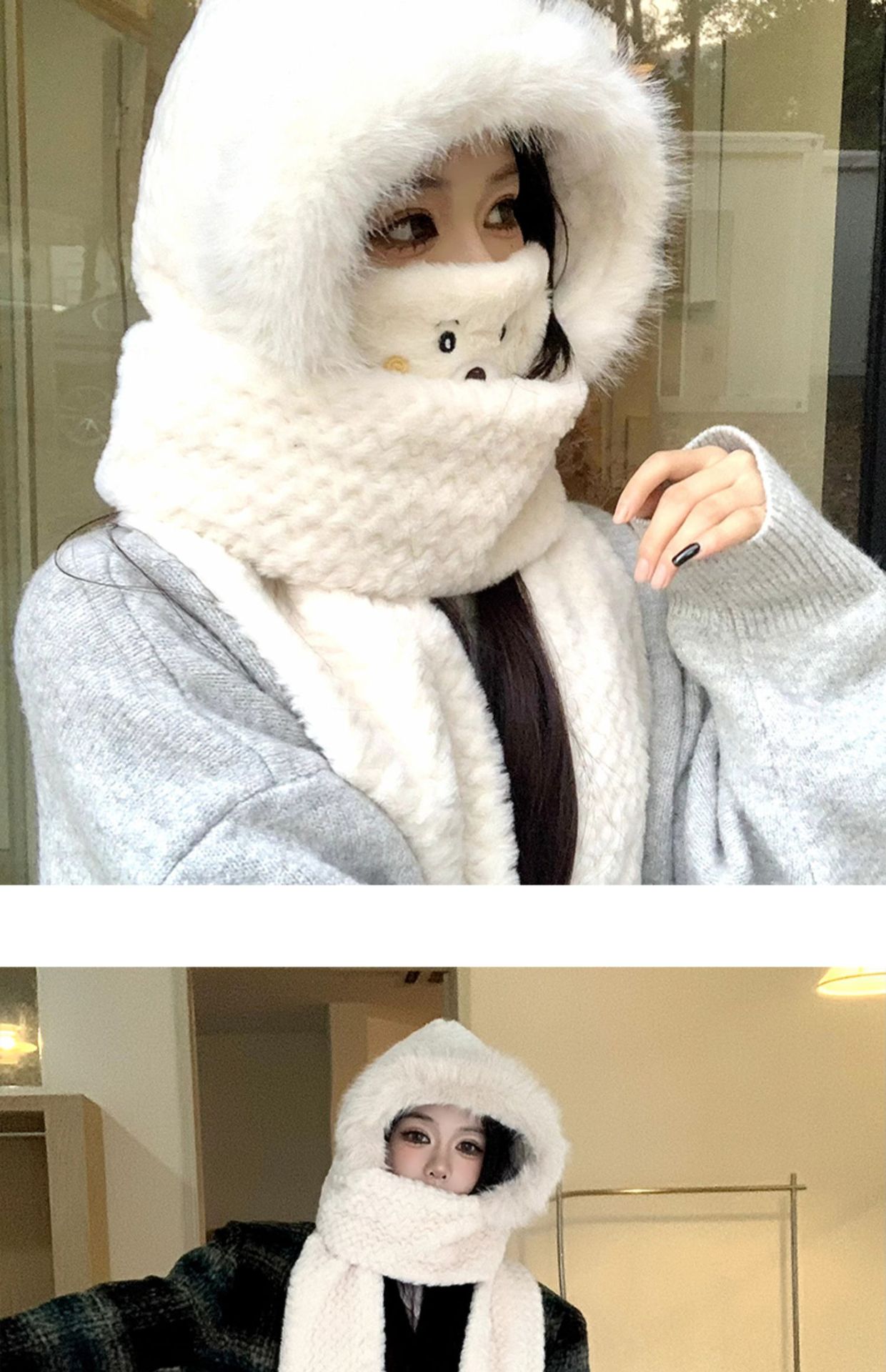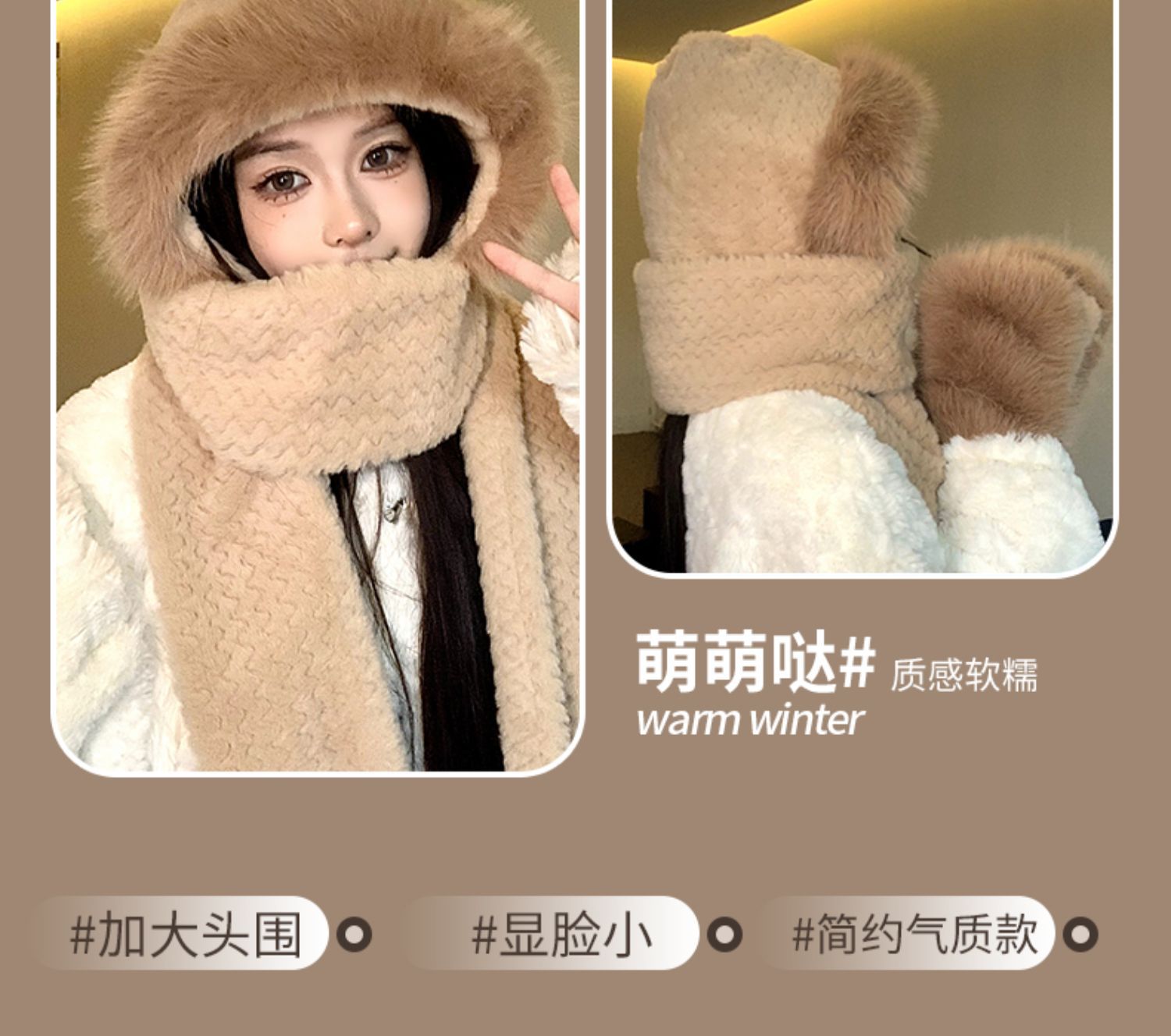 可爱毛绒帽子围巾一体三件套女秋冬2023新款骑行防风保暖加厚围脖