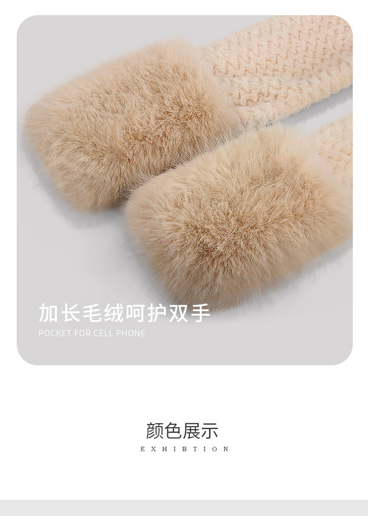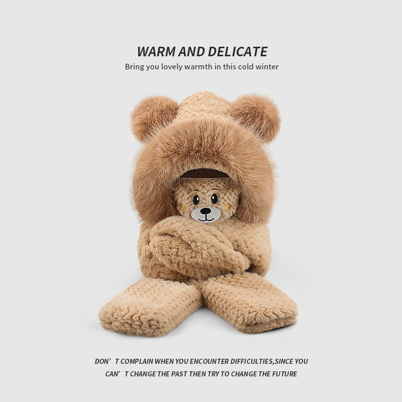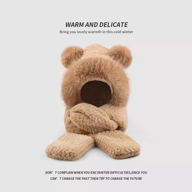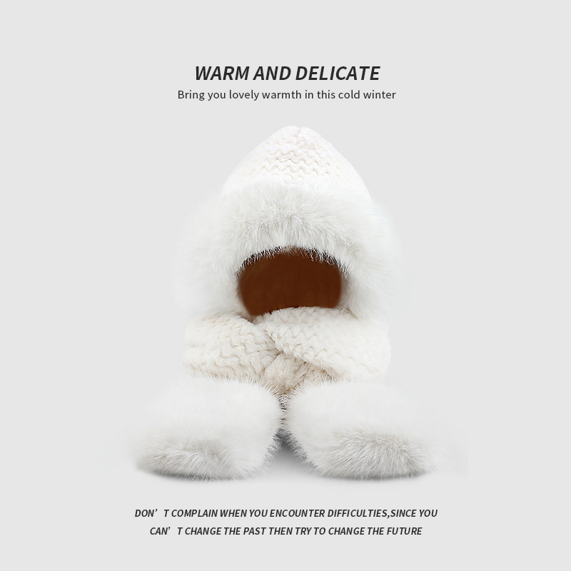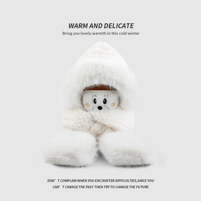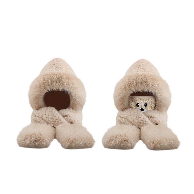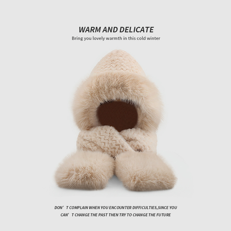 毛绒帽子围巾手套一体女秋冬季骑车防寒护耳百搭加厚保暖连帽纯色