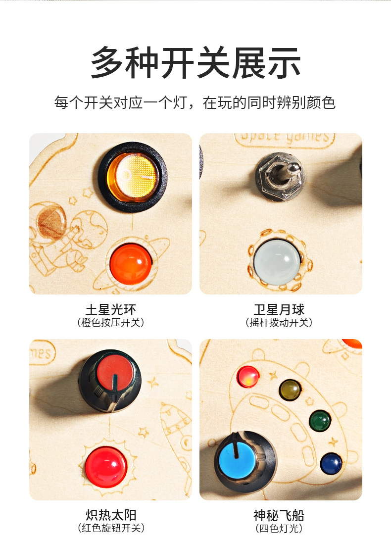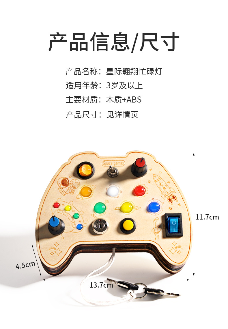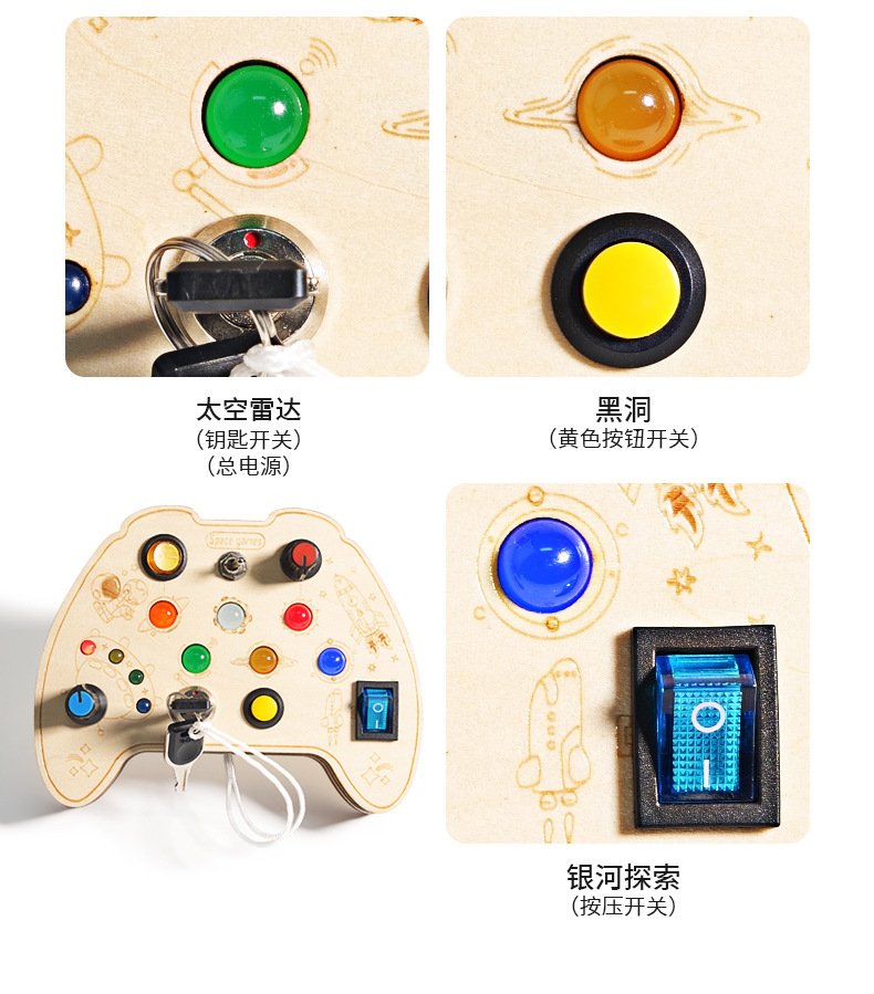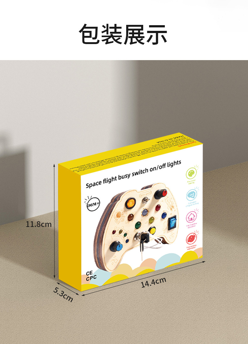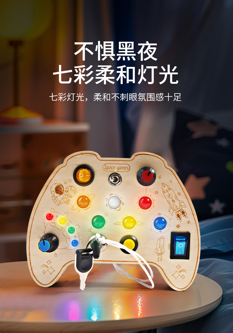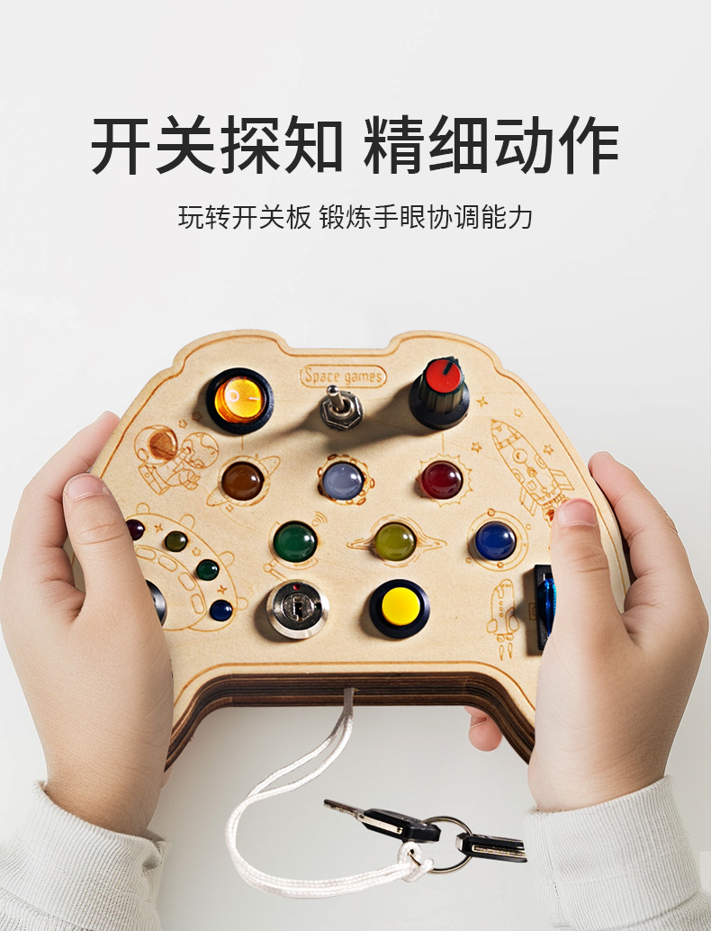 跨境木质游戏手柄LED灯电源开关按钮忙碌板儿童蒙氏早教益智玩具