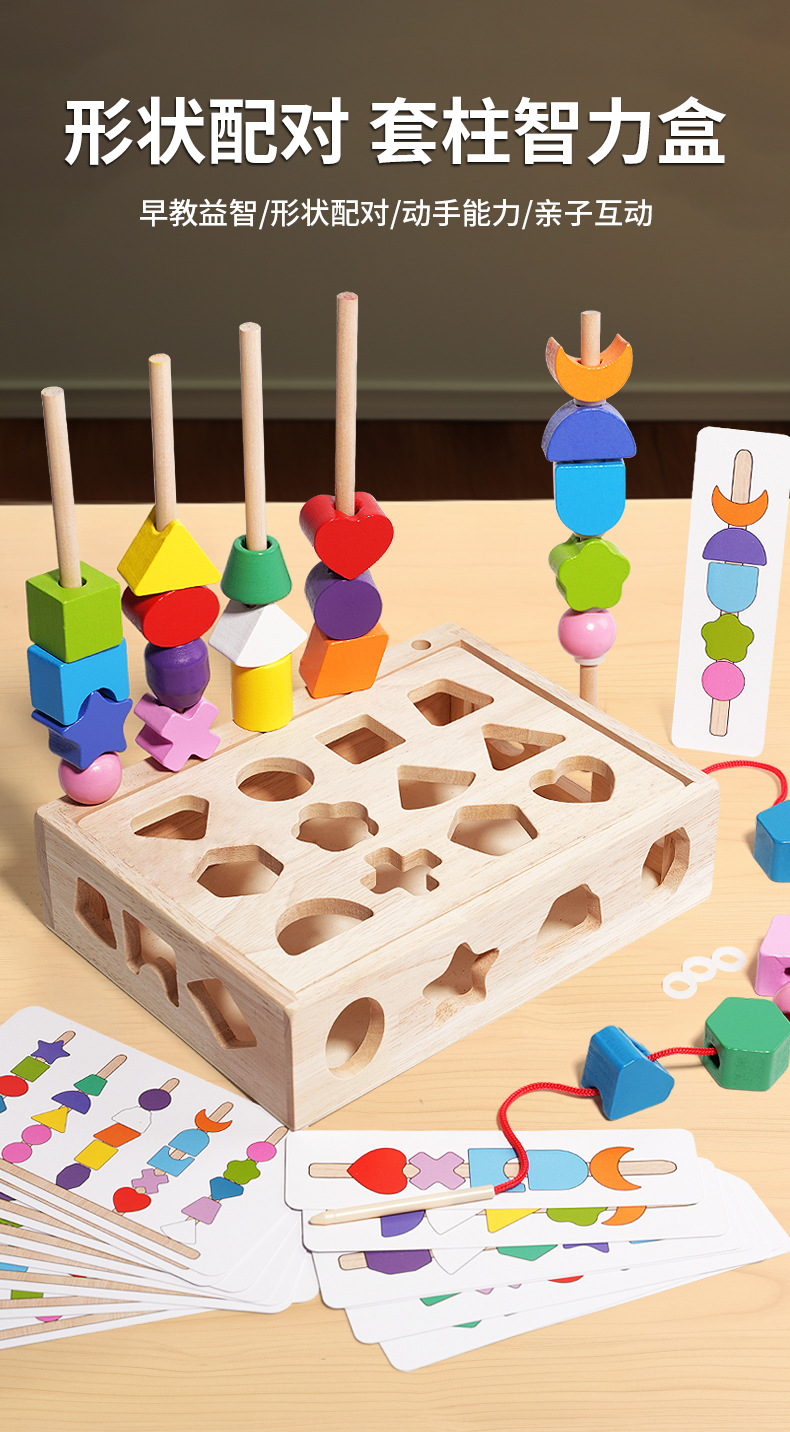 儿童木制五套柱积木串珠几何形状配对智力盒颜色认知益智积木玩具