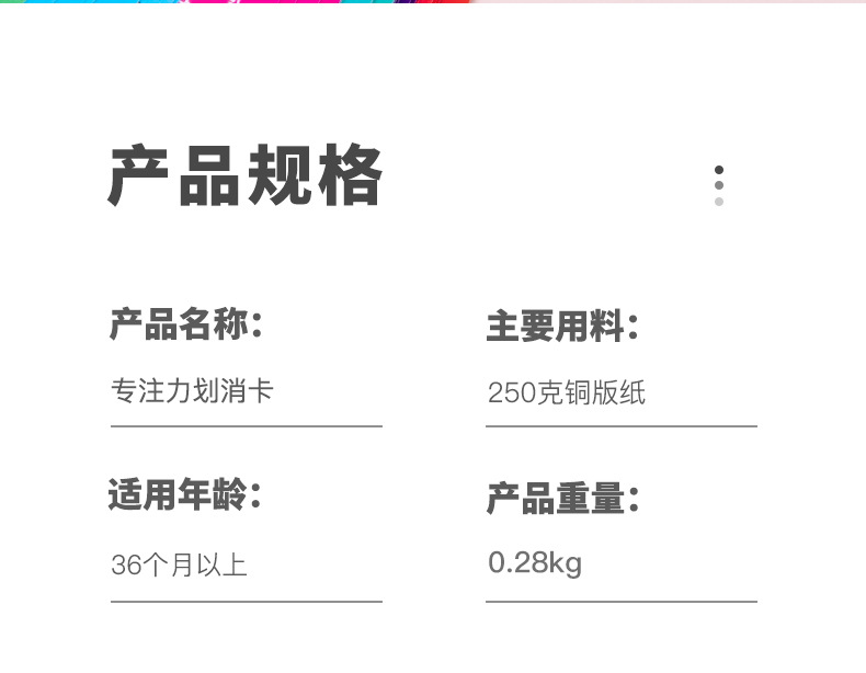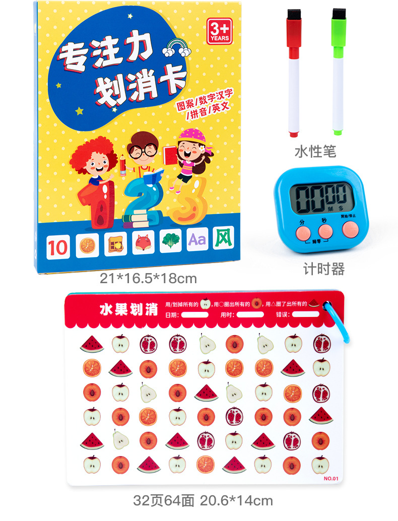 专注力划消卡:产品尺寸:16.7*21*1.7CM 装箱数:60个 装箱重量:17.5/17kg 外箱尺寸:52*43.5*19.5CM