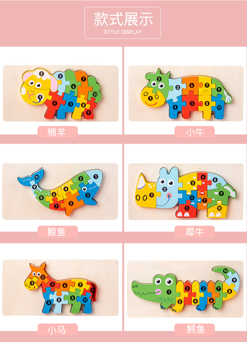 木质3d立体拼图儿童益智早教动物交通认知配对积木制拼图玩具批发