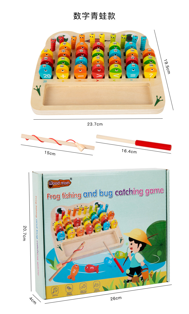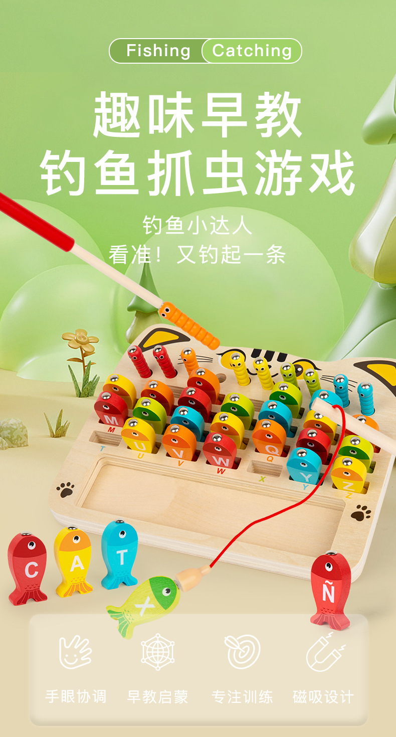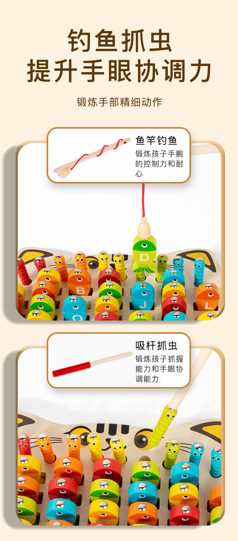 儿童木制磁性钓鱼抓虫游戏宝宝手眼协调英文认知数学运算益智玩具