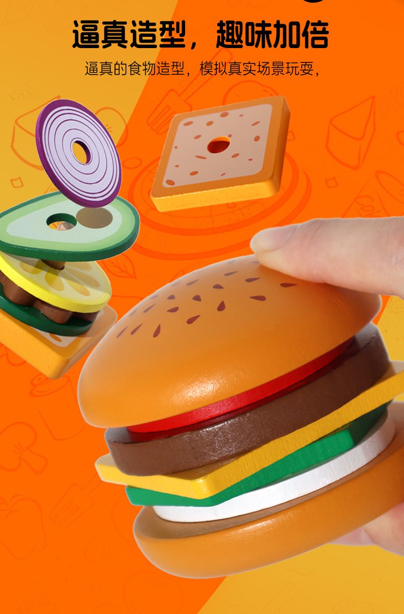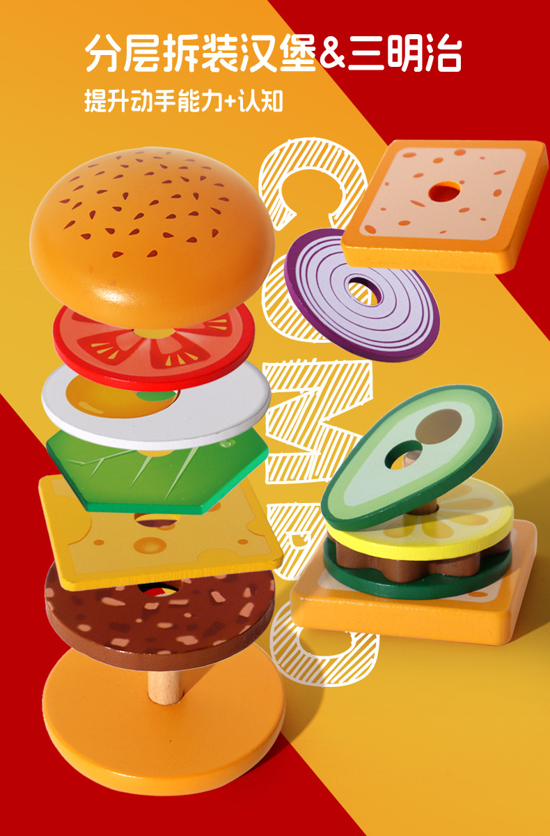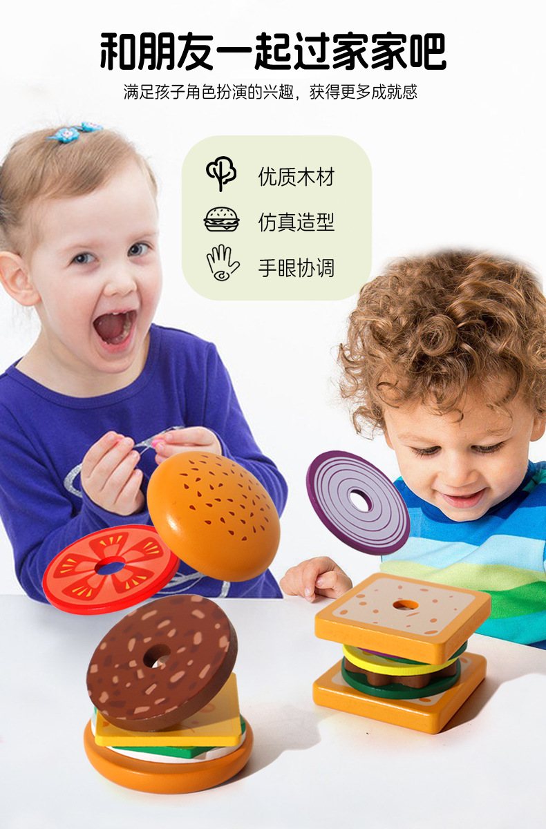 儿童木质仿真汉堡三明治套装食物拼装配对套柱过家家早教益智玩具