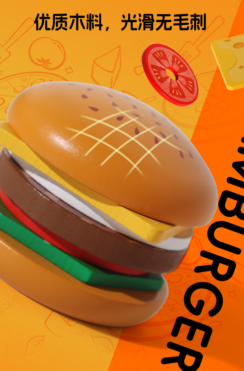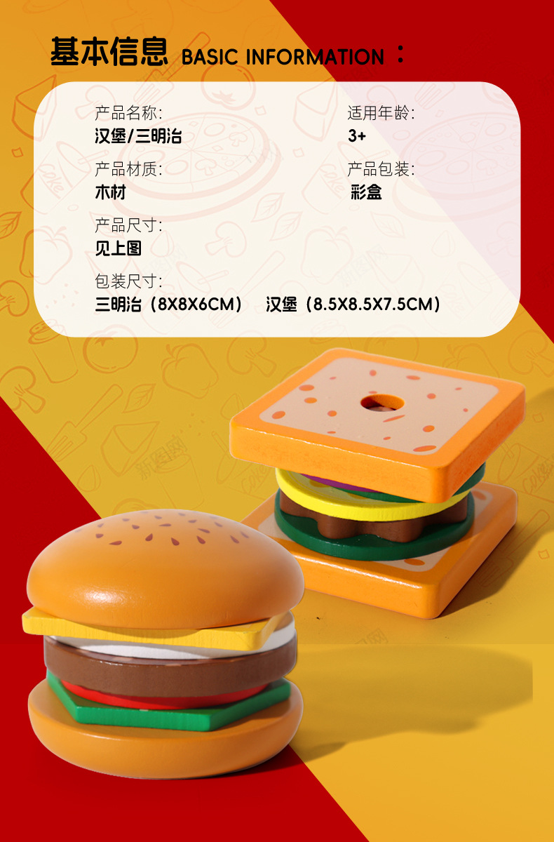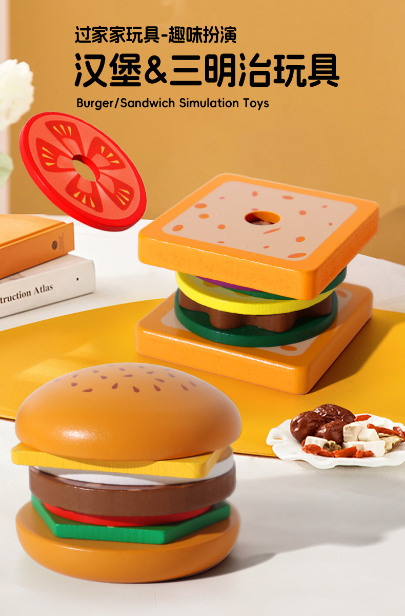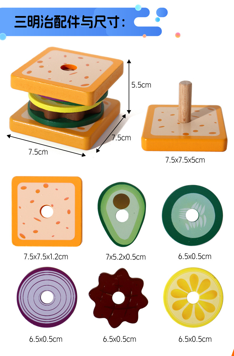 儿童木质仿真汉堡三明治套装食物拼装配对套柱过家家早教益智玩具