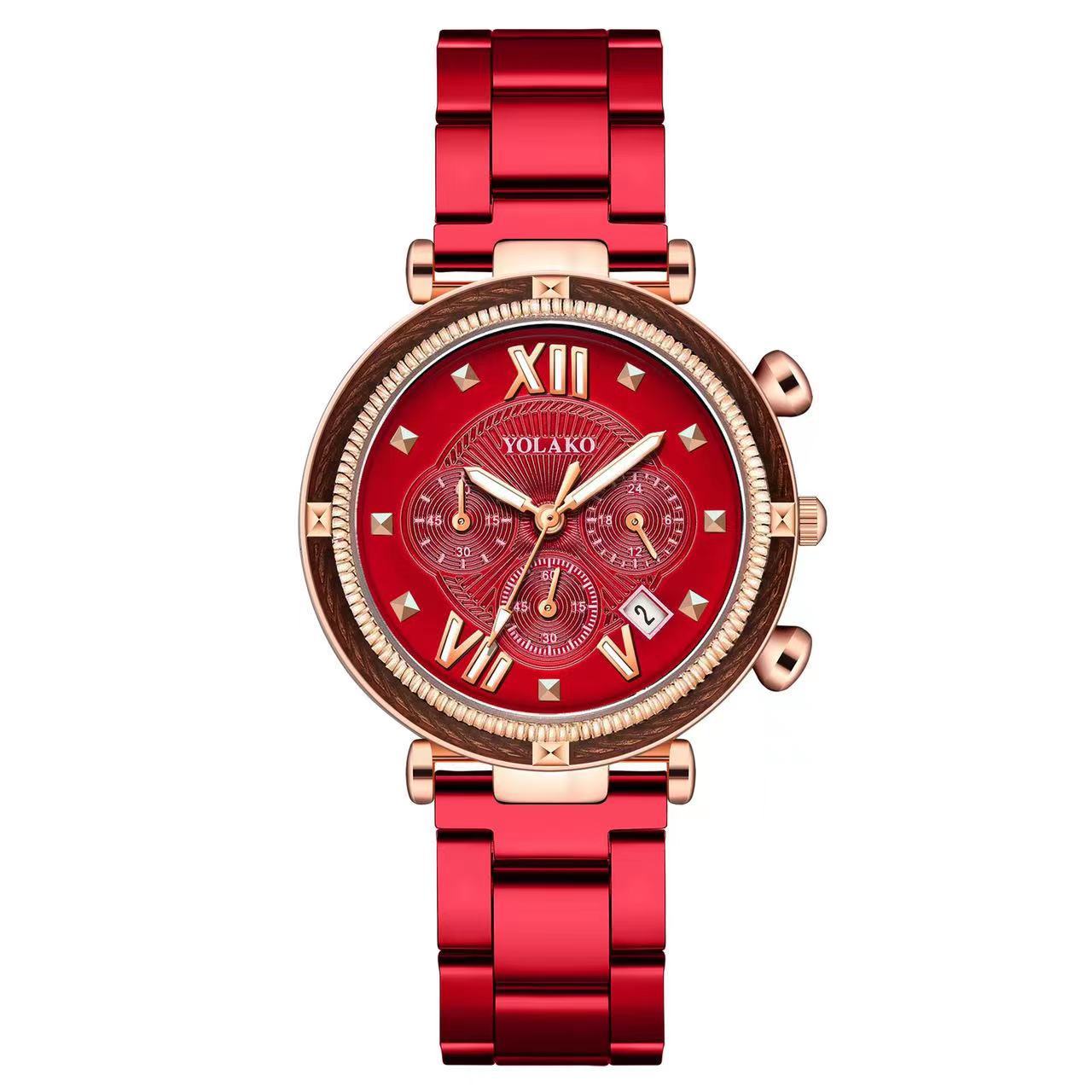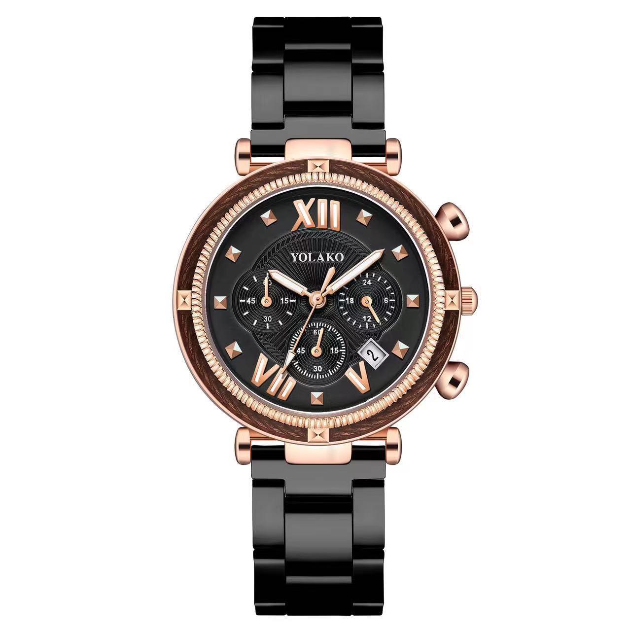 外贸爆款新款假三眼带日历女士手表 时尚百搭钢带女士腕表石英表