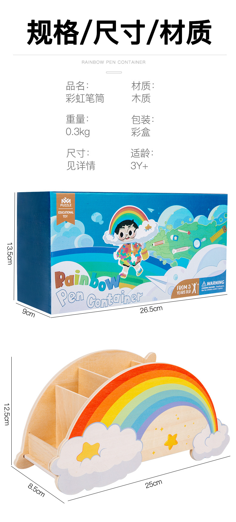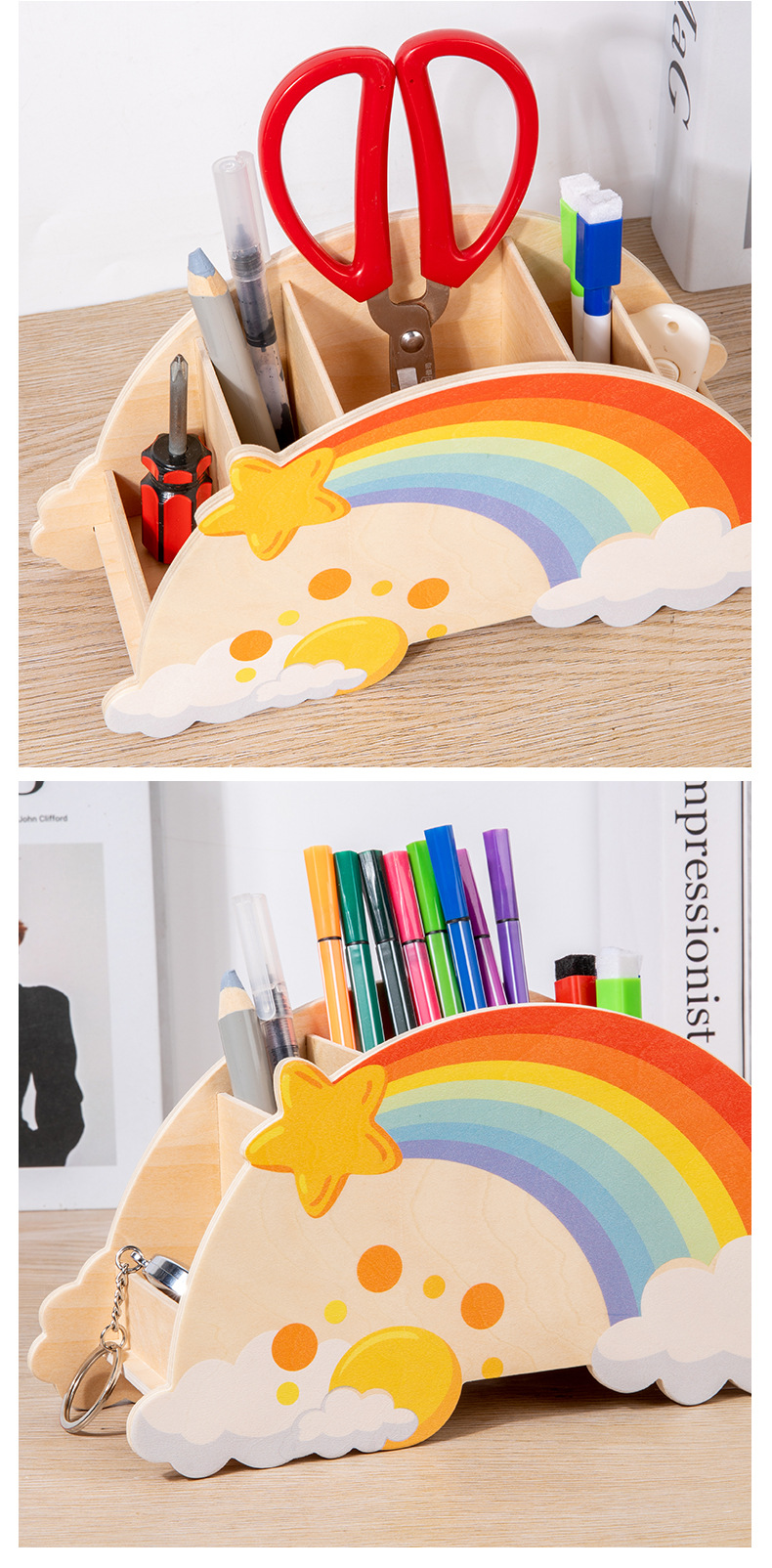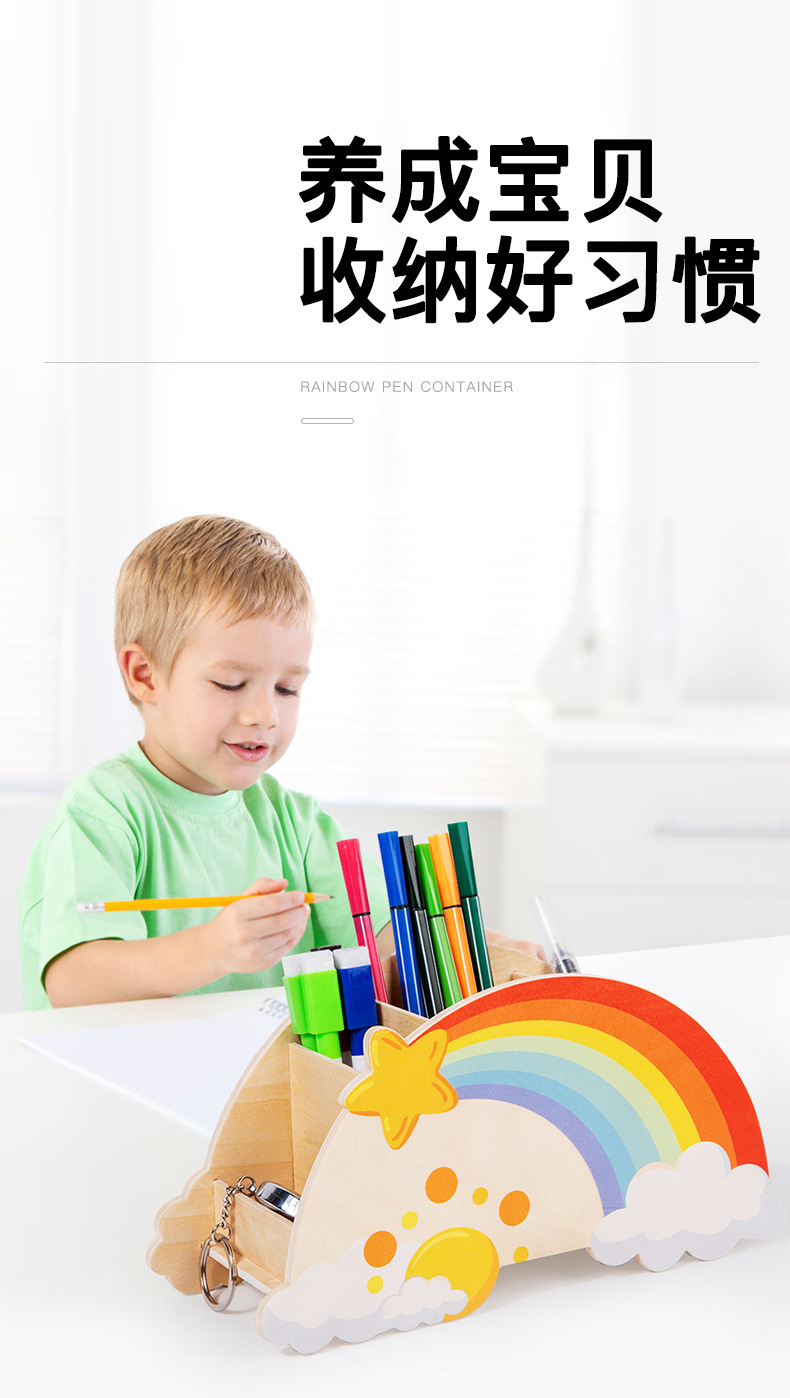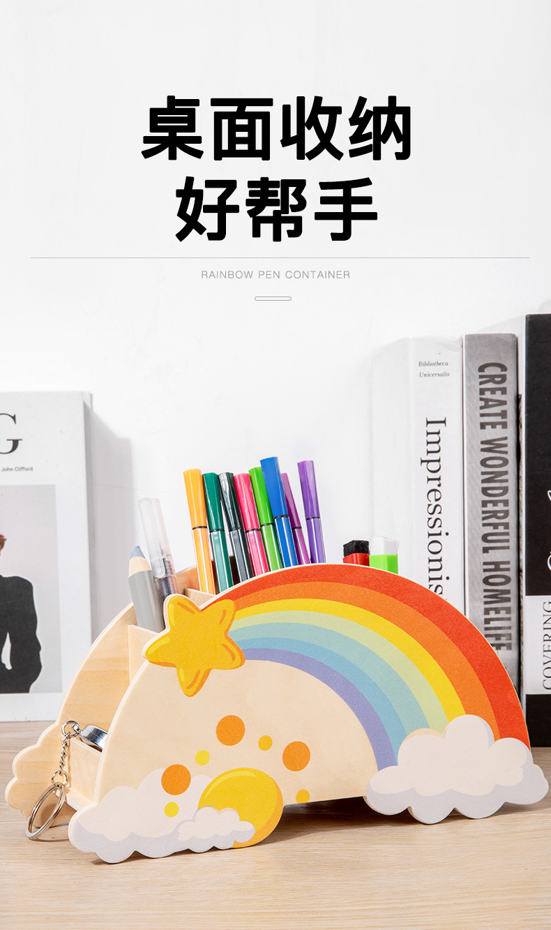 儿童木质创意彩虹笔筒家用桌面摆件办公学习用品文具收纳筒玩具
