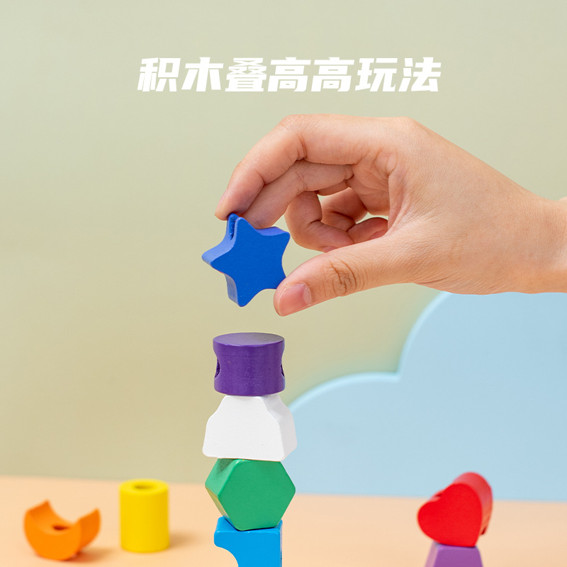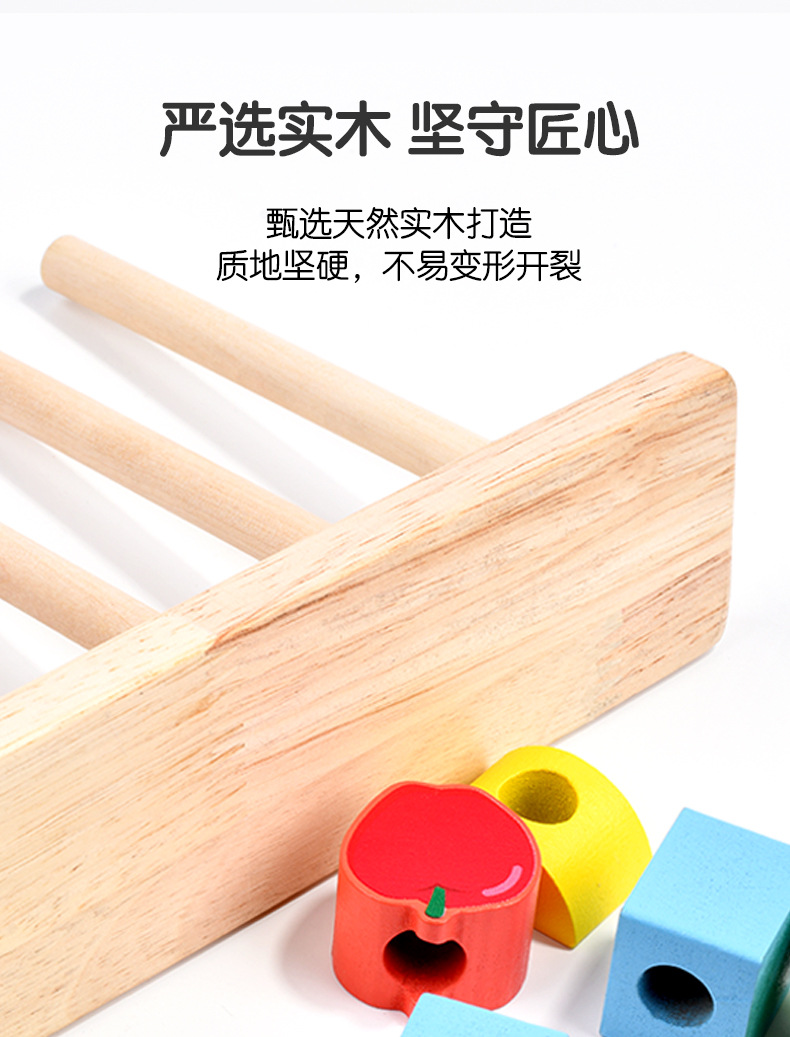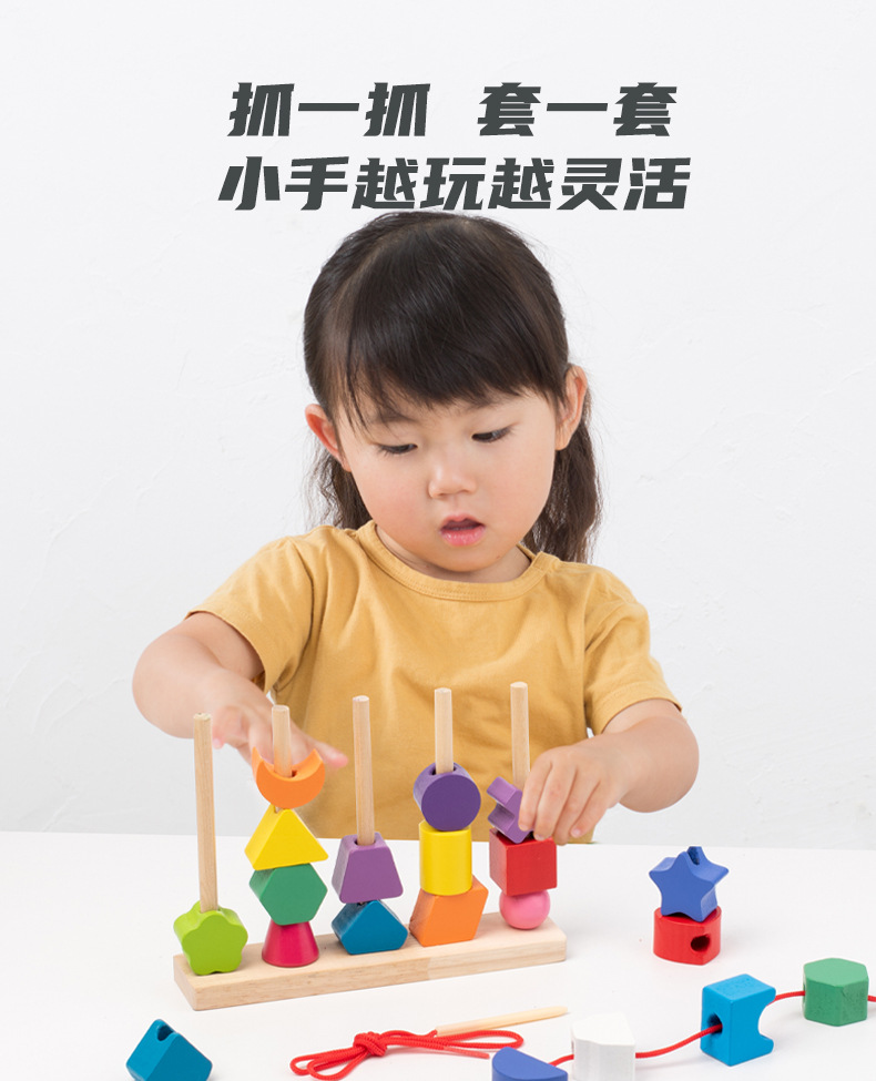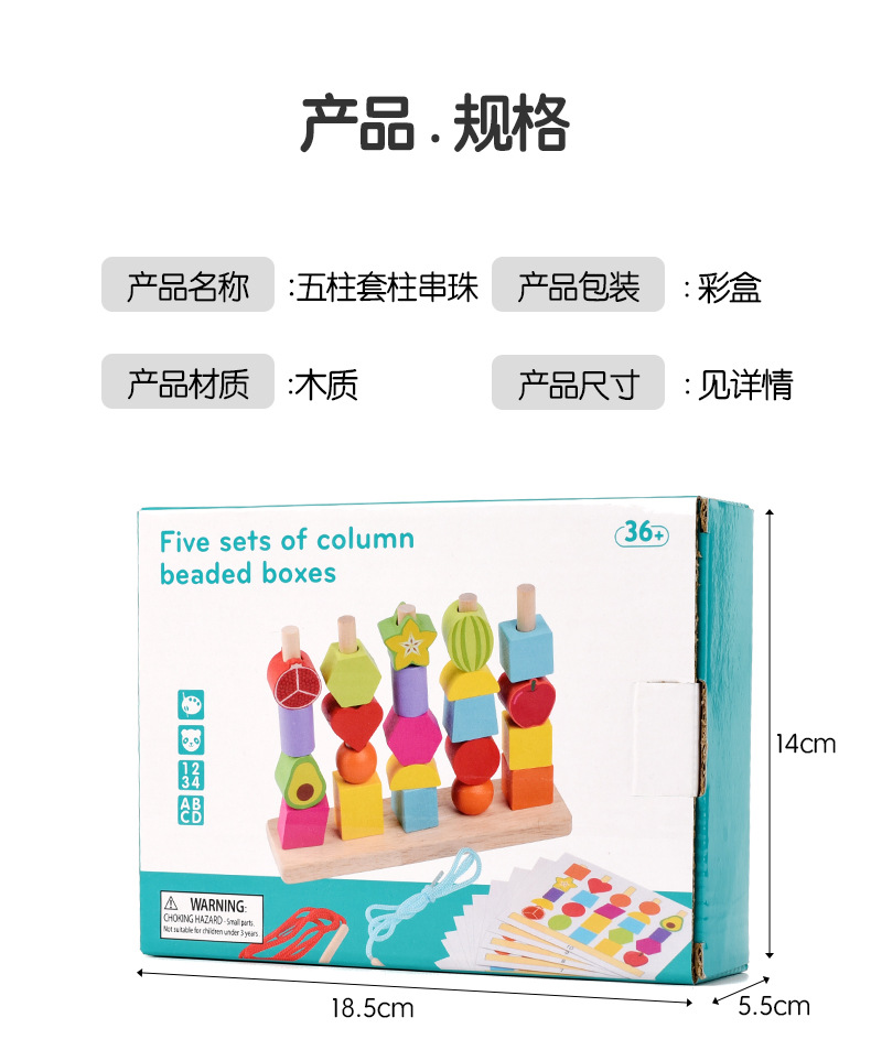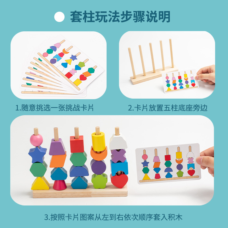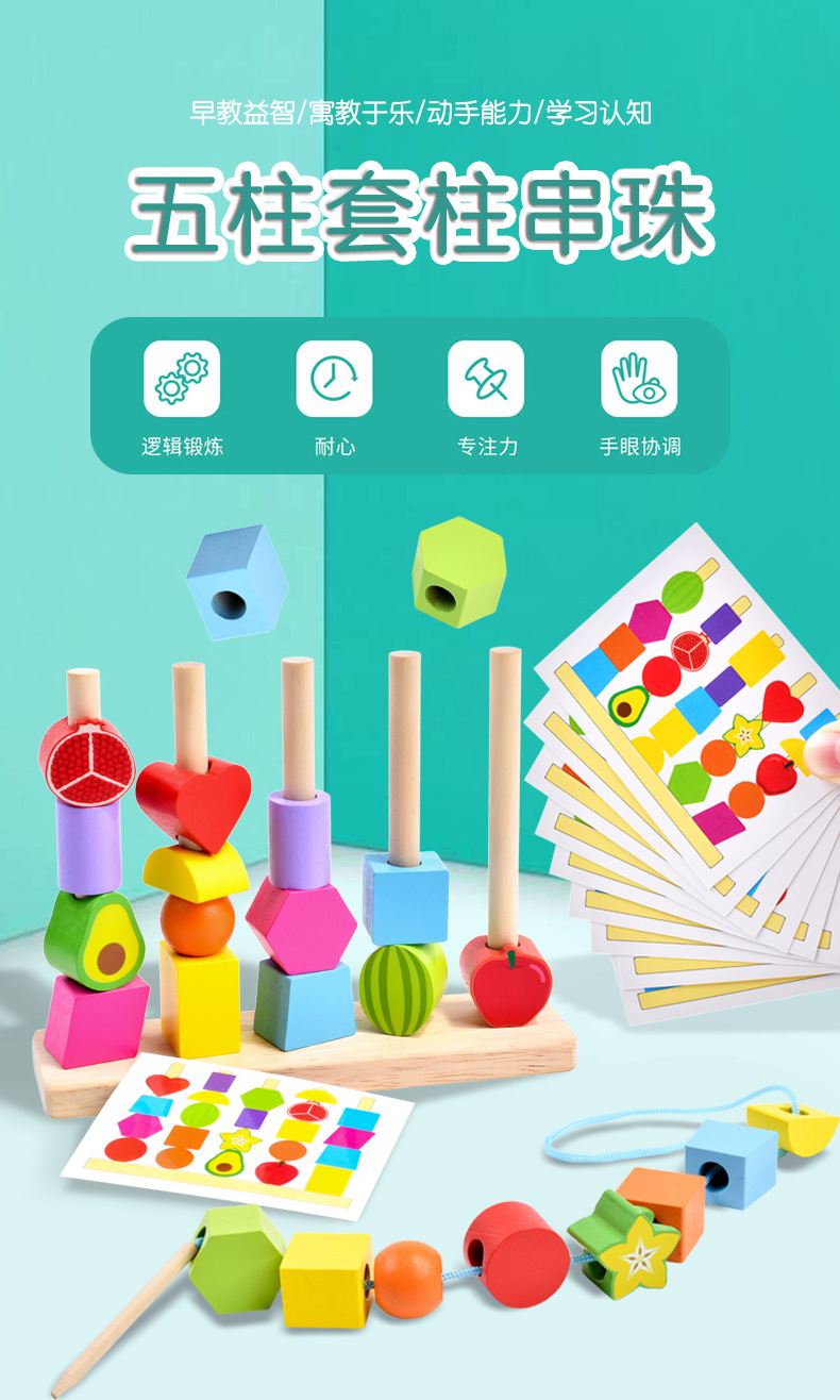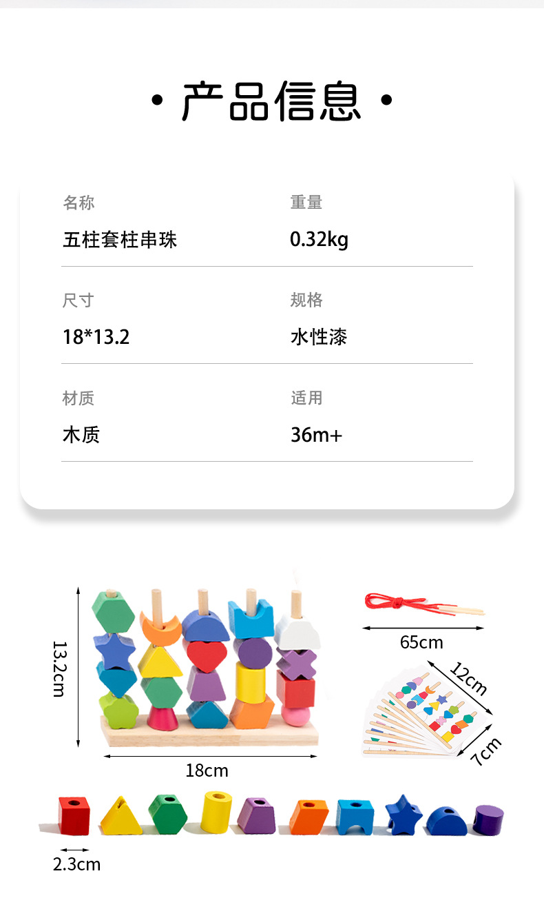 儿童木质五套柱串珠几何形状配对颜色认知启蒙早教益智积木玩具