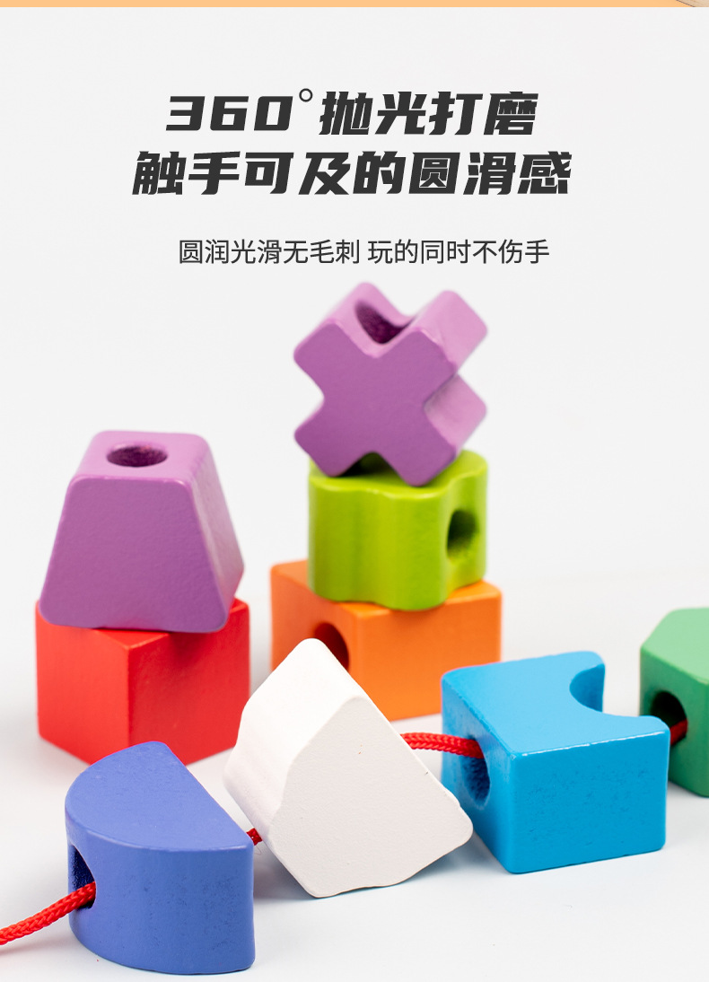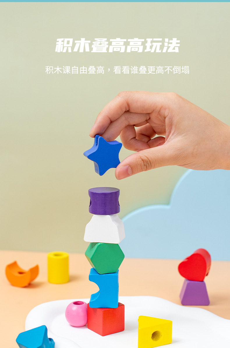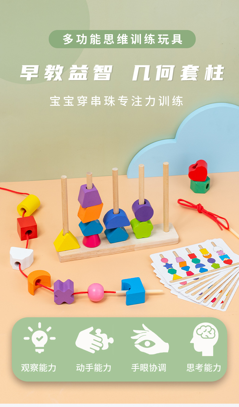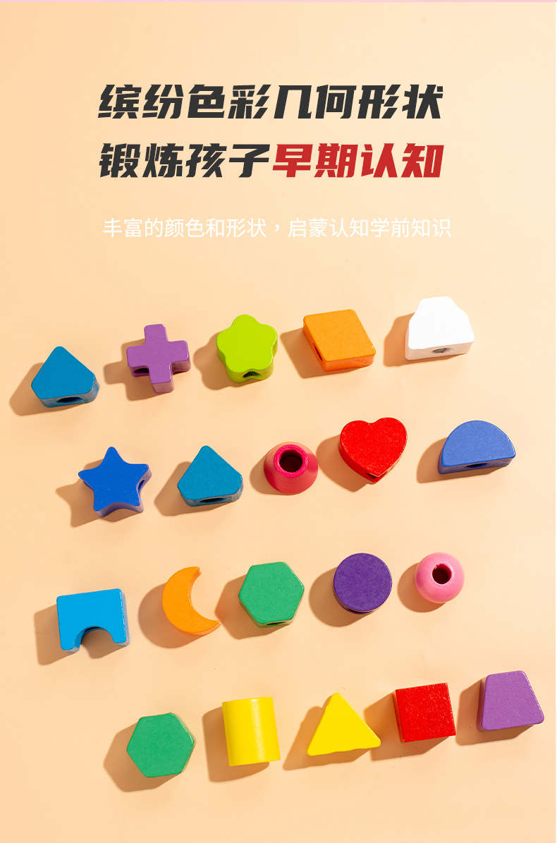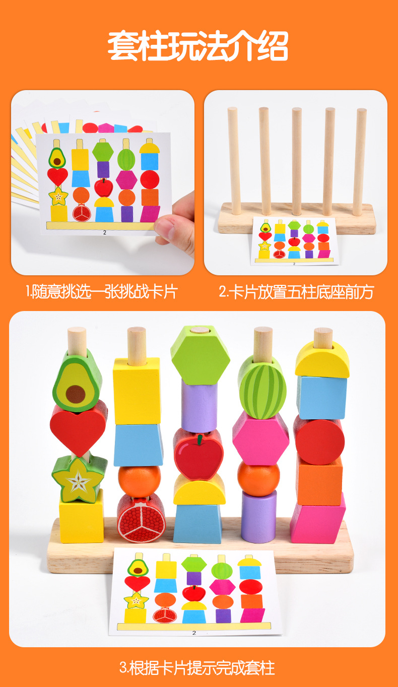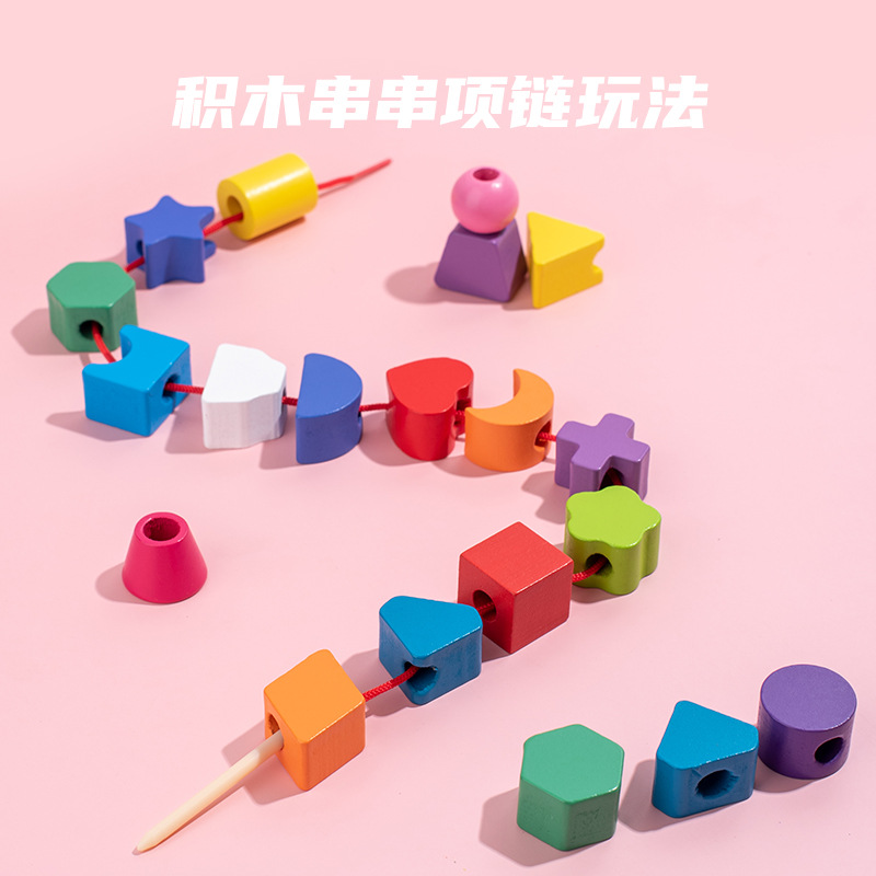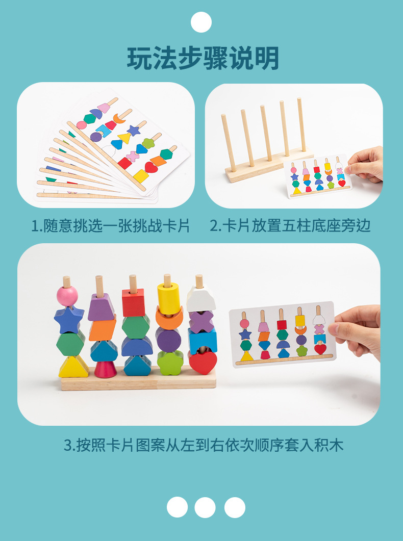 儿童木质五套柱串珠几何形状配对颜色认知启蒙早教益智积木玩具