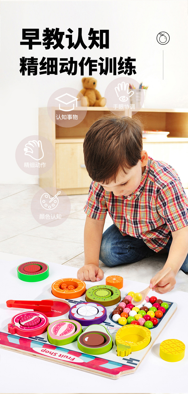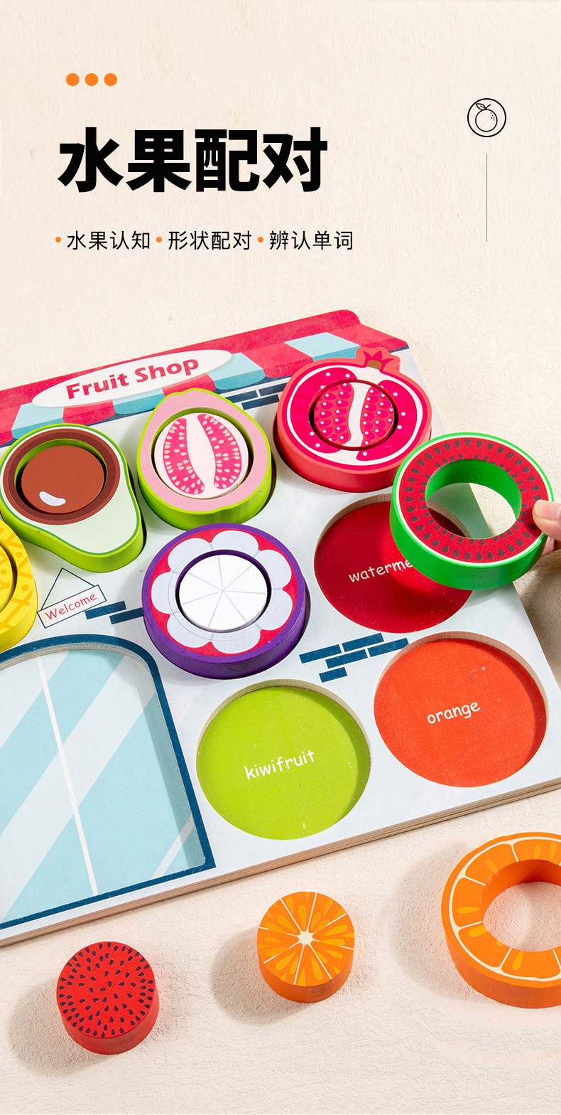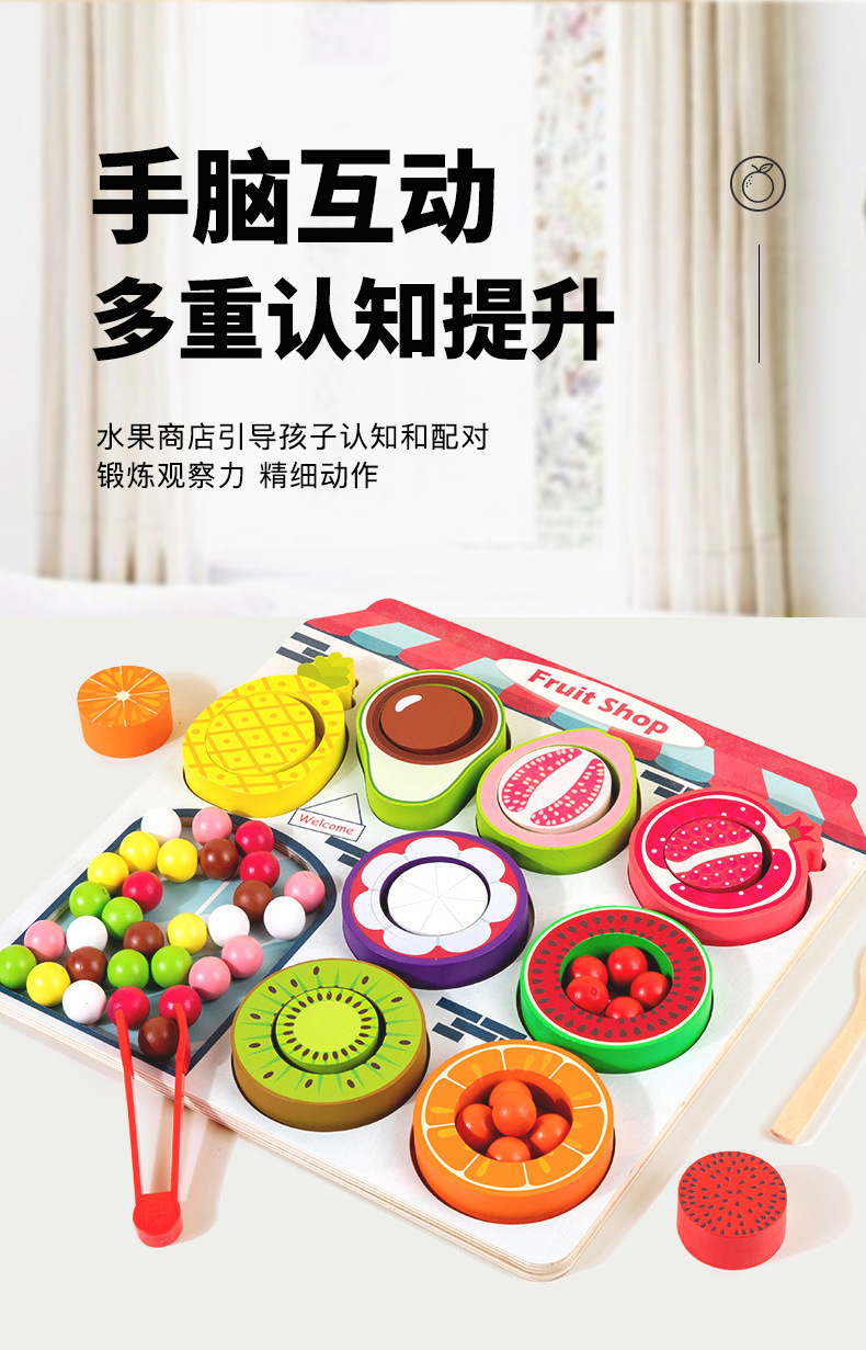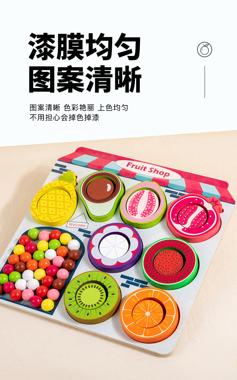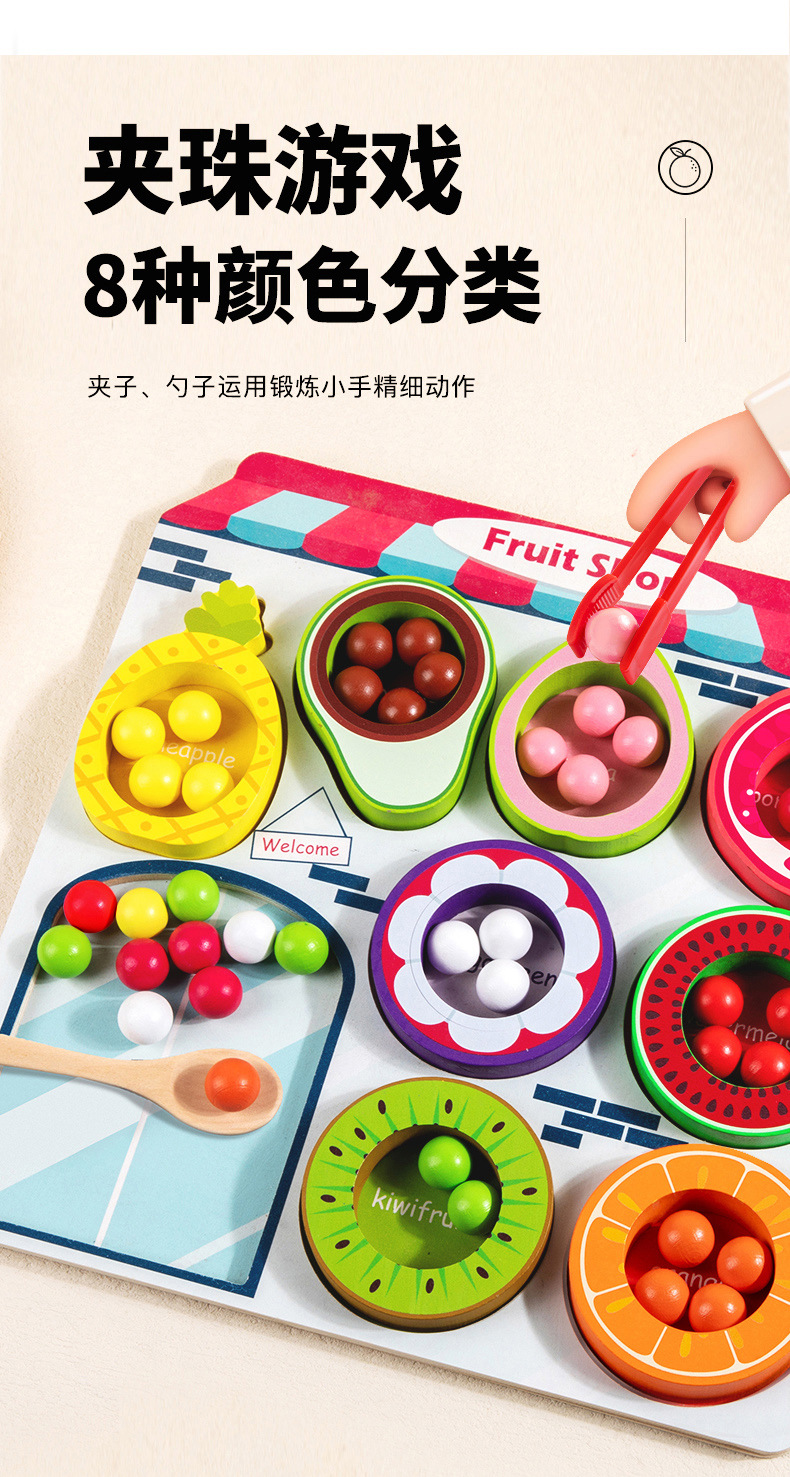 幼儿童木质水果商店夹珠子游戏颜色认知分类锻炼精细动作益智玩具