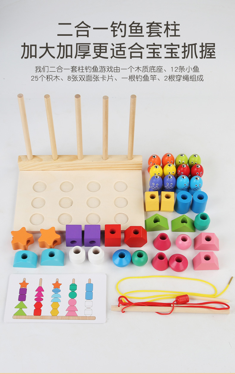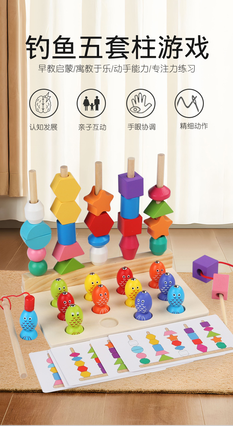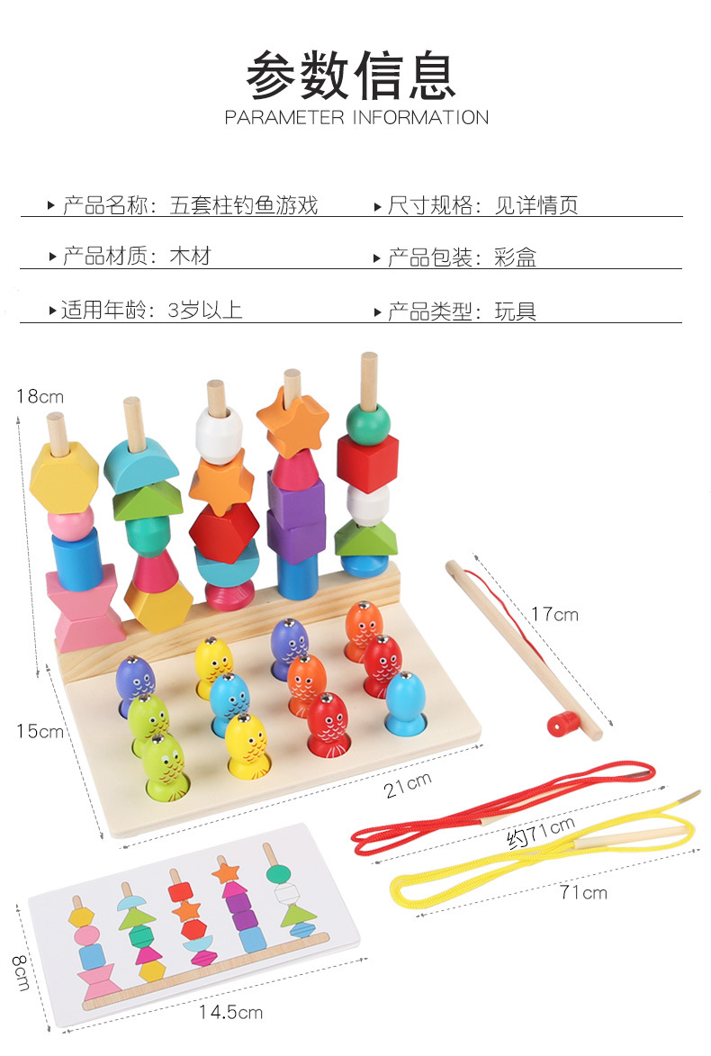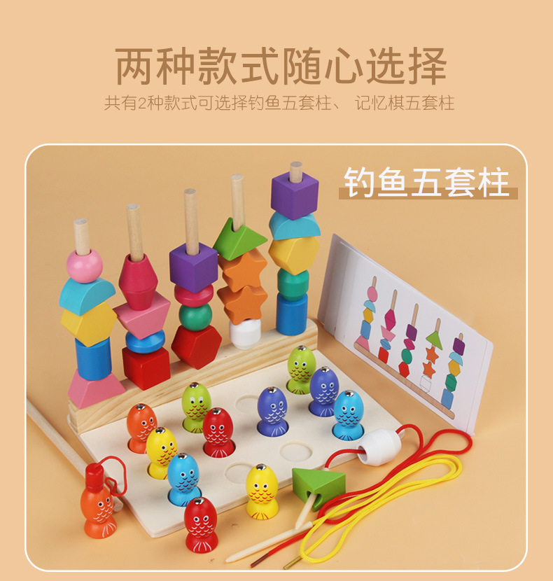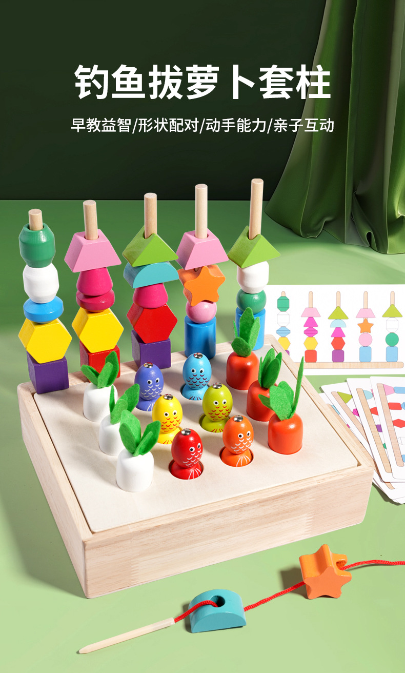 跨境木质五套柱钓鱼拔萝卜积木串珠儿童早教几何形状配对益智玩具