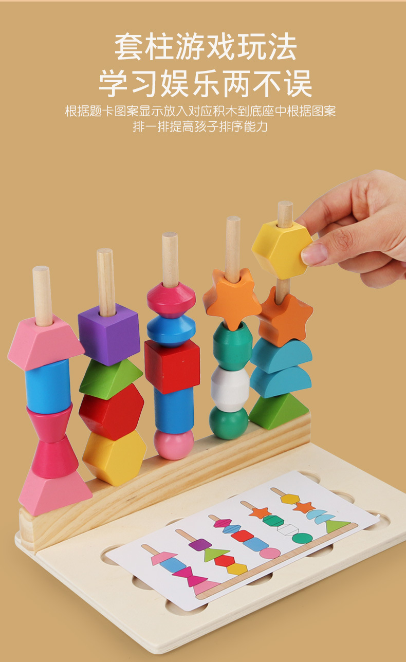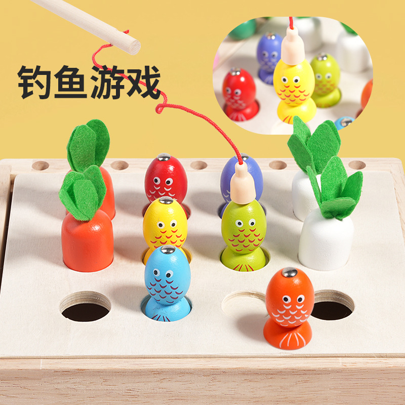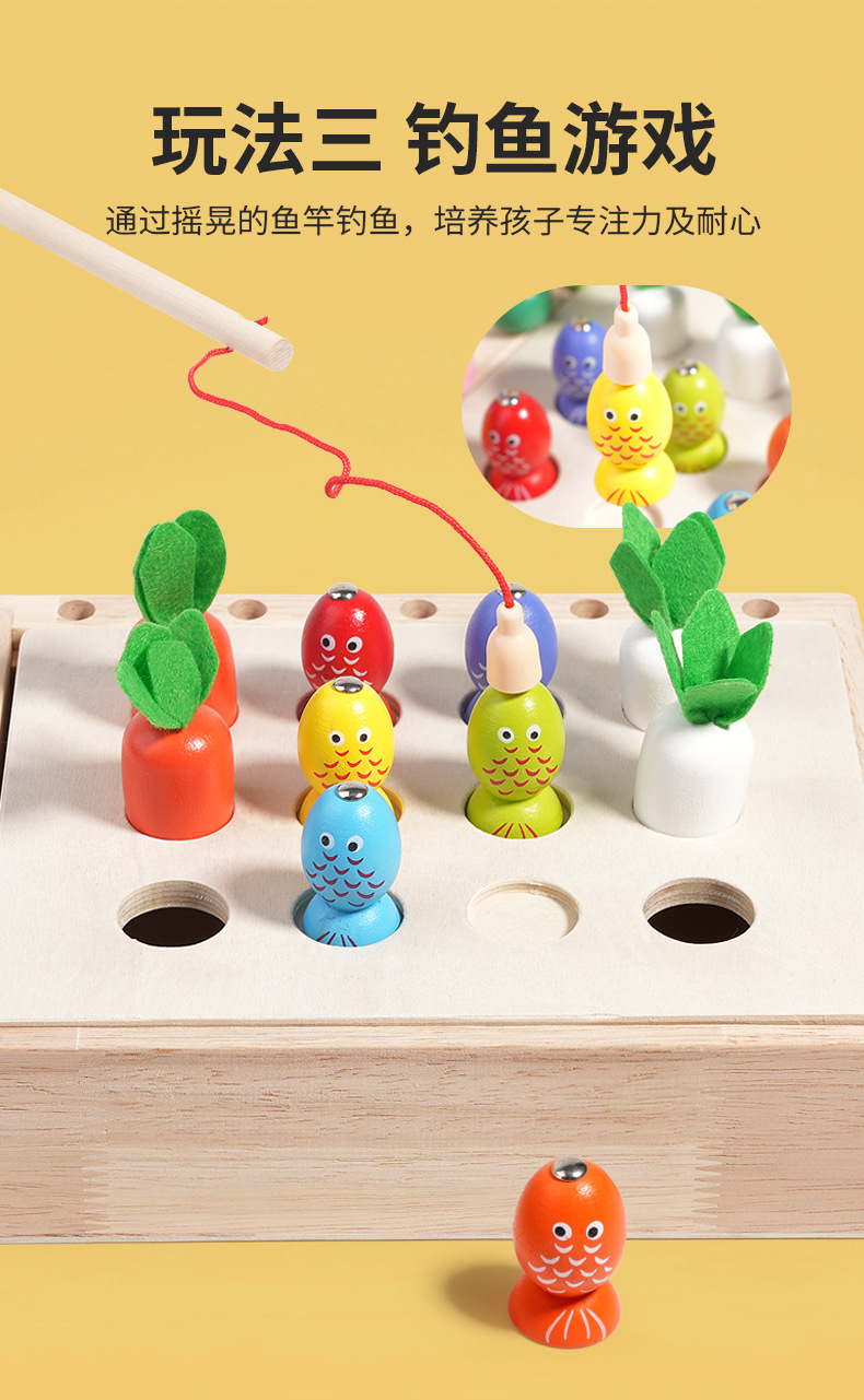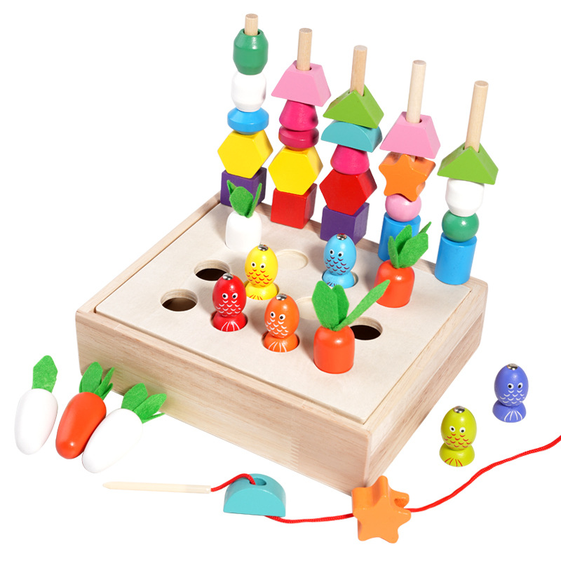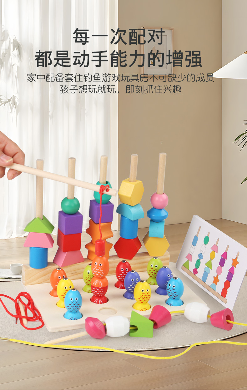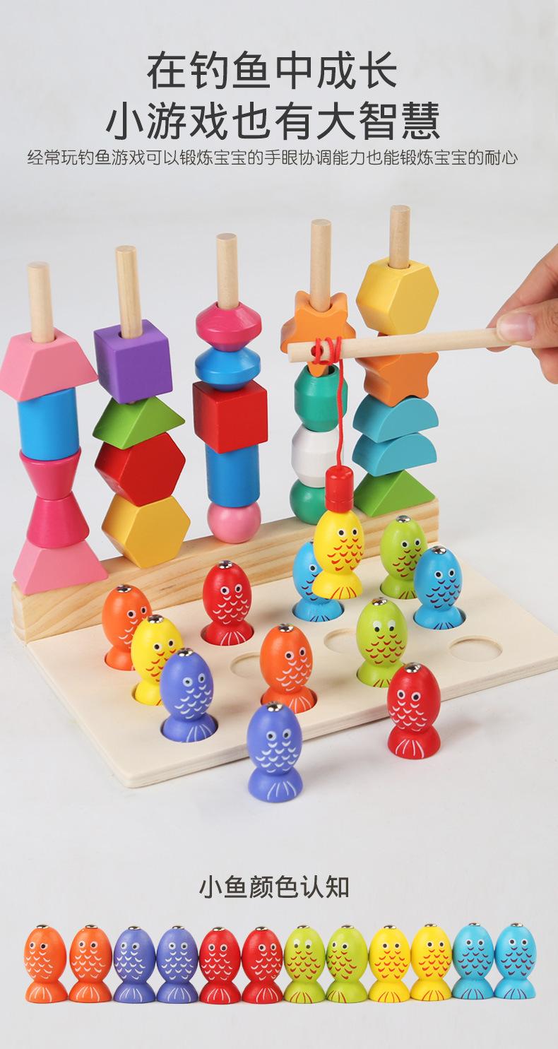 跨境木质五套柱钓鱼拔萝卜积木串珠儿童早教几何形状配对益智玩具