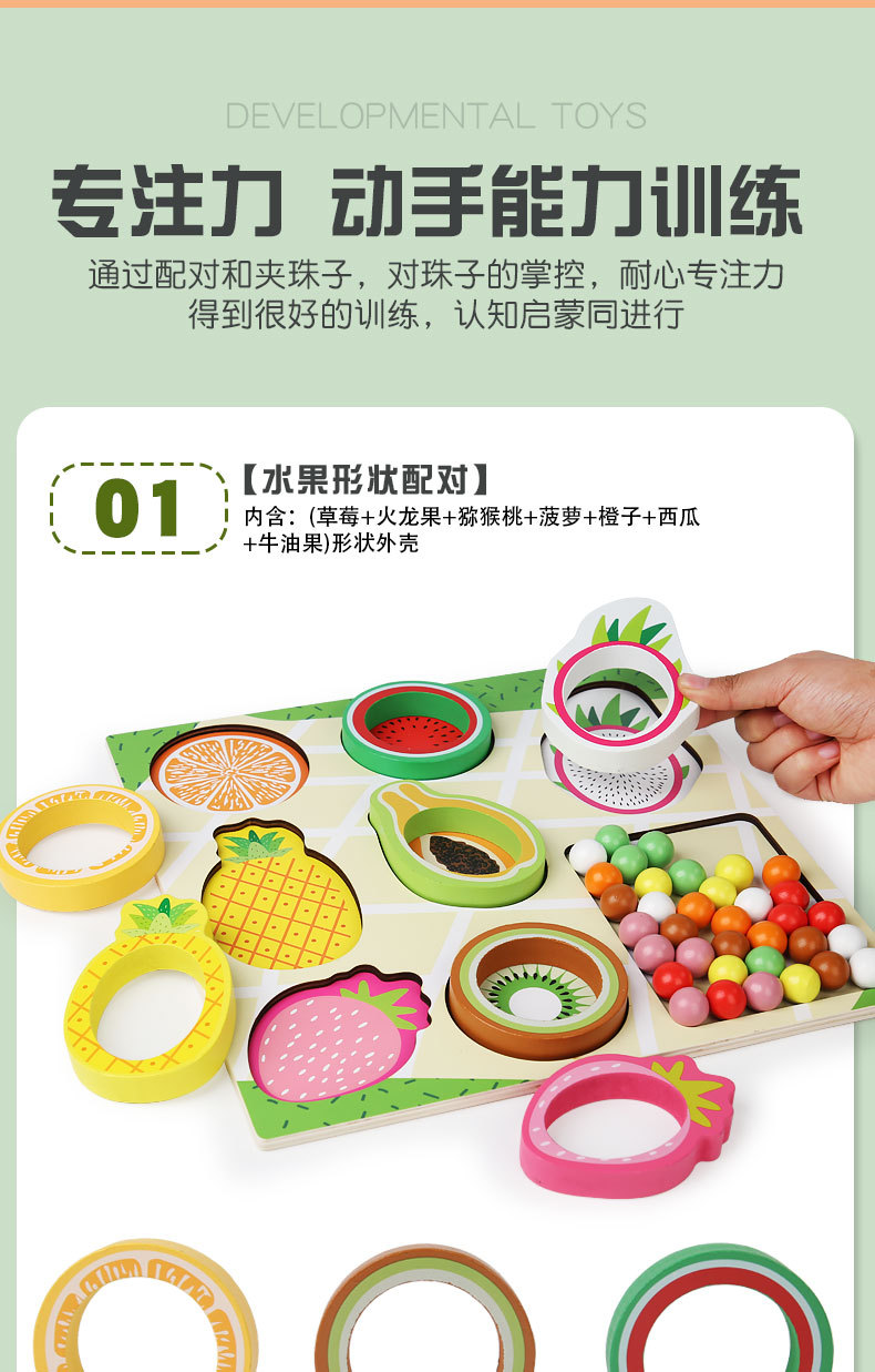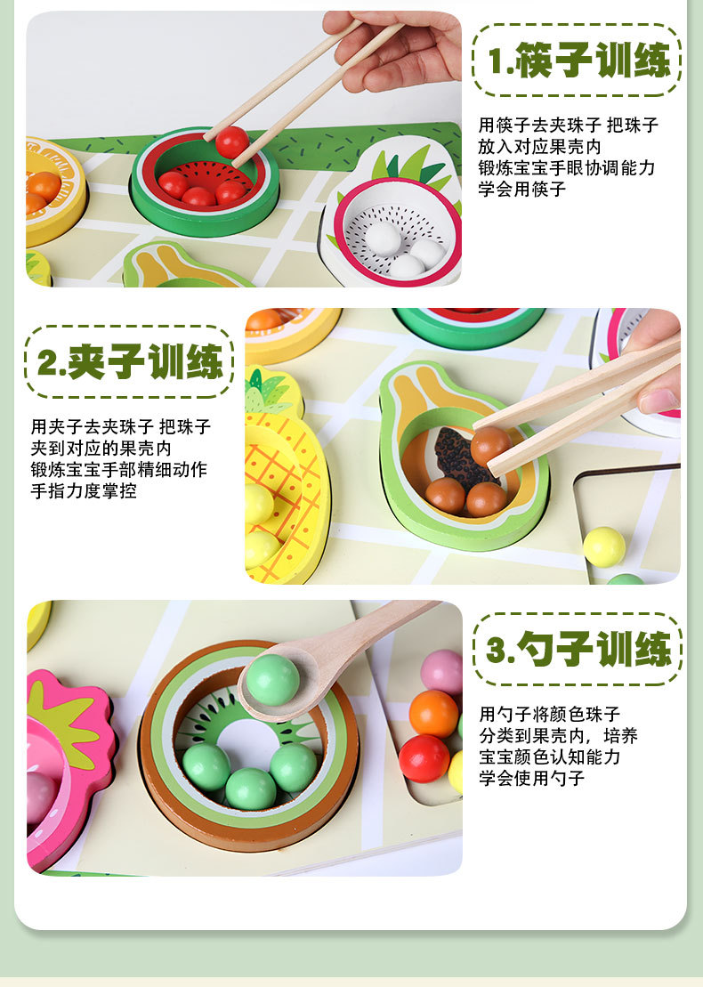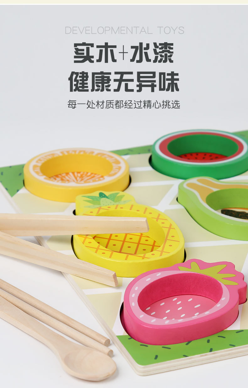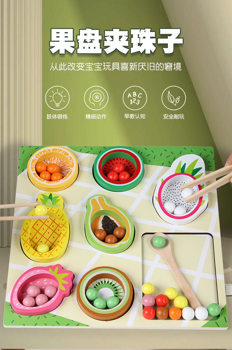 儿童早教木质水果盘夹珠子颜色认知分类配对精细动作训练益智玩具