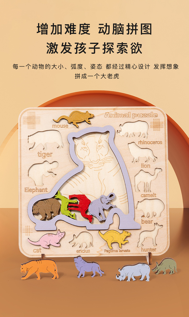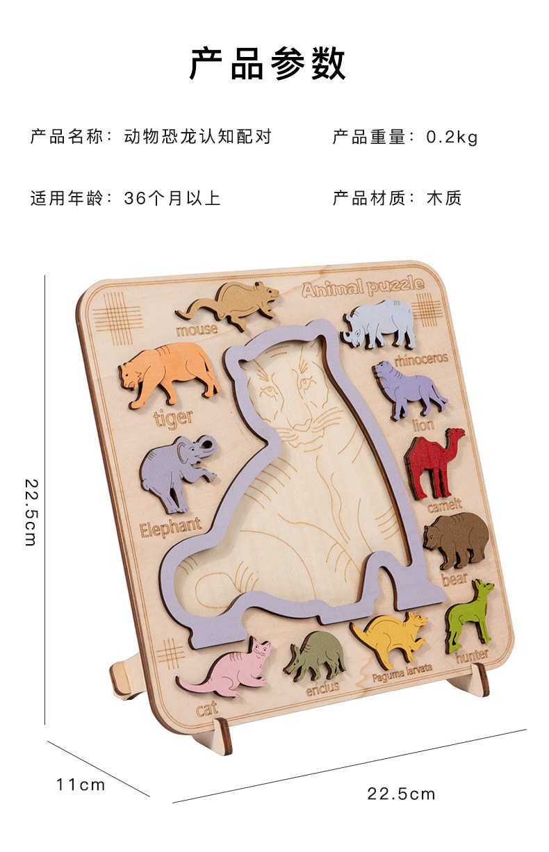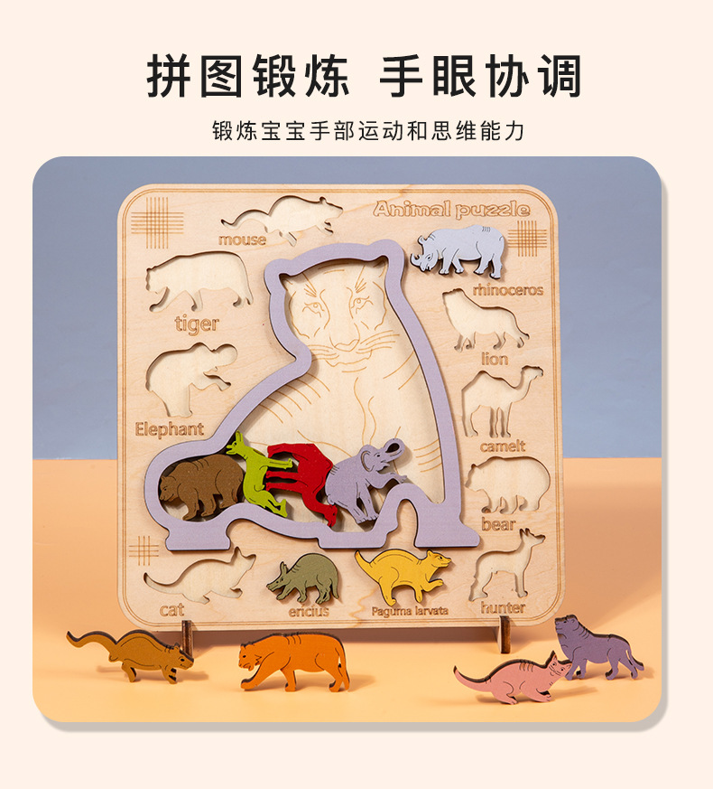 跨境儿童木质动物恐龙烧脑配对立体拼图早教认知积木拼板益智玩具