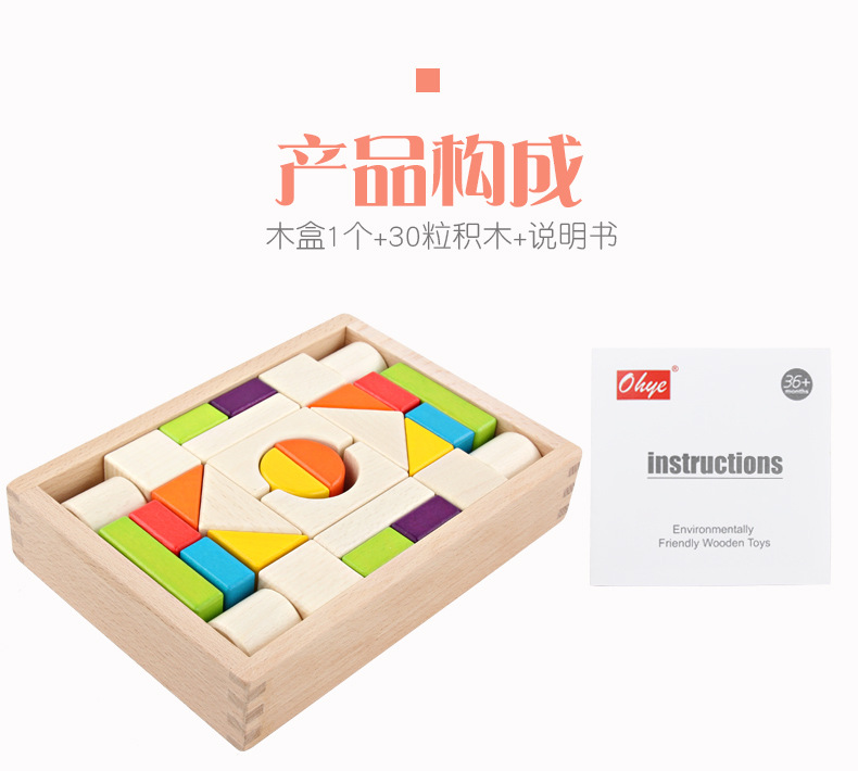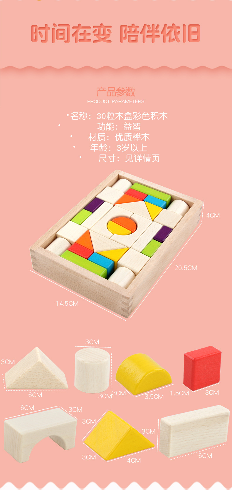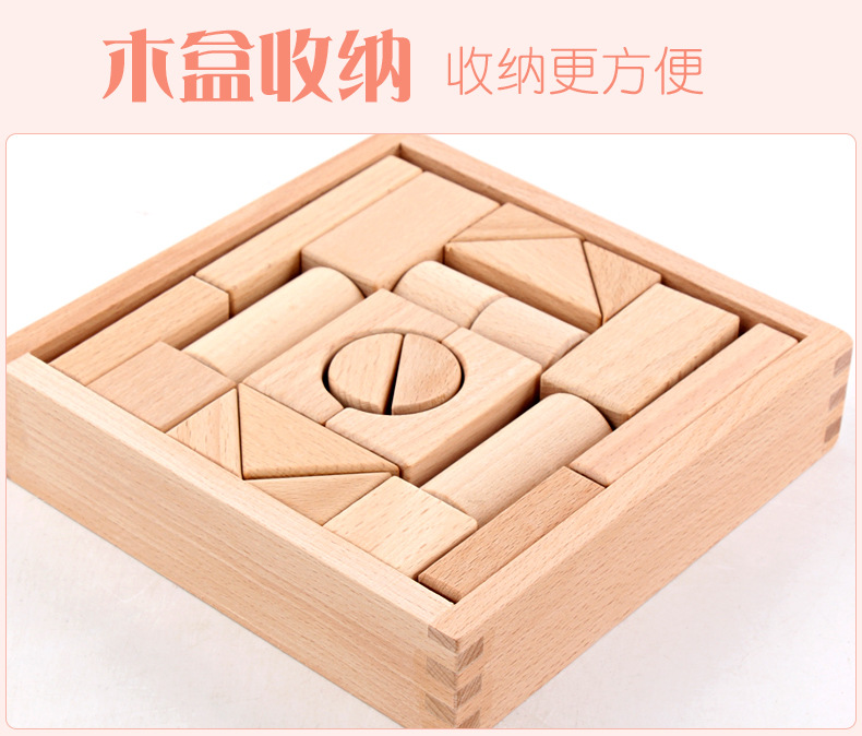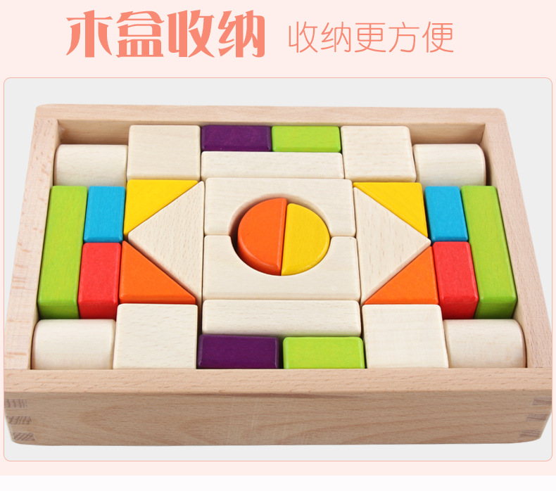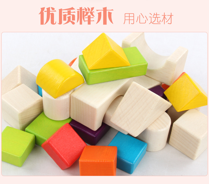 儿童木质积木宝宝早教形状认知木盒装大颗粒榉木彩色积木益智玩具
