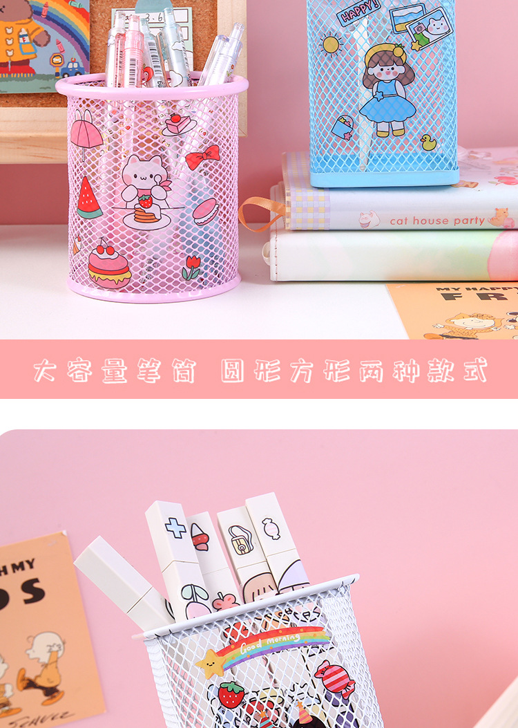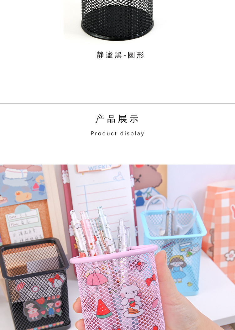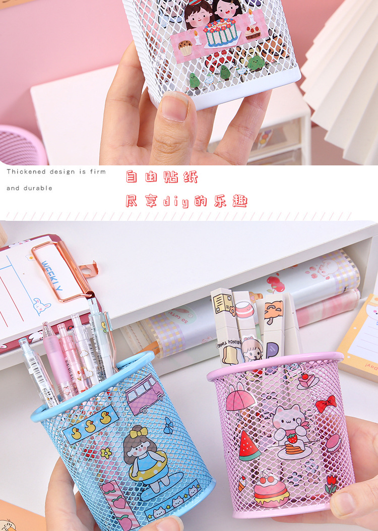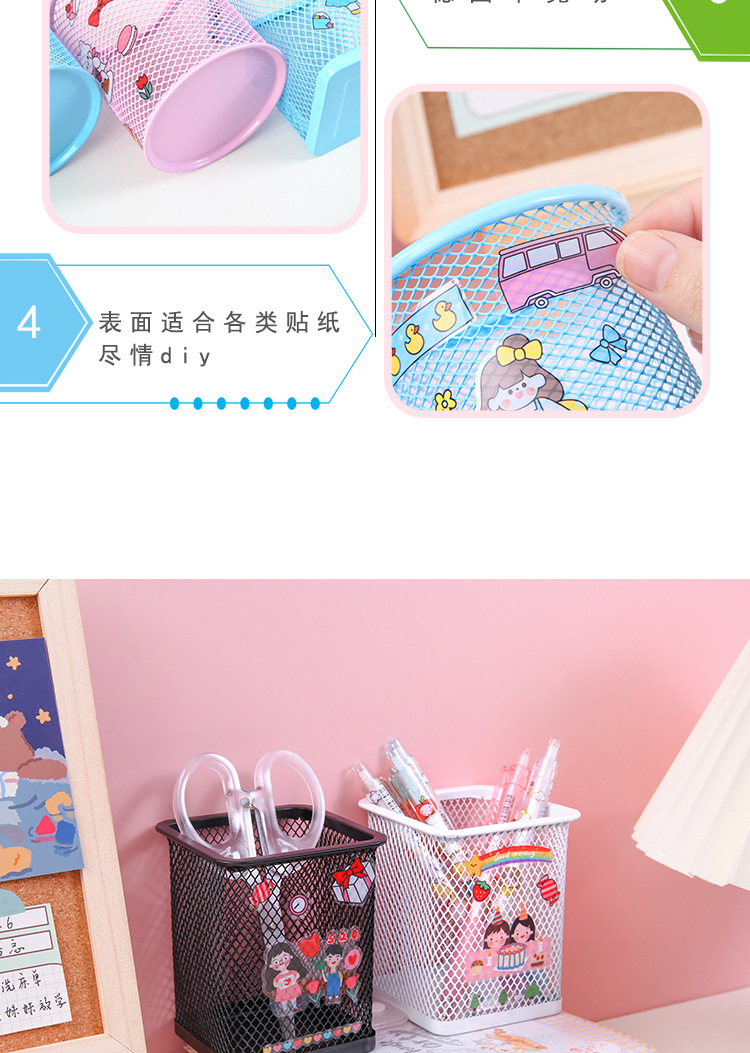 金属笔筒 创意贴纸圆形方形铁艺网格DIY文具手账贴笔桶文具收纳筒