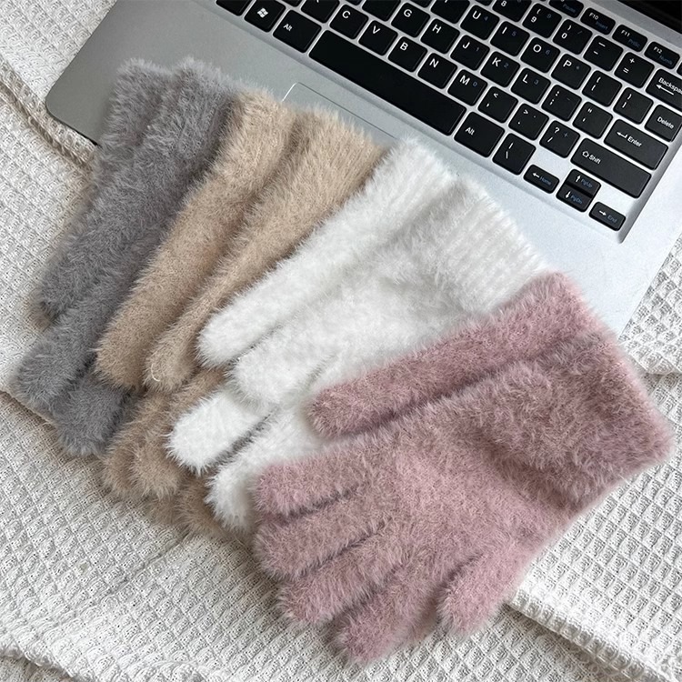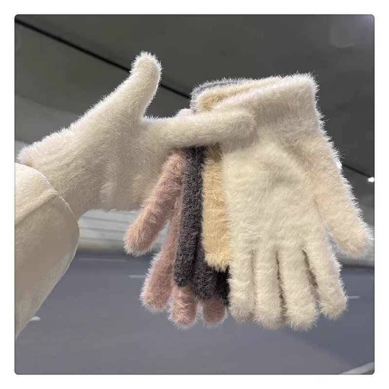 针织毛线手套女毛绒秋冬学生ins可爱韩系加绒厚保暖五指骑行手套