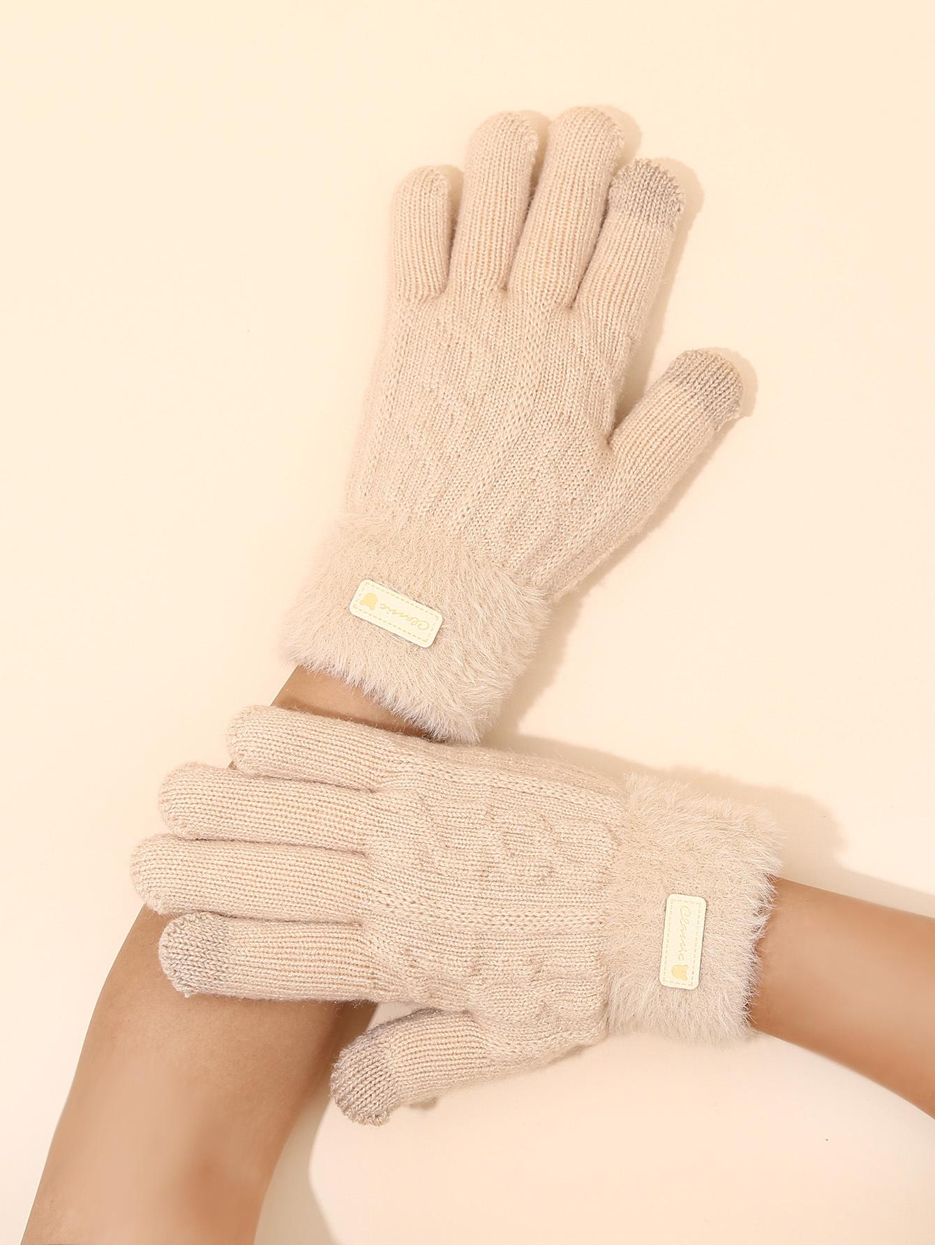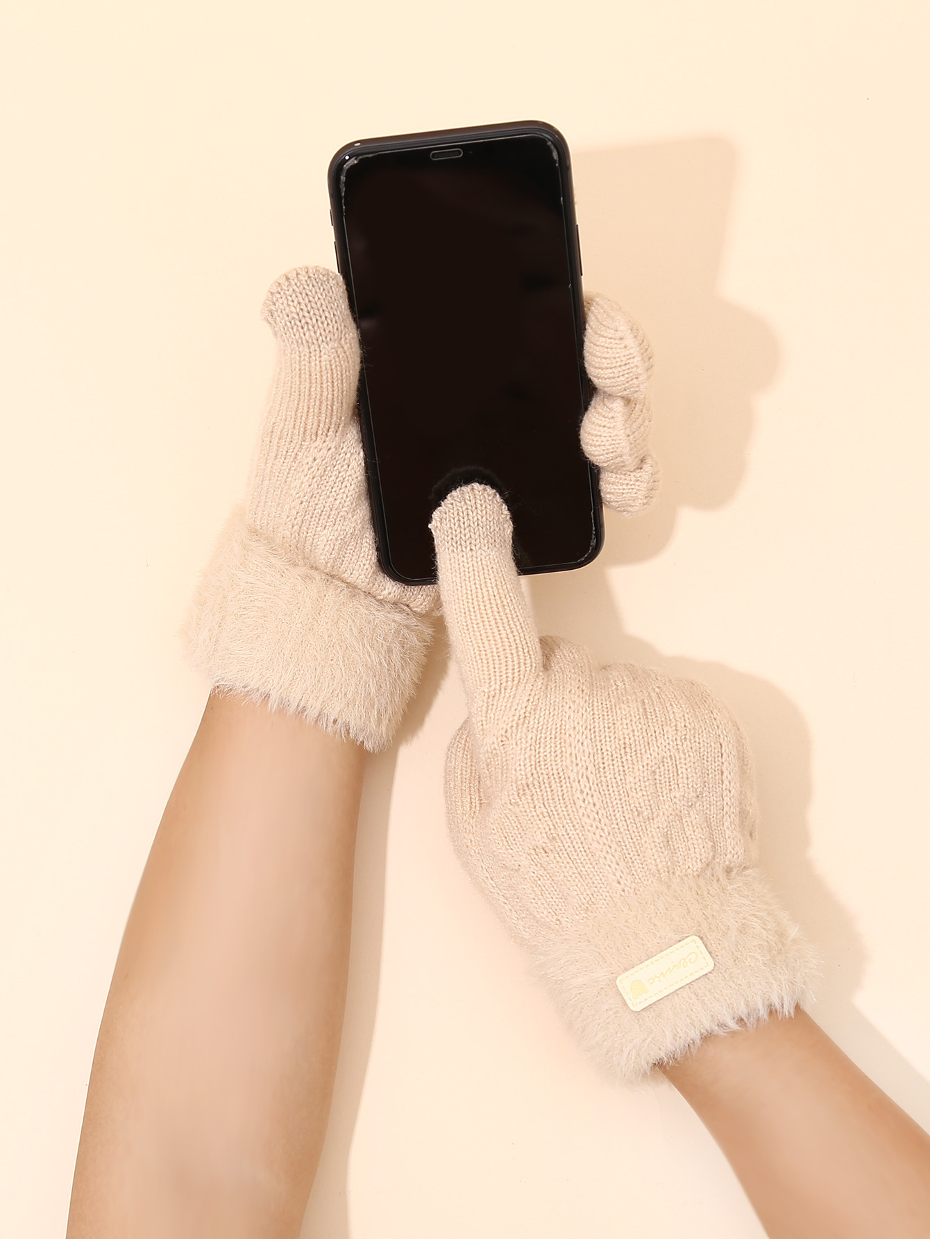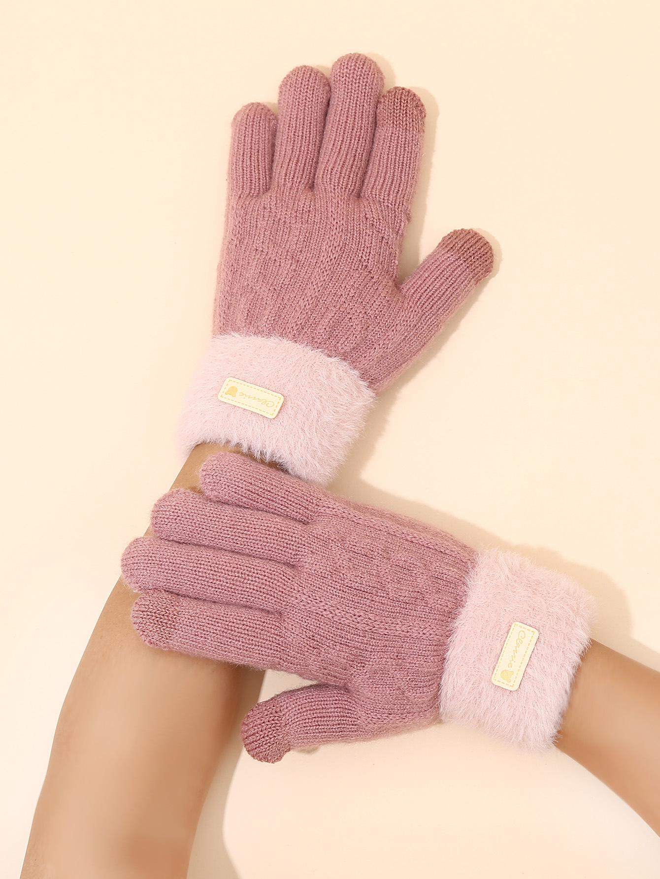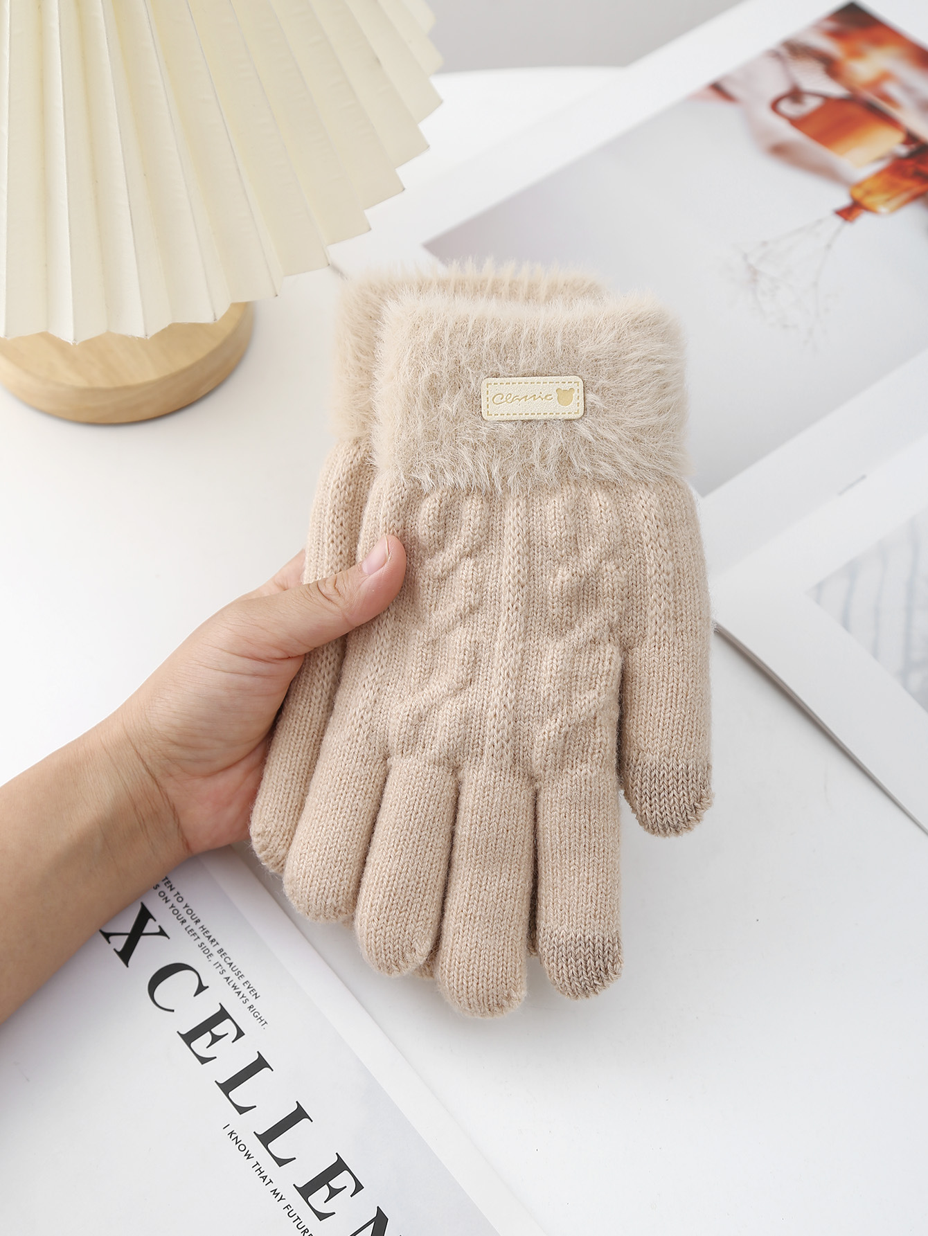 可爱拼色五指手套毛绒针织毛线女秋冬季韩版百搭加绒保暖触屏手套