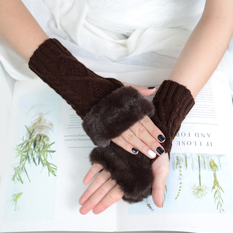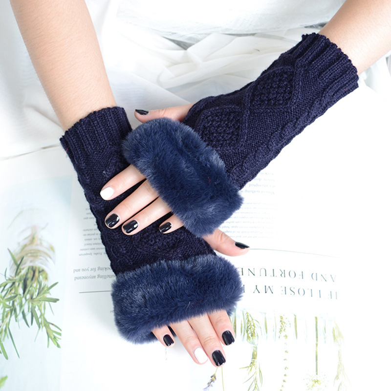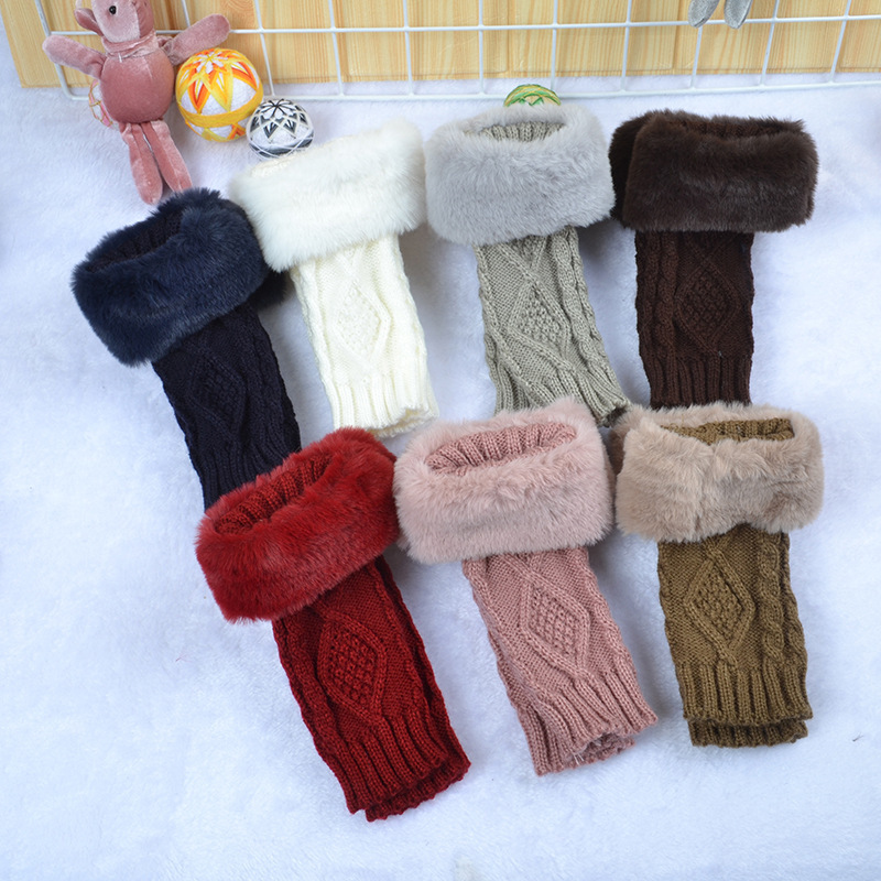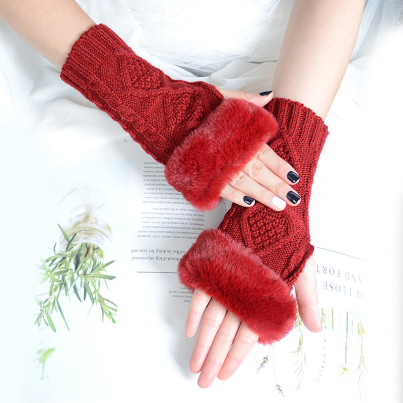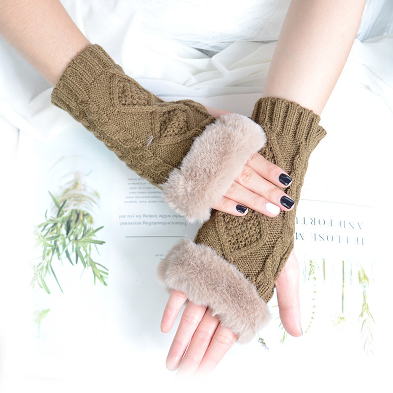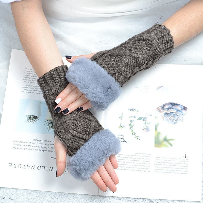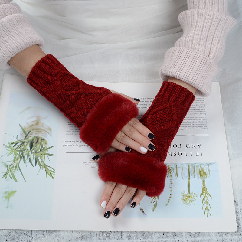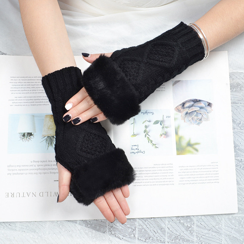 跨境新款菱形短款毛毛手套秋冬毛线手套女假袖子针织保暖露指臂套