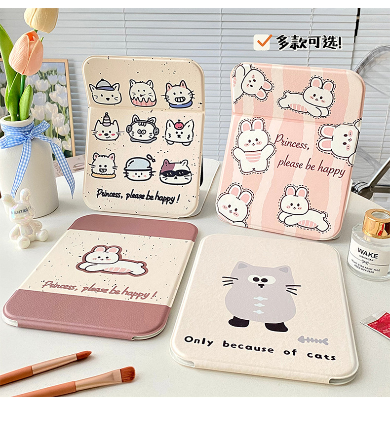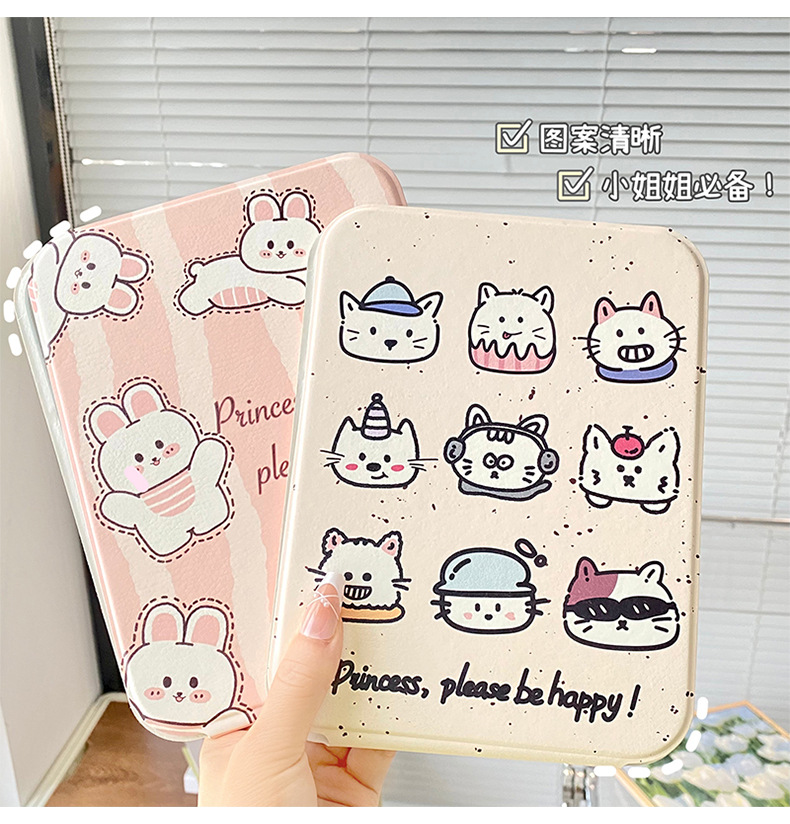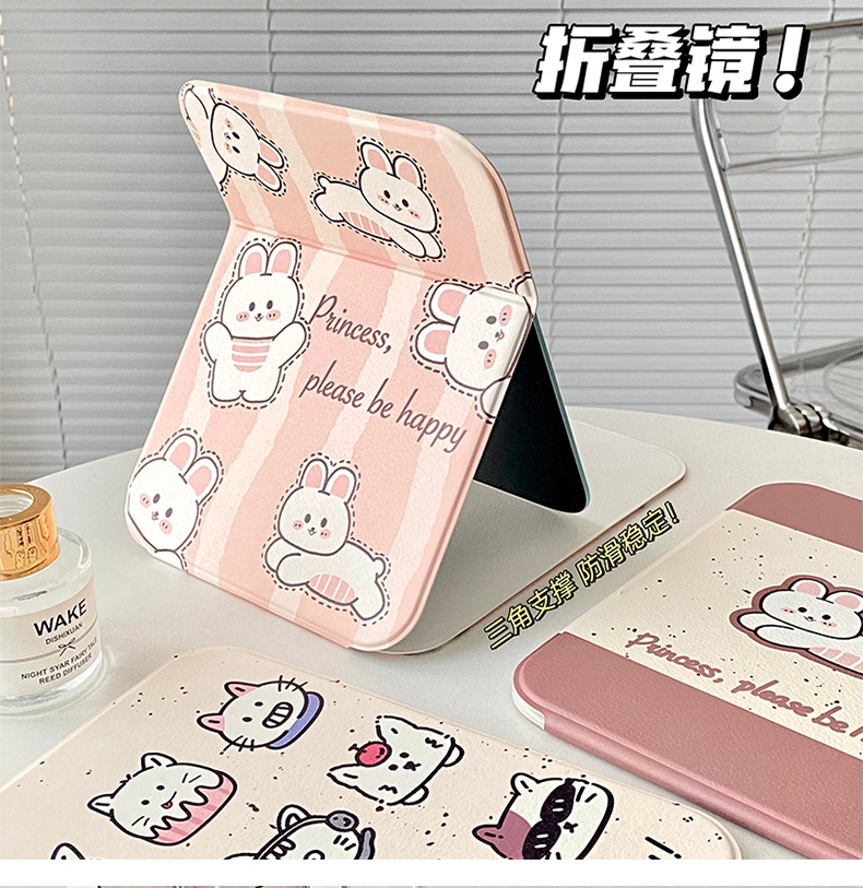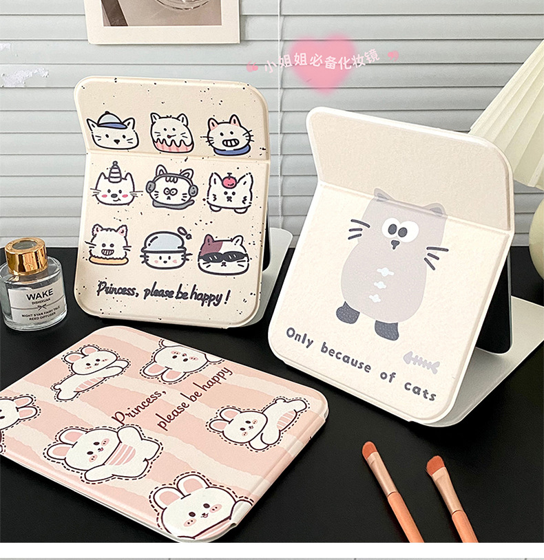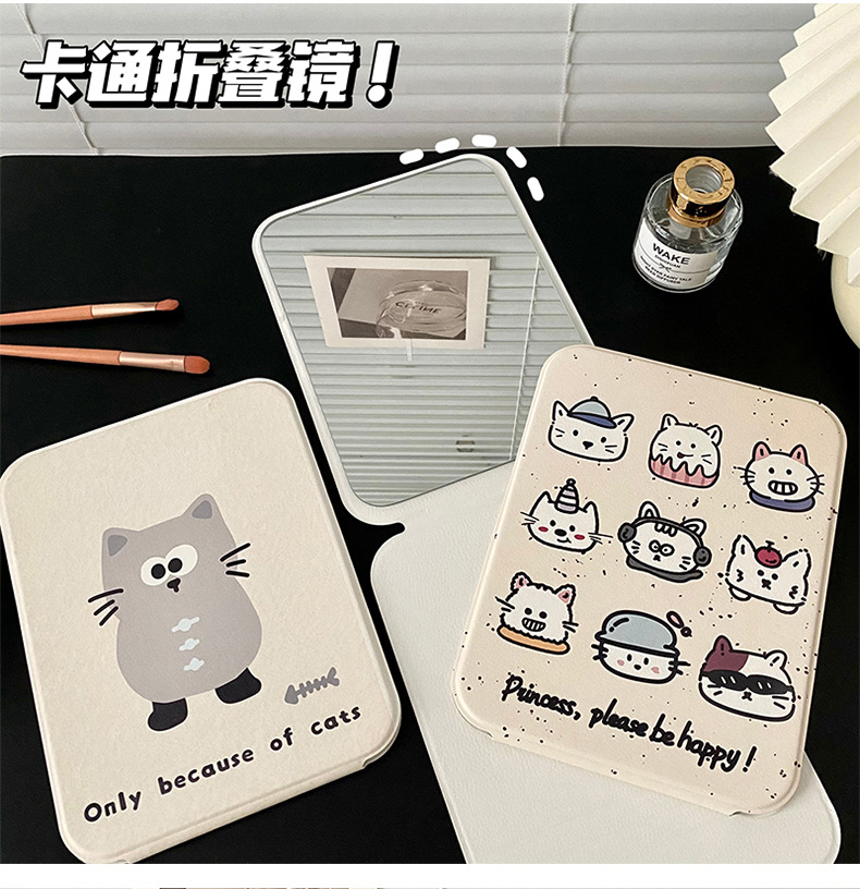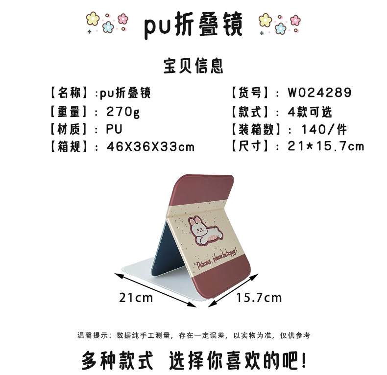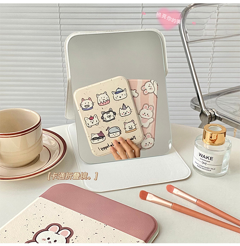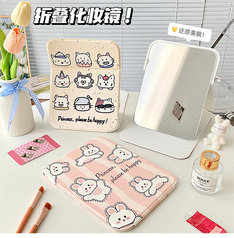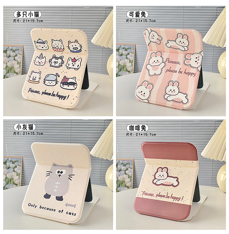 新款可爱卡通折叠镜女桌面可立化妆大号镜子少女心PU折叠镜子批发