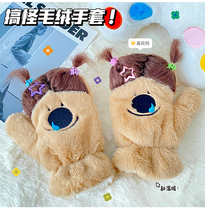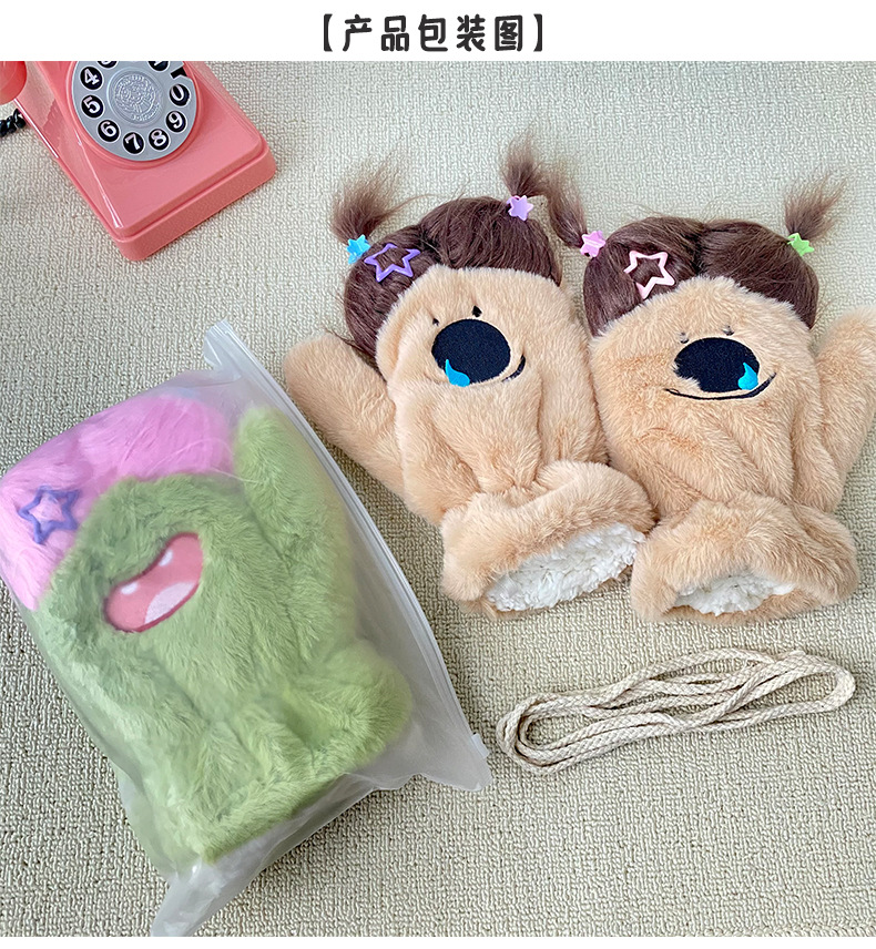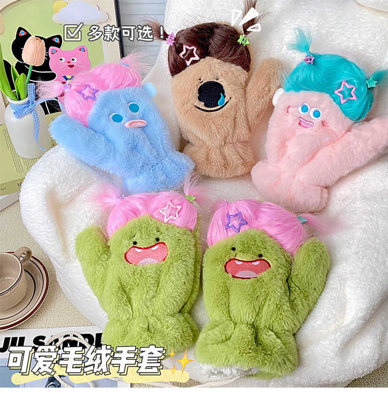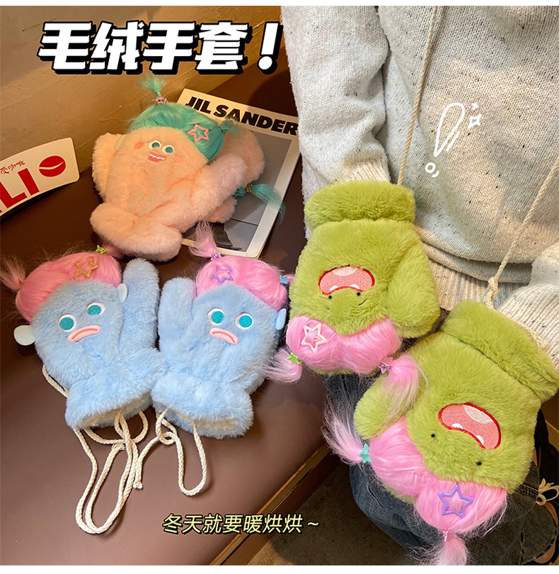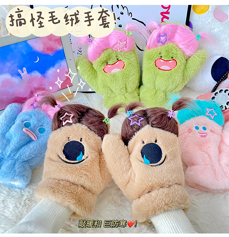 ins风卡通可爱糖果色五指手套搞怪丑娃珊瑚绒冬款保暖骑行手套女